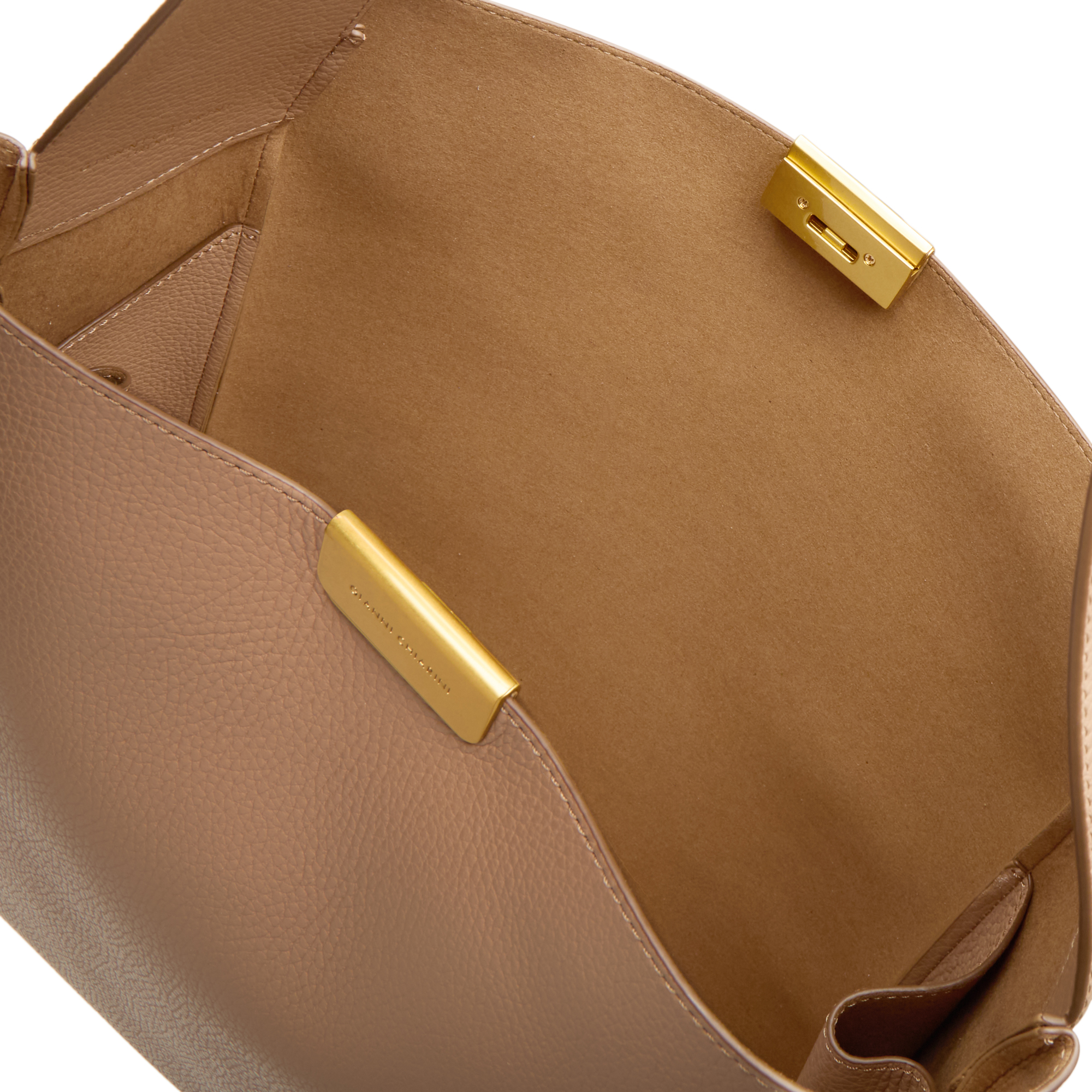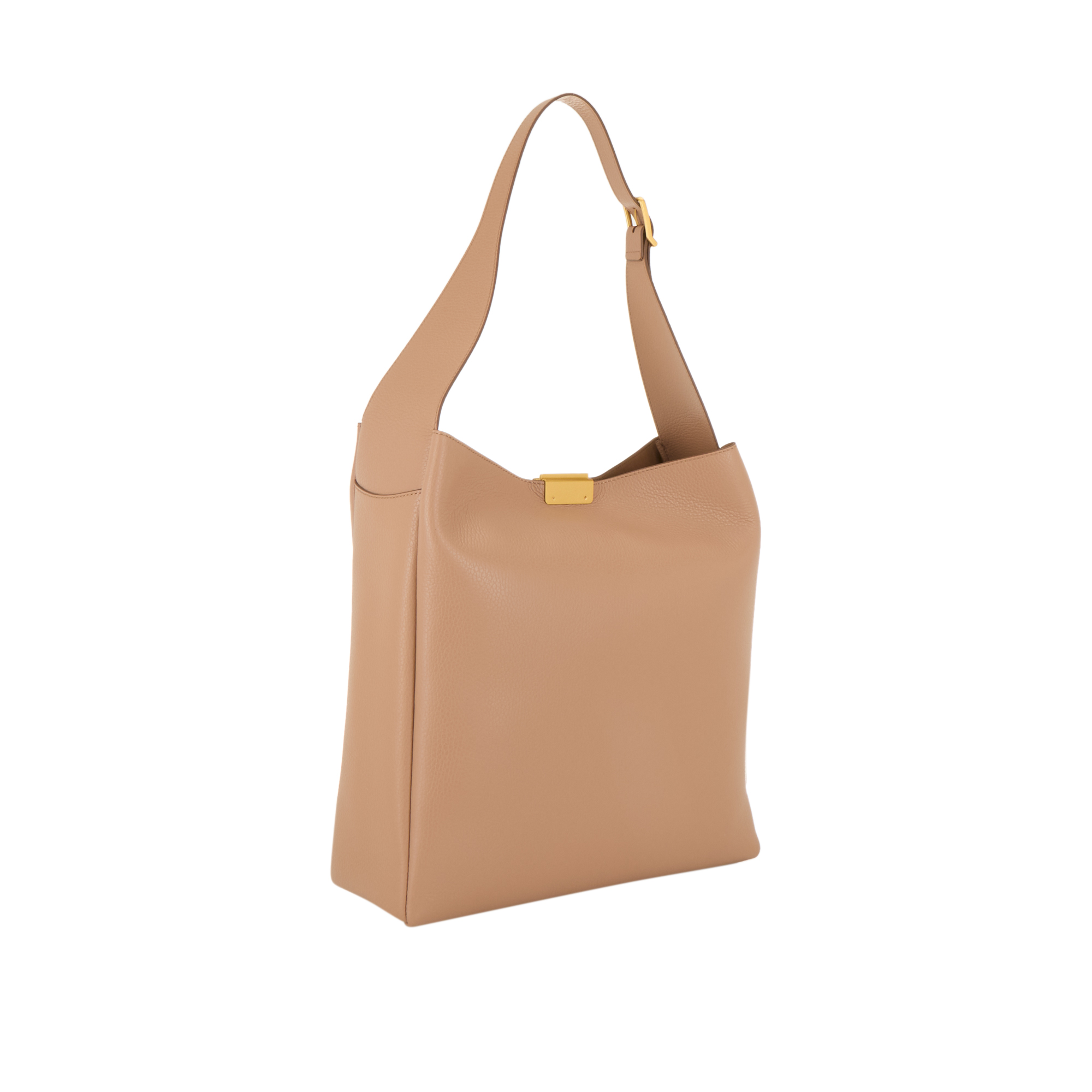 - Adjustable shoulder strap, hardware clasp fastening with engraved logo detailing, gold-tone finishes, grained finish, tonal stitching