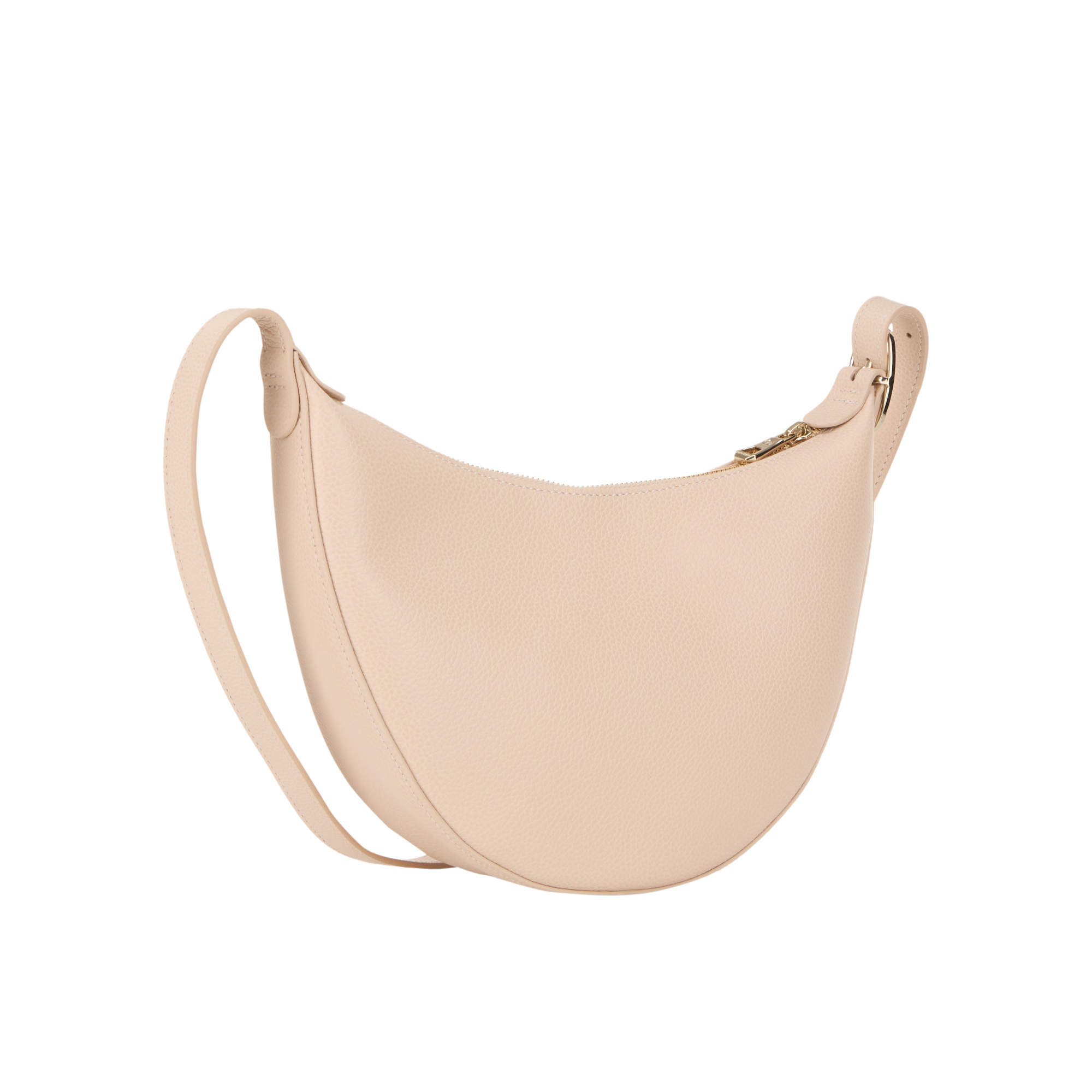 - Half moon shape, zip fastening, adjustable strap, logo detail