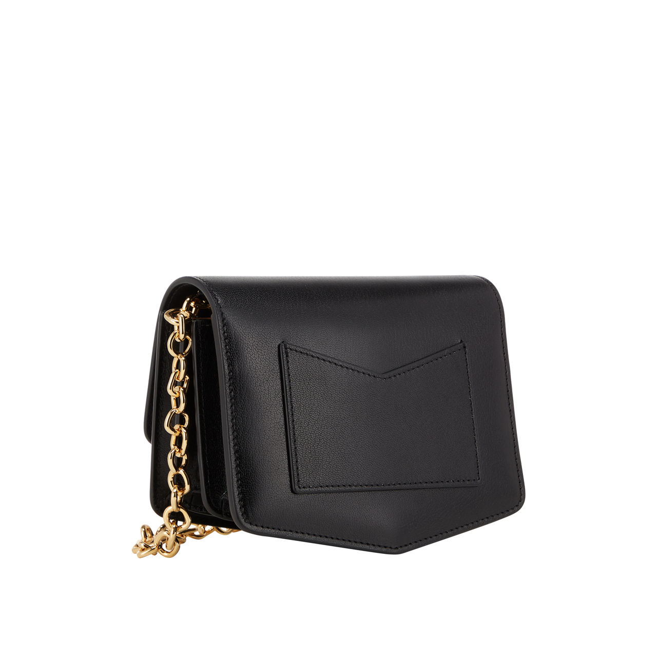 - Chain shoulder strap, three internal compartments, smooth leather, snap fastening, gold-tone hardware, external slip pocket