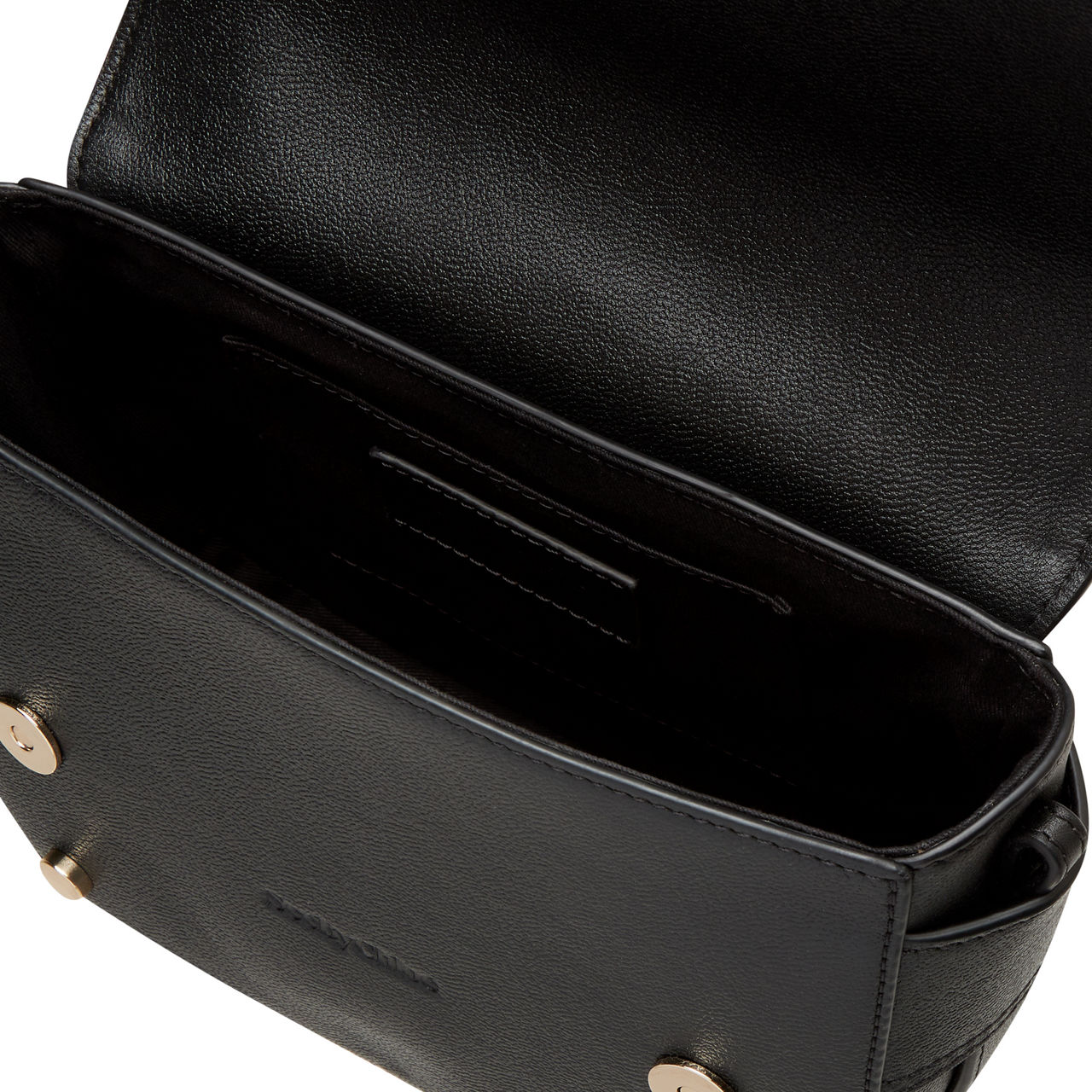 - Flap closure, gold-toned hardware, hoop detail, detachable strap, studs, grained finish.