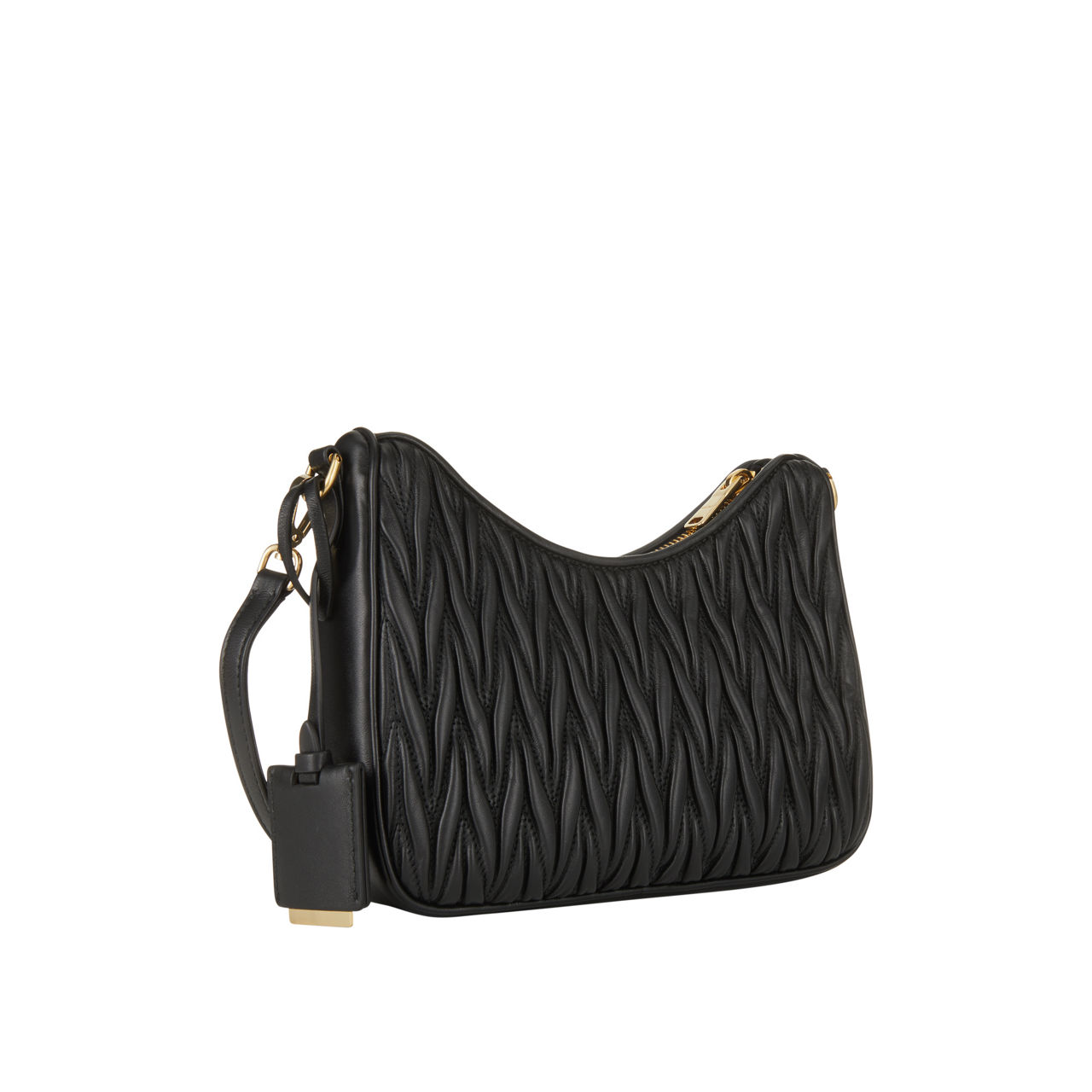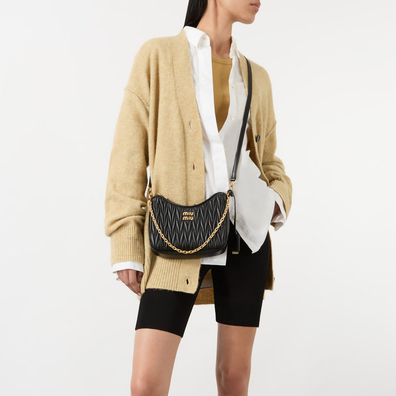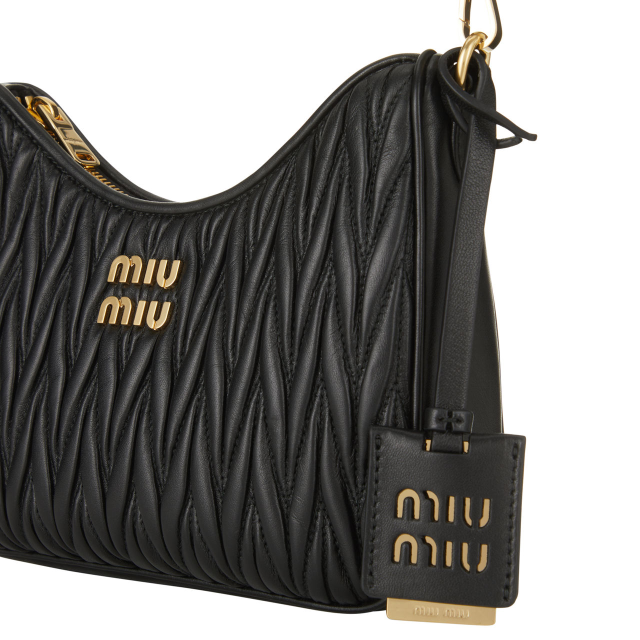 Prada's sister brand Miu Miu put their stamp on the Matelassé crossbody bag with their signature logo in gold-tone hardware decorating the front. Made from Nappa leather and crafted to a structured shape, it's etched with a distinct crinkled pattern all over and is fitted with a sleek chain and leather logo tag.