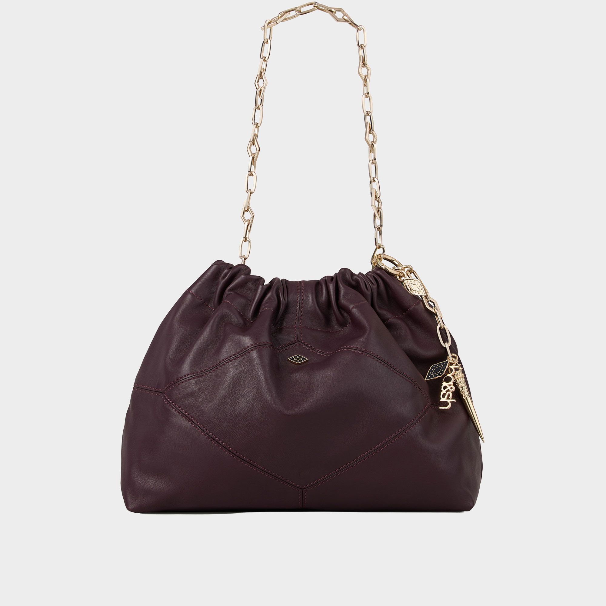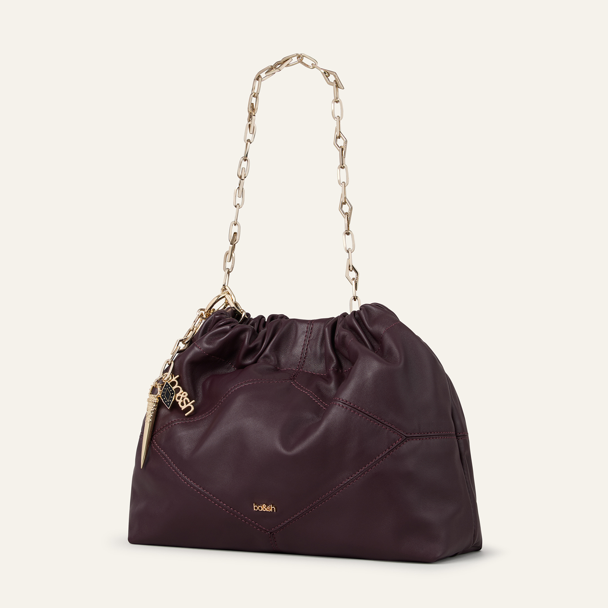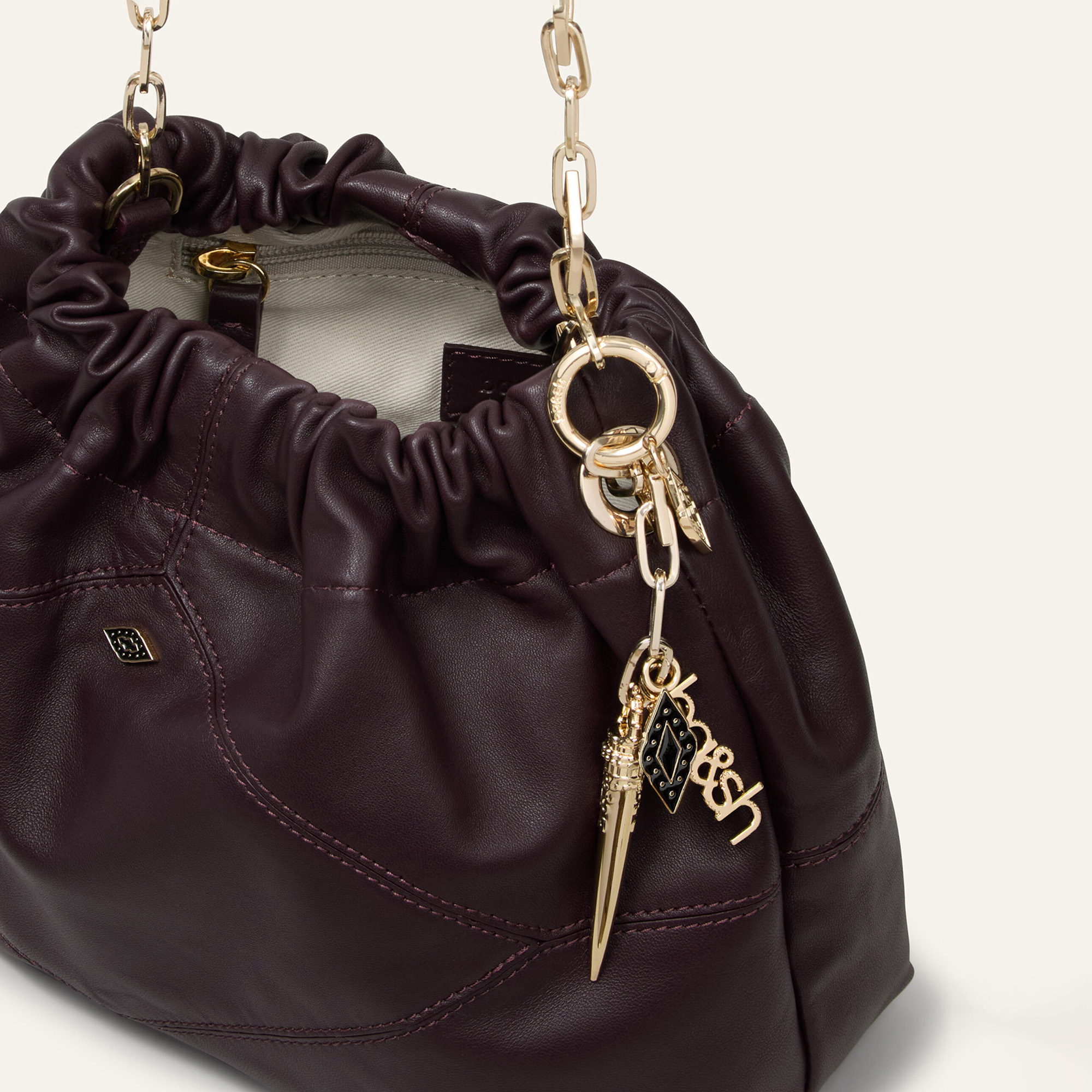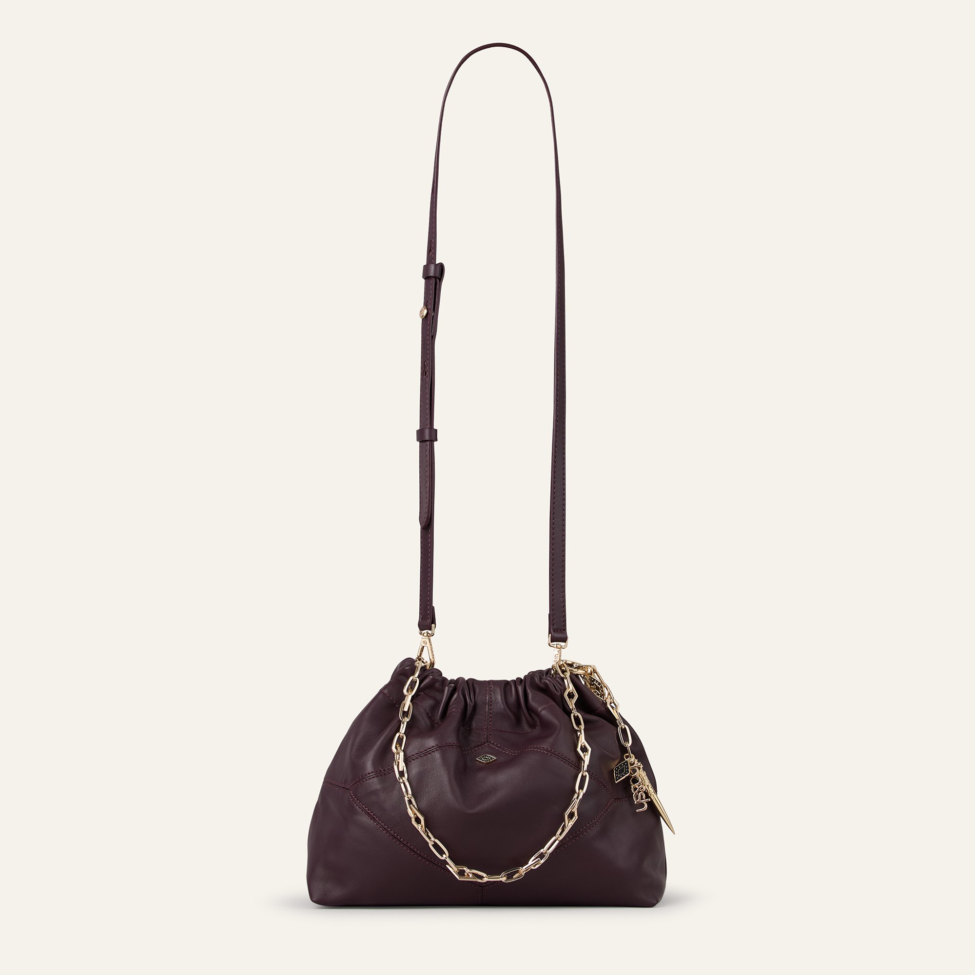 • Mini design, gathering details, gold-tone chain with charms, adjustable leather shoulder strap, diamond-shaped signature detailing