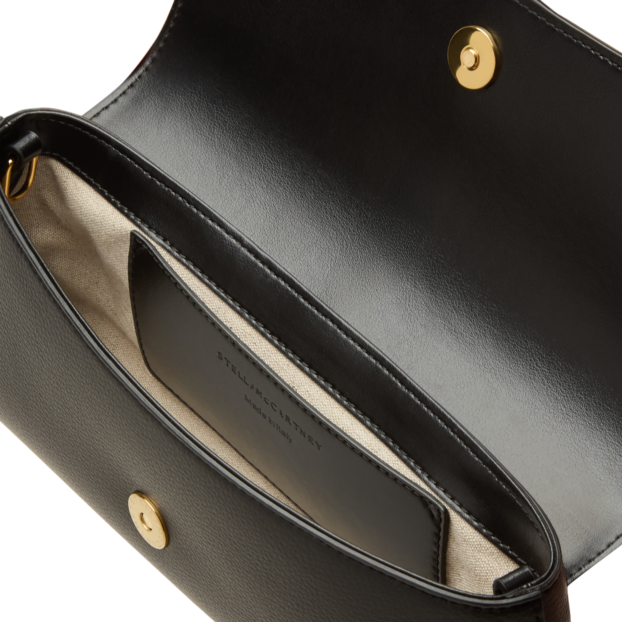 • Flap closure with magnetic snap fastening, engraved lock hardware, detachable strap, gold-tone finishes, tonal stitching, smooth design