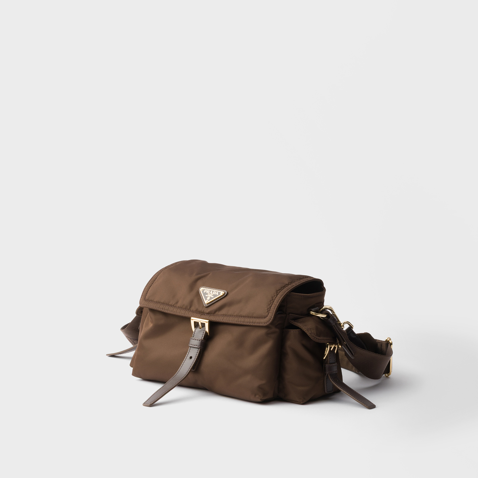 - Zip fastening, padded tape handle, detachable and adjustable woven logo strap, one front zip pocket, two side flap pockets, gold-tone metal hardware, enamelled triangle logo, smooth finish