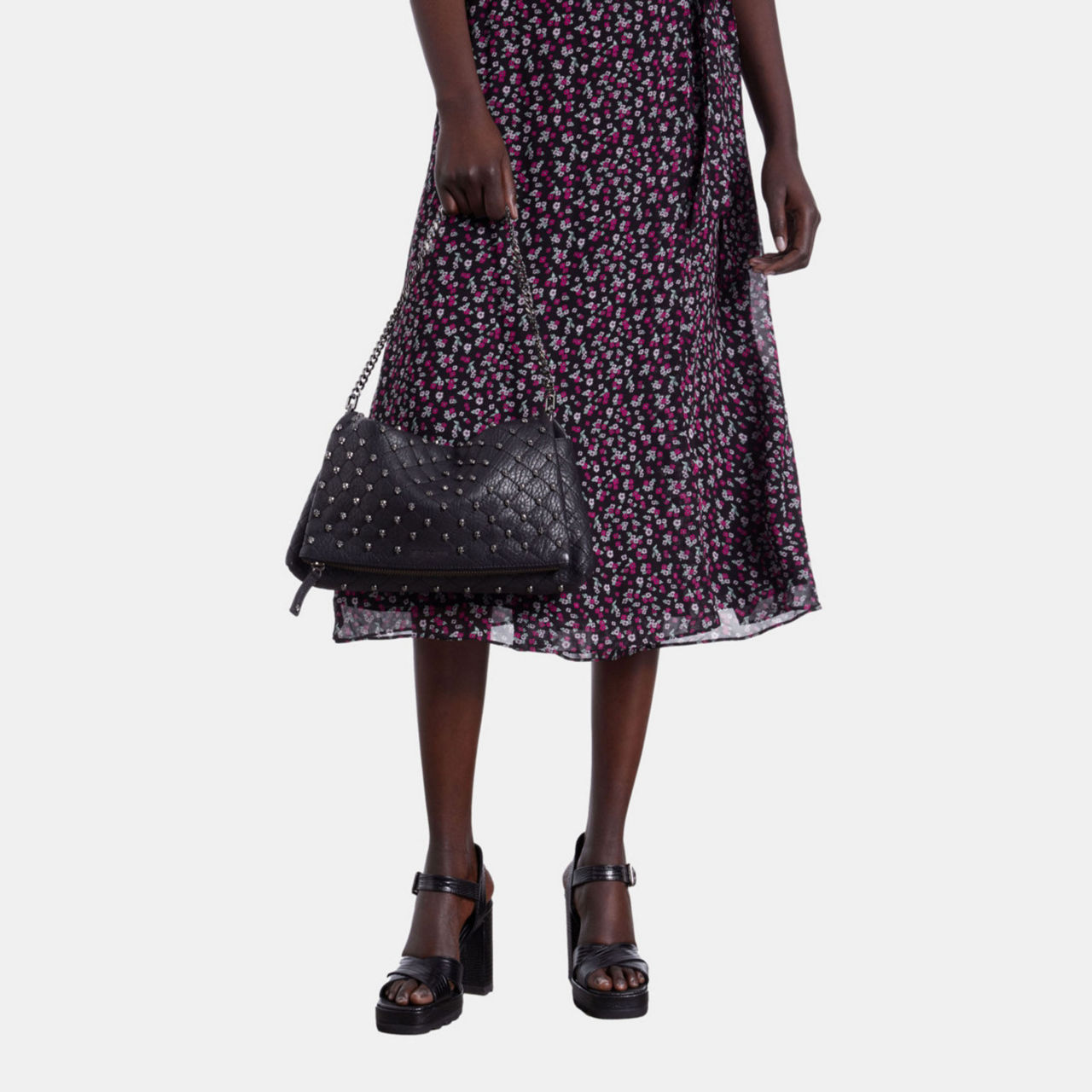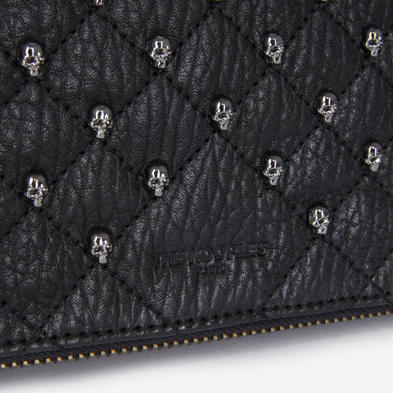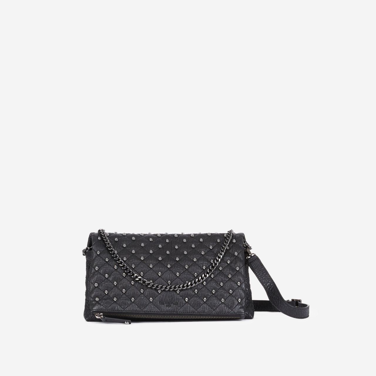 - Bubble leather quilted finish, gunmetal metalwork, adjustable and removable shoulder strap, removable chain, flap zipped closure, brand logo details, skull stud detailing