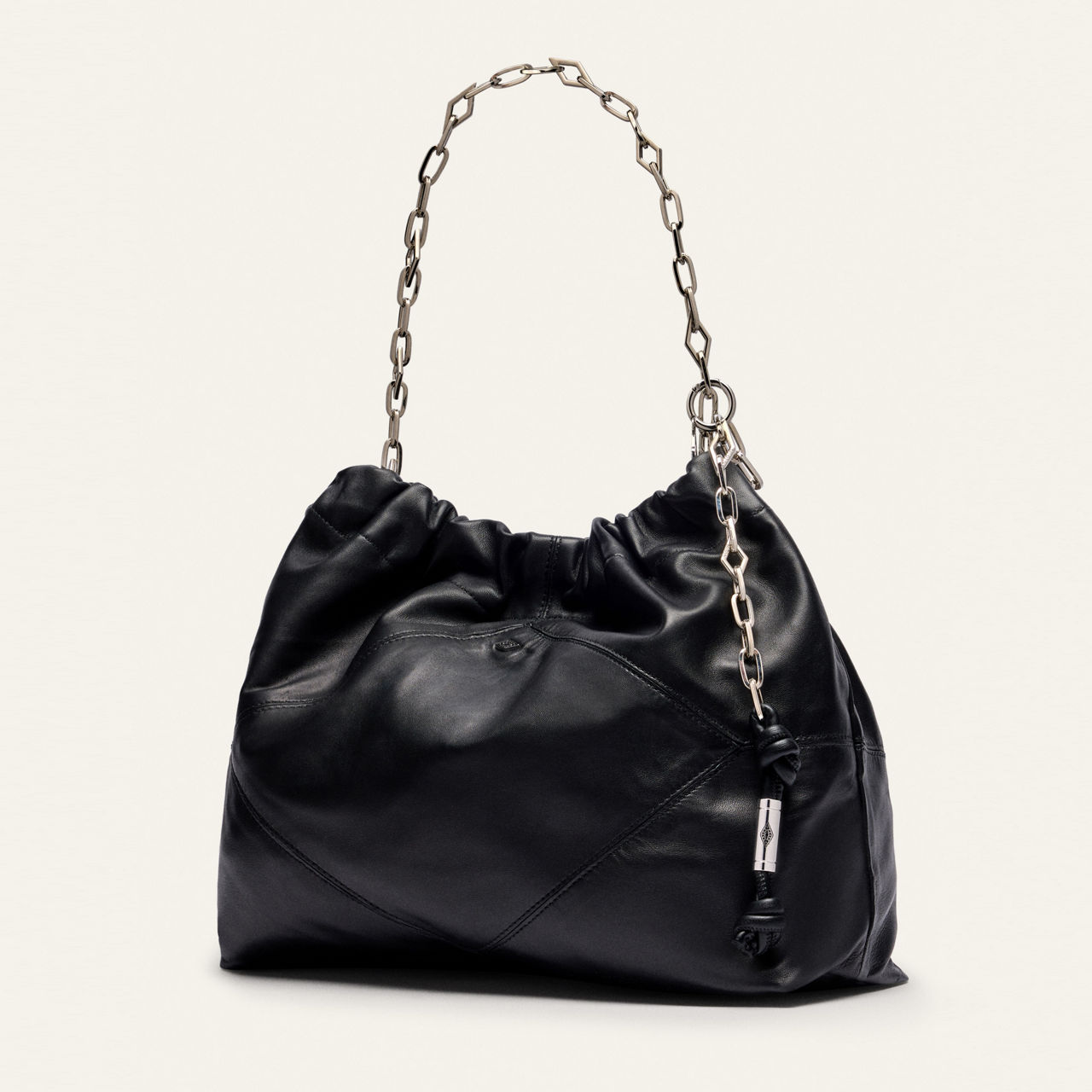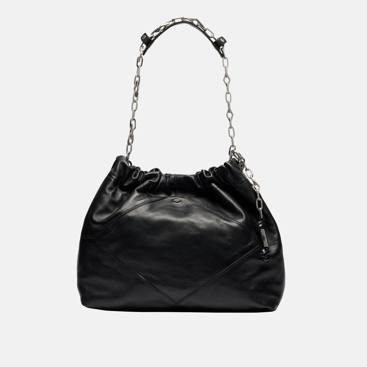 • Adjustable shoulder strap, magnetic fastening, grained finish, silver-tone hardware, stitched diamond pattern, logo details, charm detail