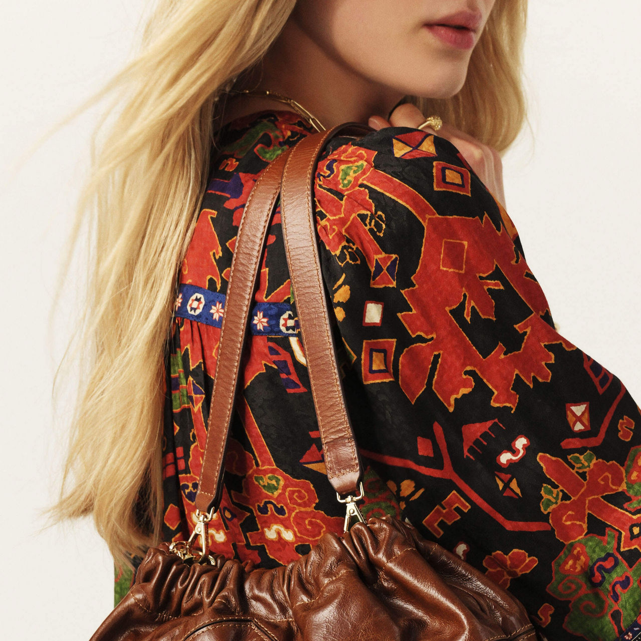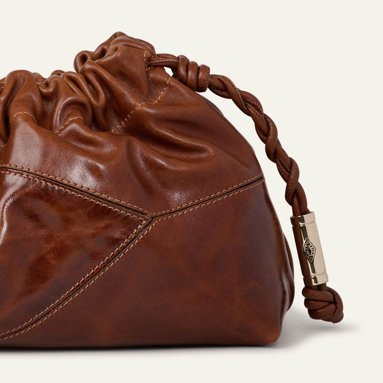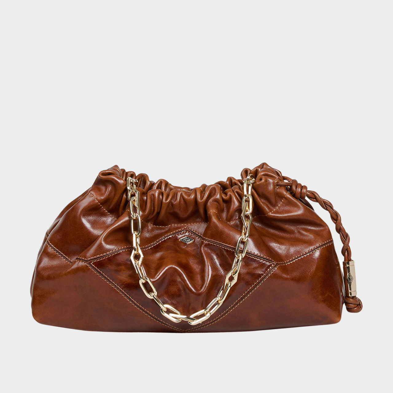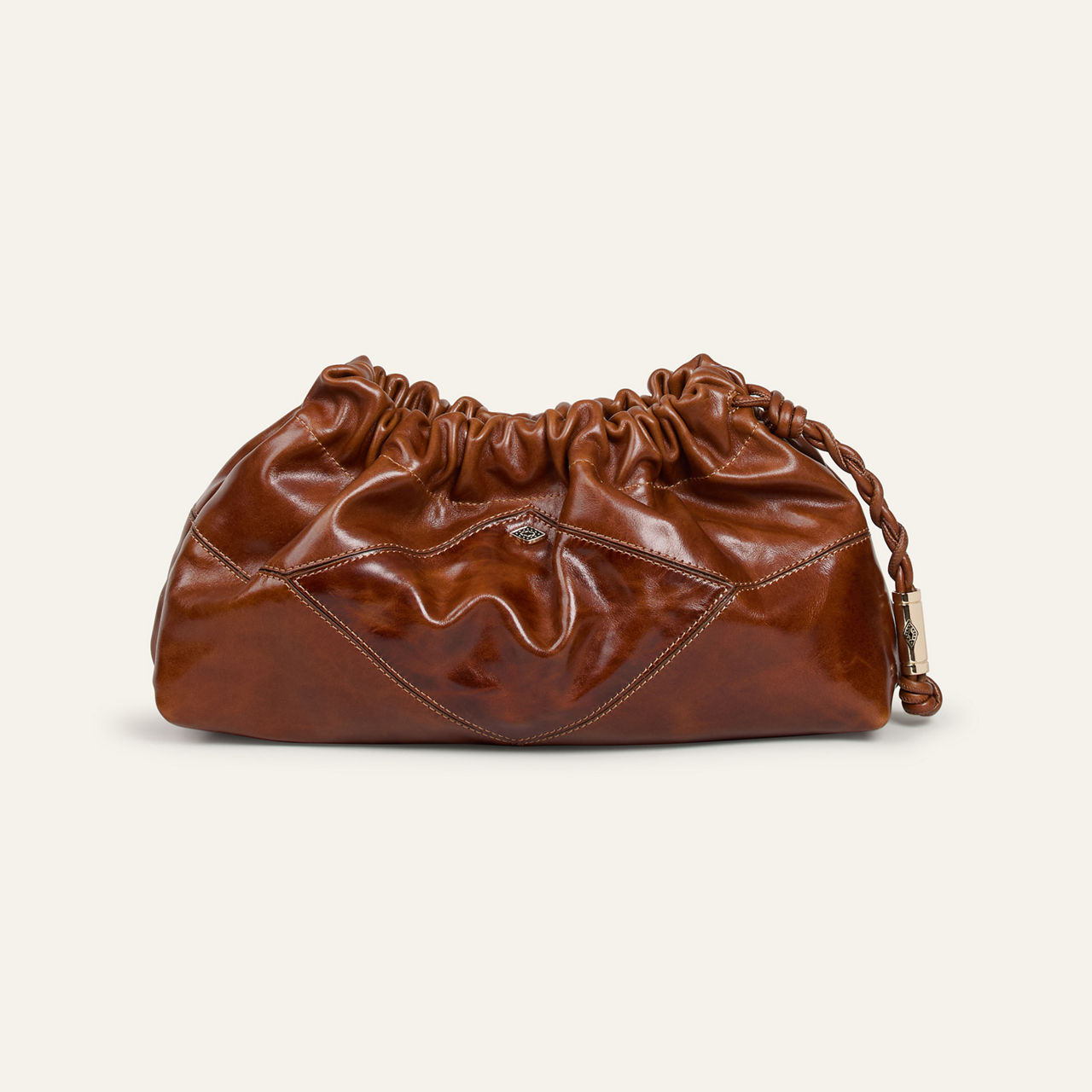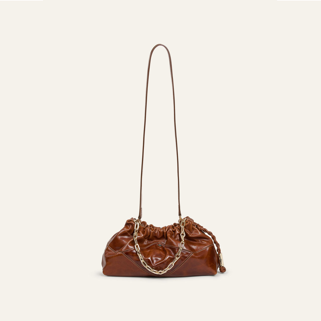 • Carried by hand, shoulder or crossbody, diamond chain, antique brass tube, crumpled details closing the bag, diamond-shaped cut-outs, signature diamond on the front, hand-woven link