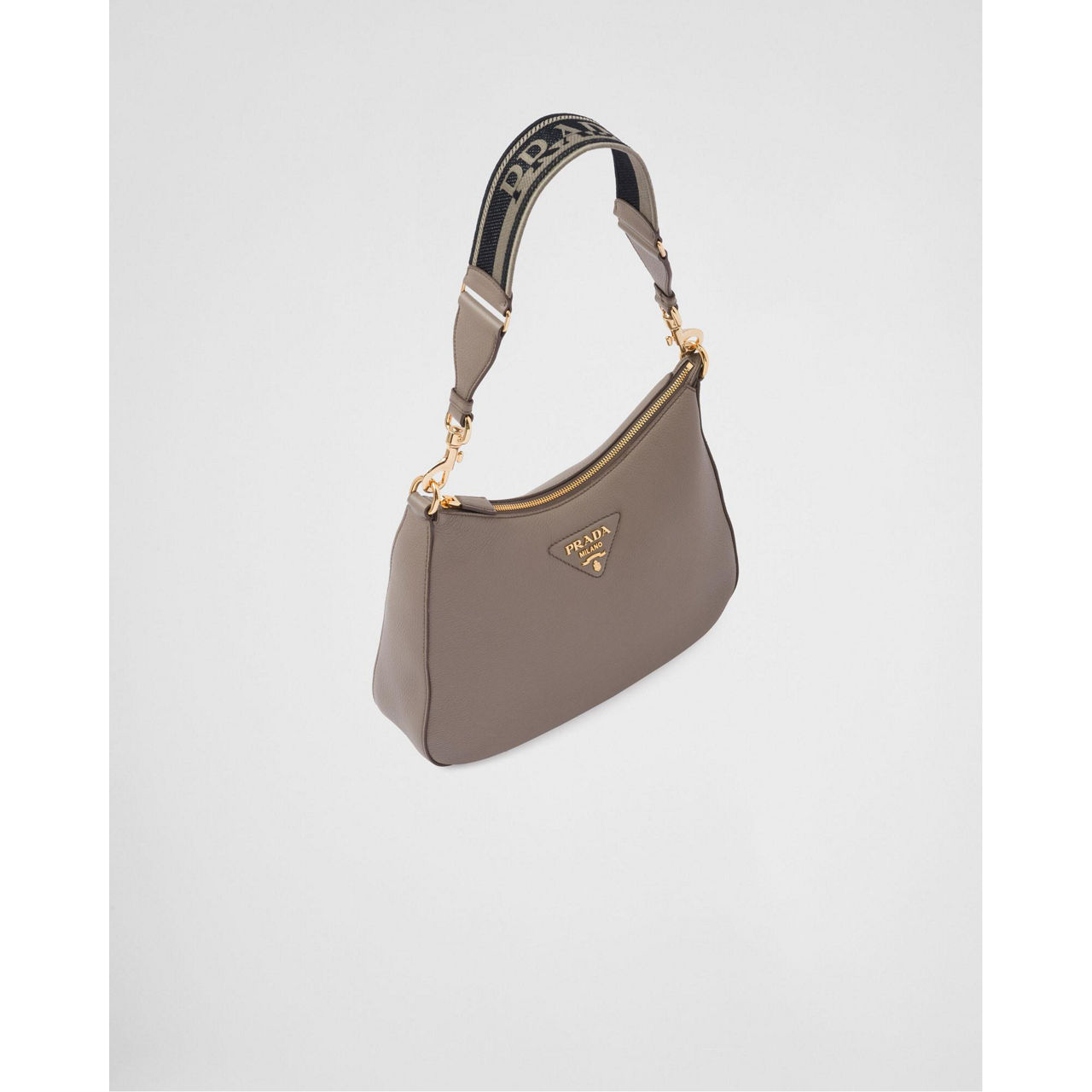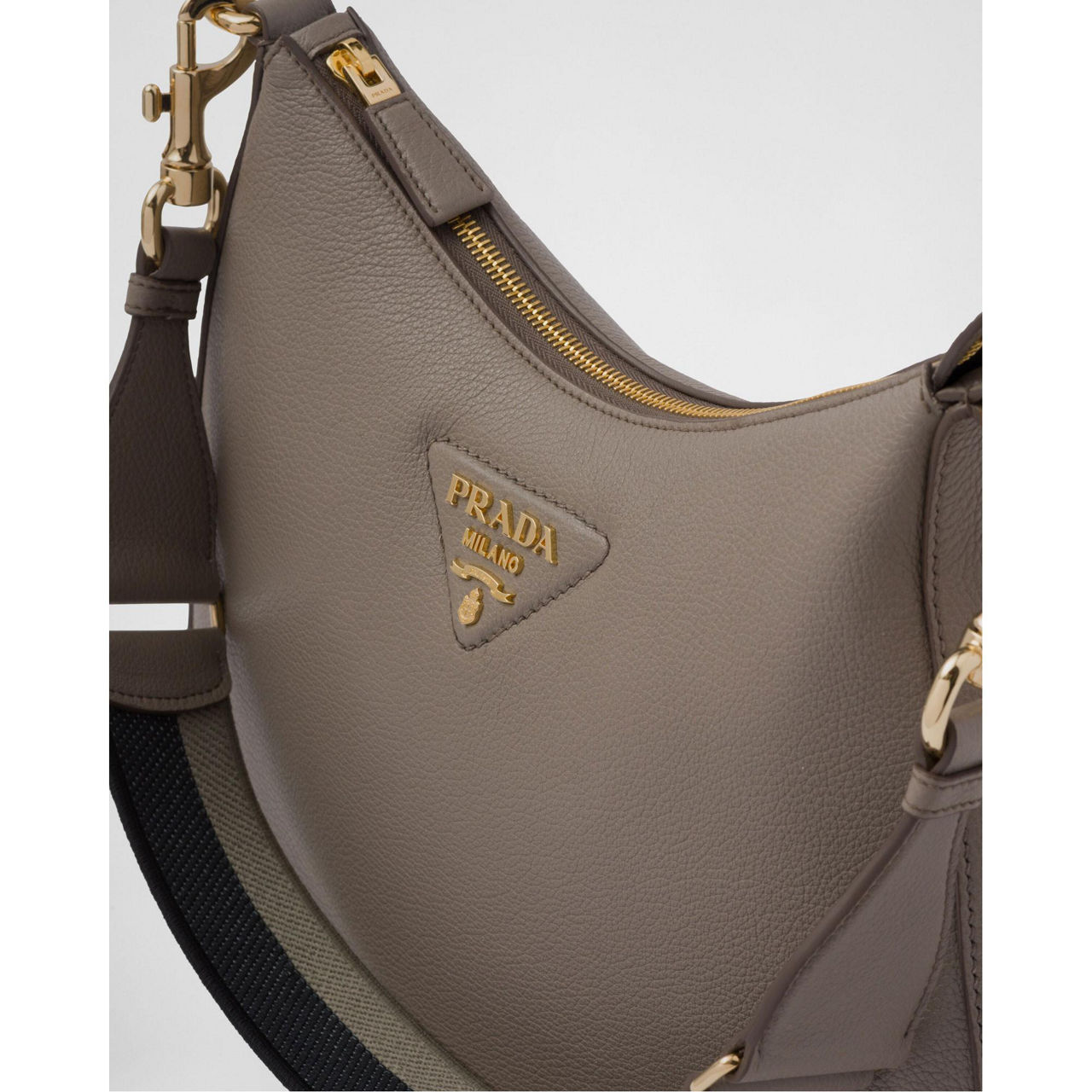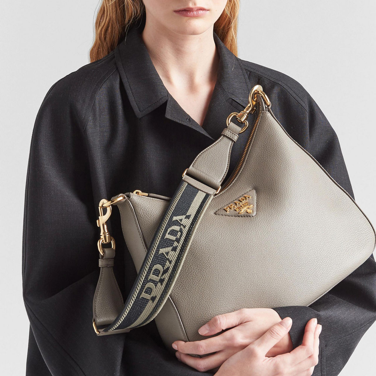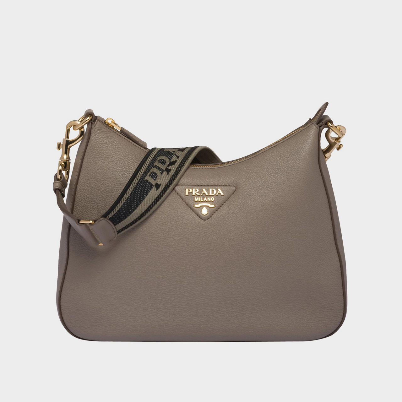 Uncomplicated in design, this bag from Prada works a soft yet structured silhouette that is emphasised by gold tone detailing. With a zip fastening and a detachable contemporary webbing style strap, this timeless design is one worth investing in.