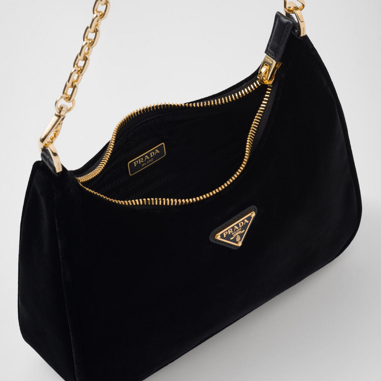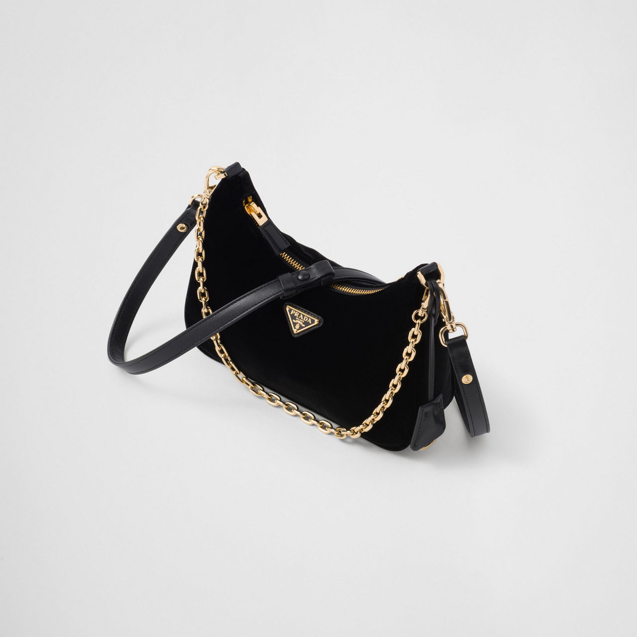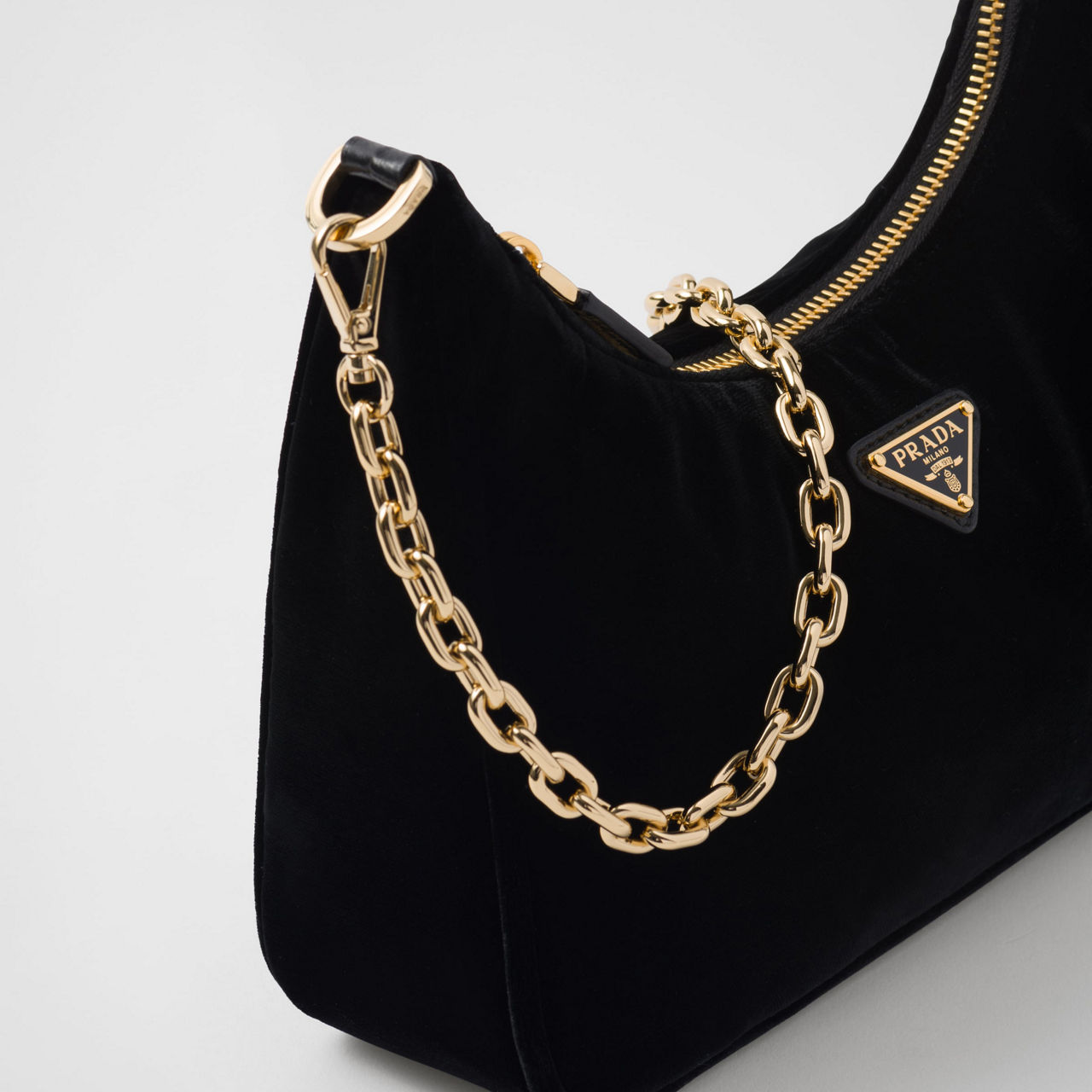 - Zip fastening, detachable shoulder strap and chain strap, gold-tone hardware, velvet finish, triangular logo plate