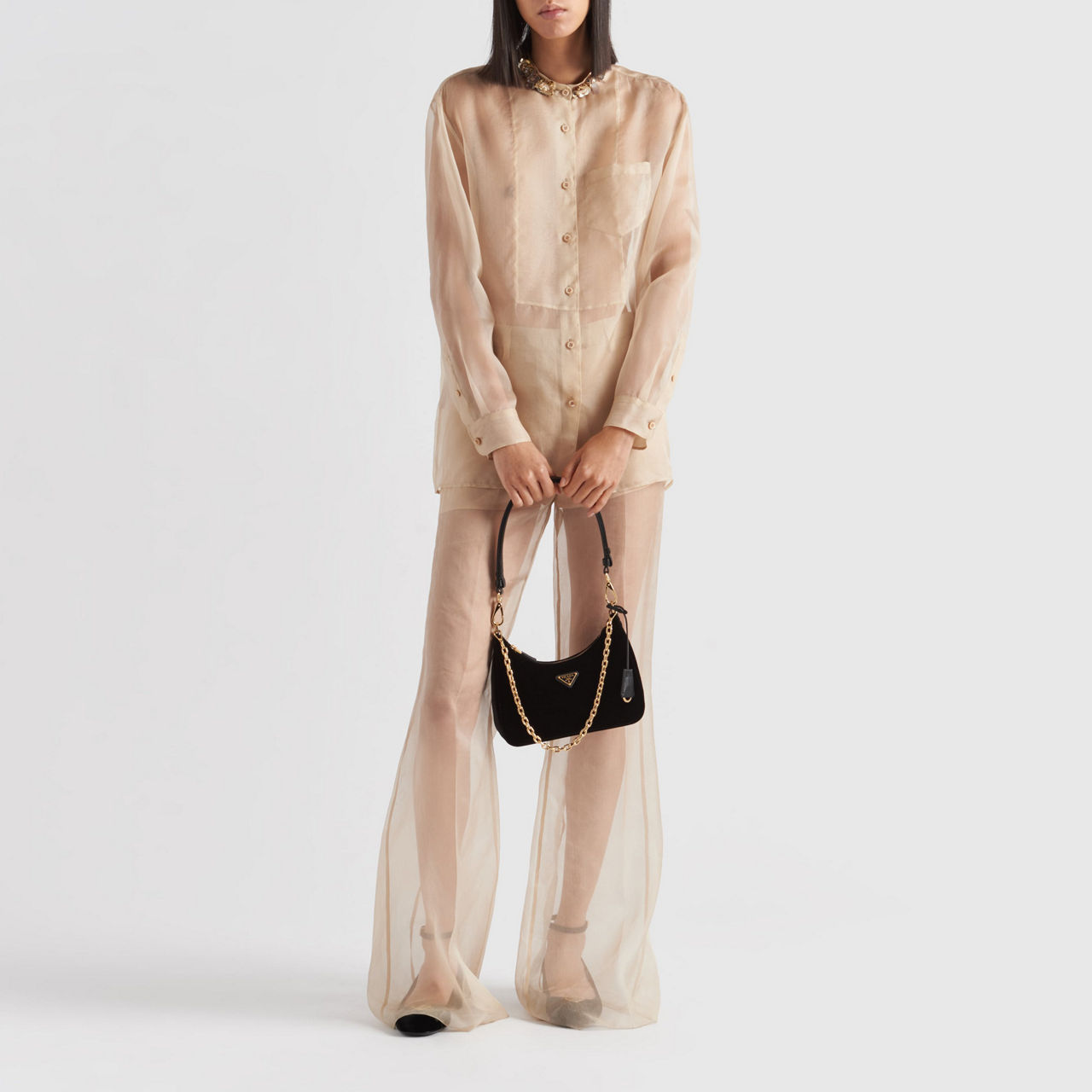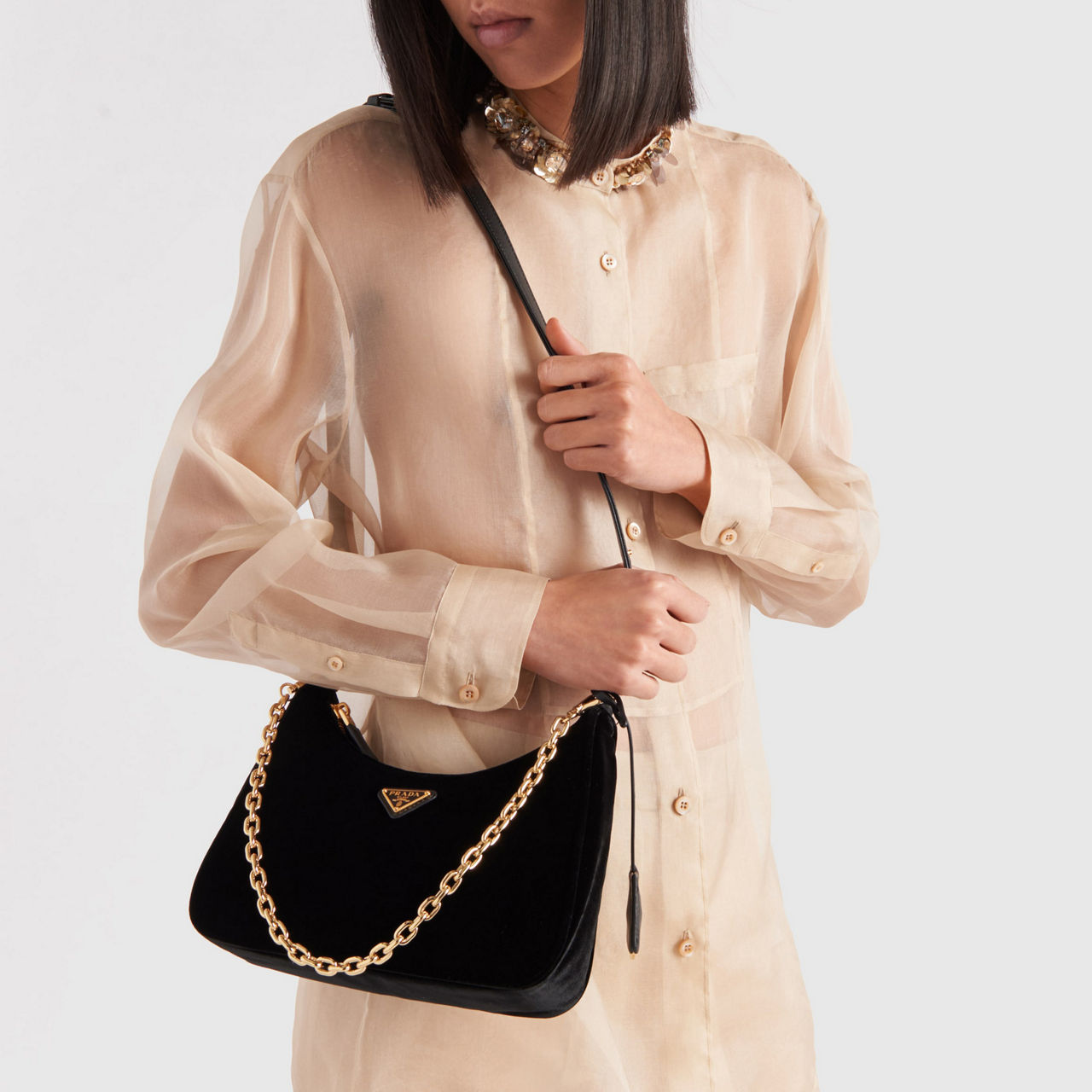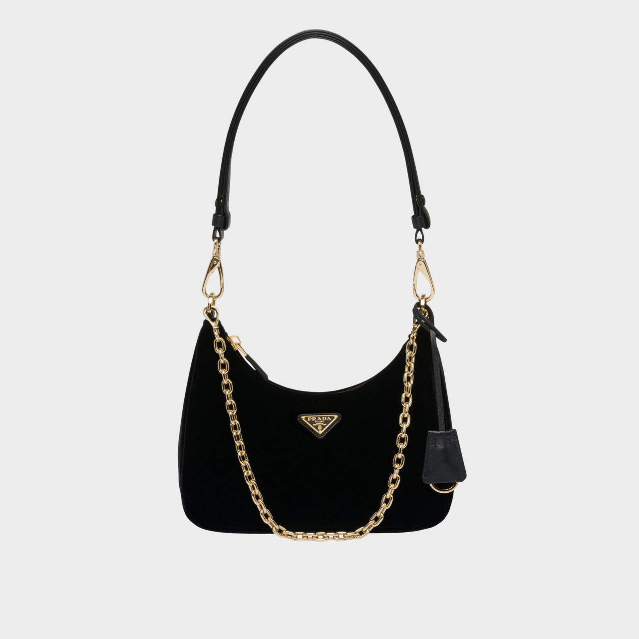- Zip fastening, detachable shoulder strap and chain strap, gold-tone hardware, velvet finish, triangular logo plate