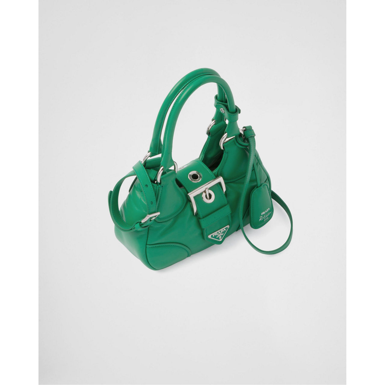 - Light padding, leather handles, detachable adjustable leather shoulder strap length 100cm, removable leather keychain, metal hardware, enamelled metal triangle logo on strap, magnetic closure, nappa leather lining with zipped pocket
