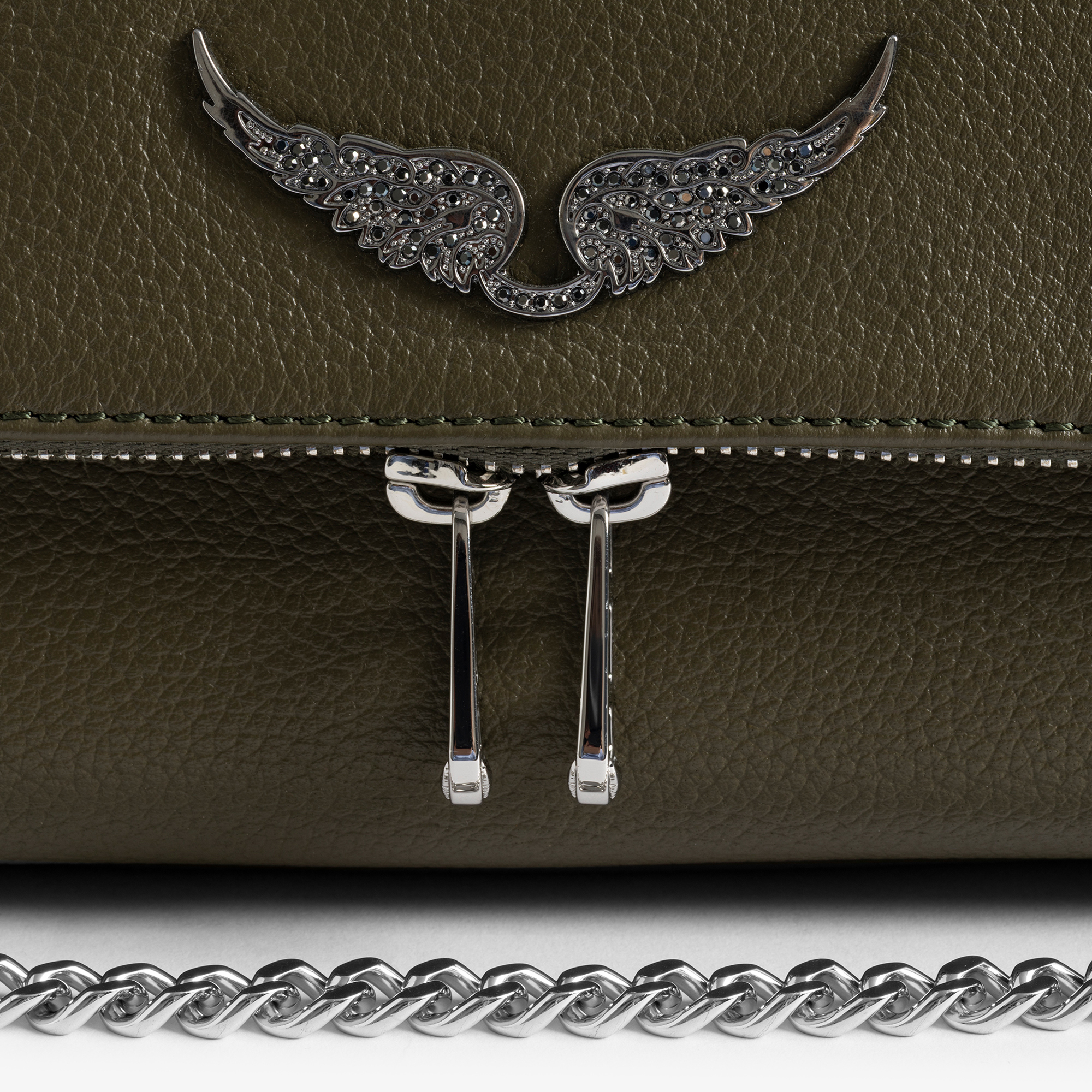 - Grained leather, flap front with magnetic button and two-way zip fastening, double chain strap, crystal-embellished wing logo charm, silver-tone hardware