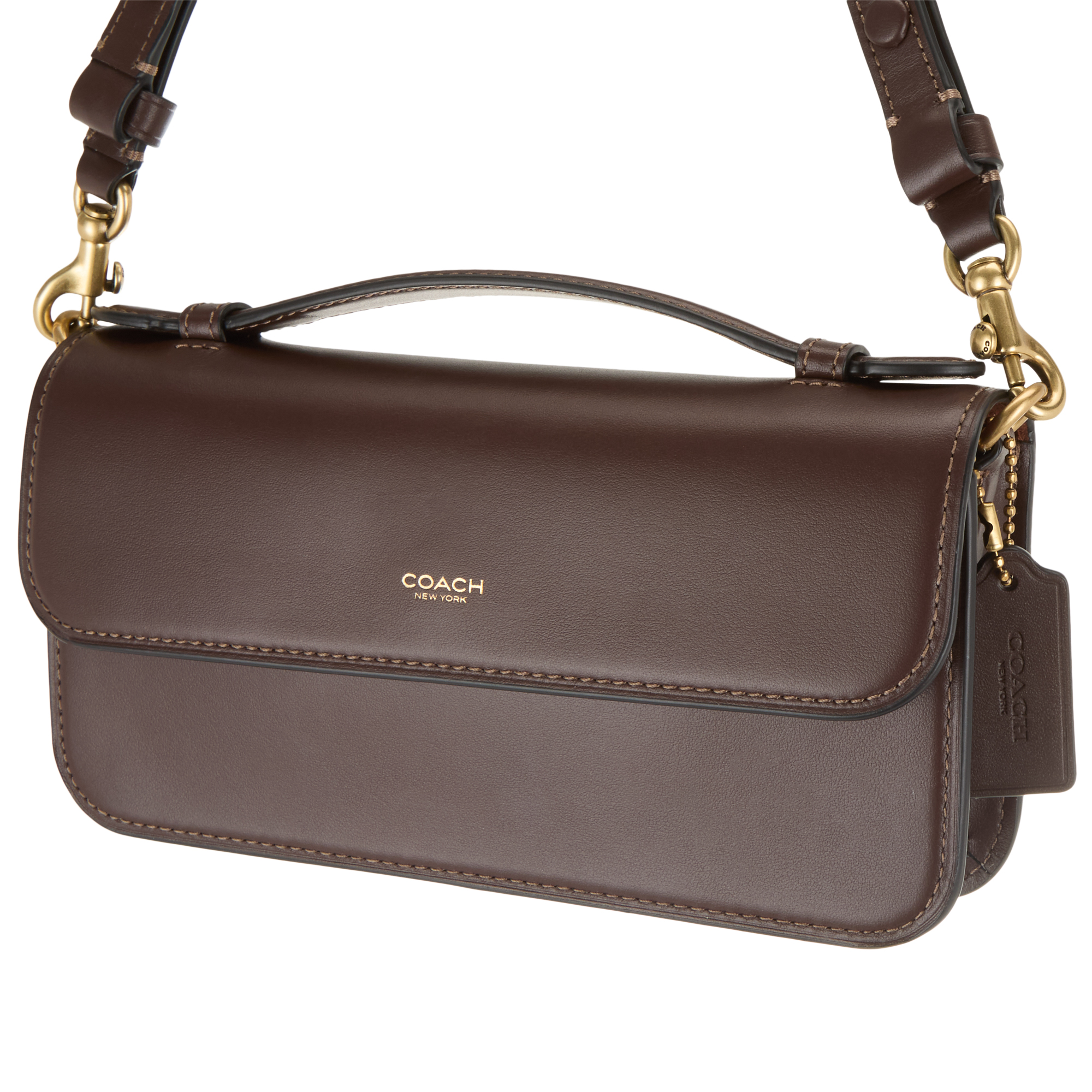 - Top handle, gold-toned hardware, lobster fastenings, smooth finish, flap closure, crossbody strap
