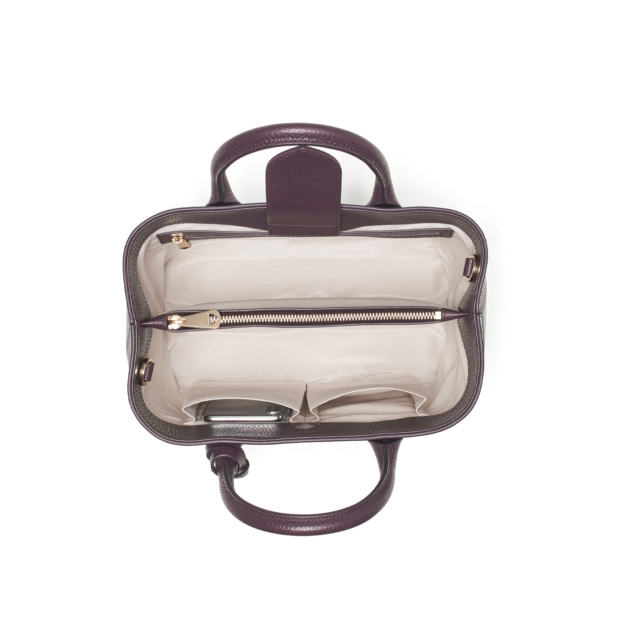 - Handcrafted, full-grain leather, semi-structured shape, two stitched 'A' side panels, signature charms, branding details, soft top handles