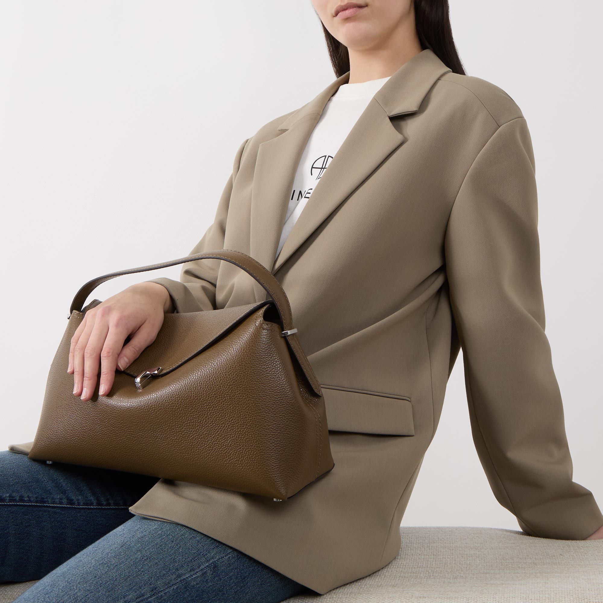 - Flap closure with T-lock fastening, silver-tone hardware, top carry handle, optionable removable strap, tonal stitching, metal protective studded feet, grained leather finish