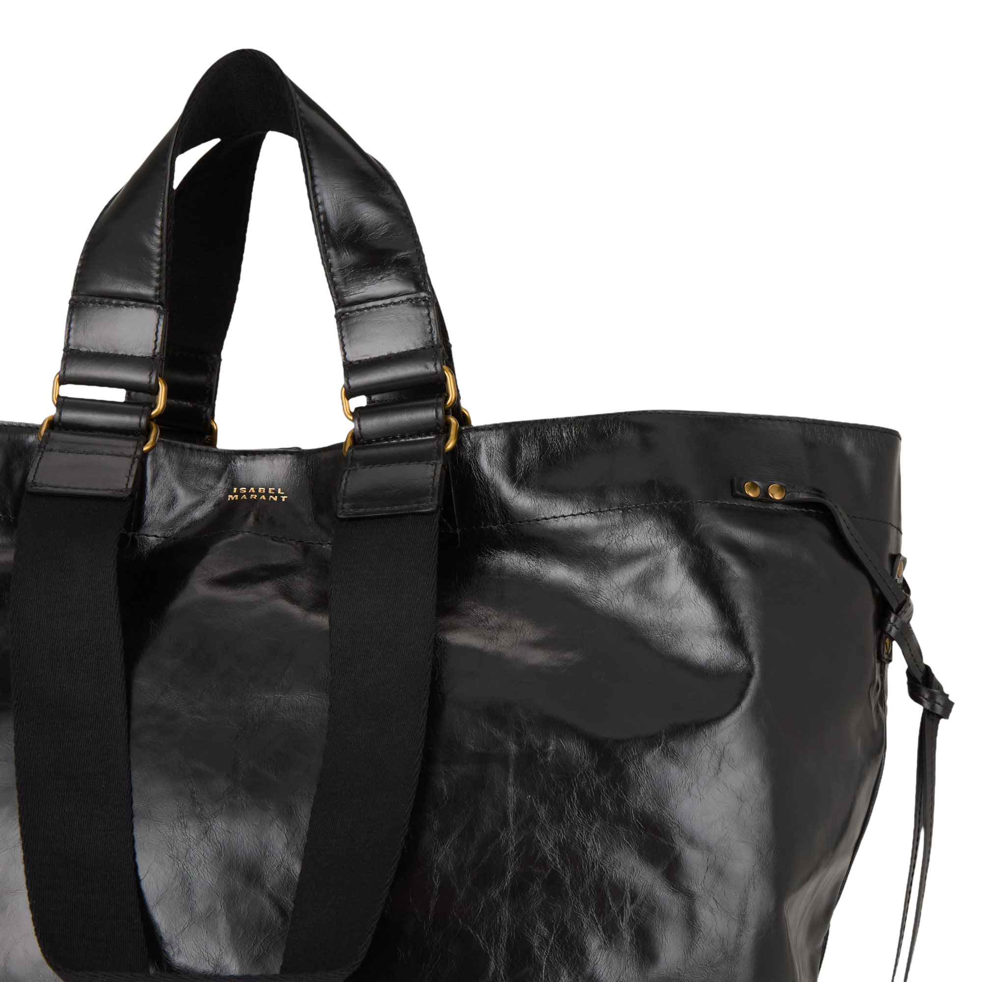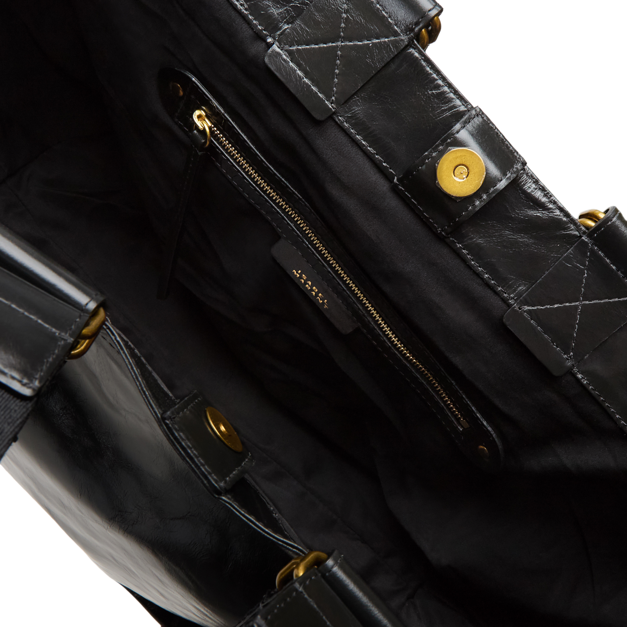• Top carry handles, shoulder straps, large size, open top with magnetic button closure, tie details to the side, logo details, gold-tone hardware