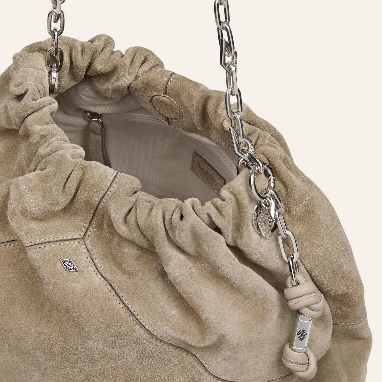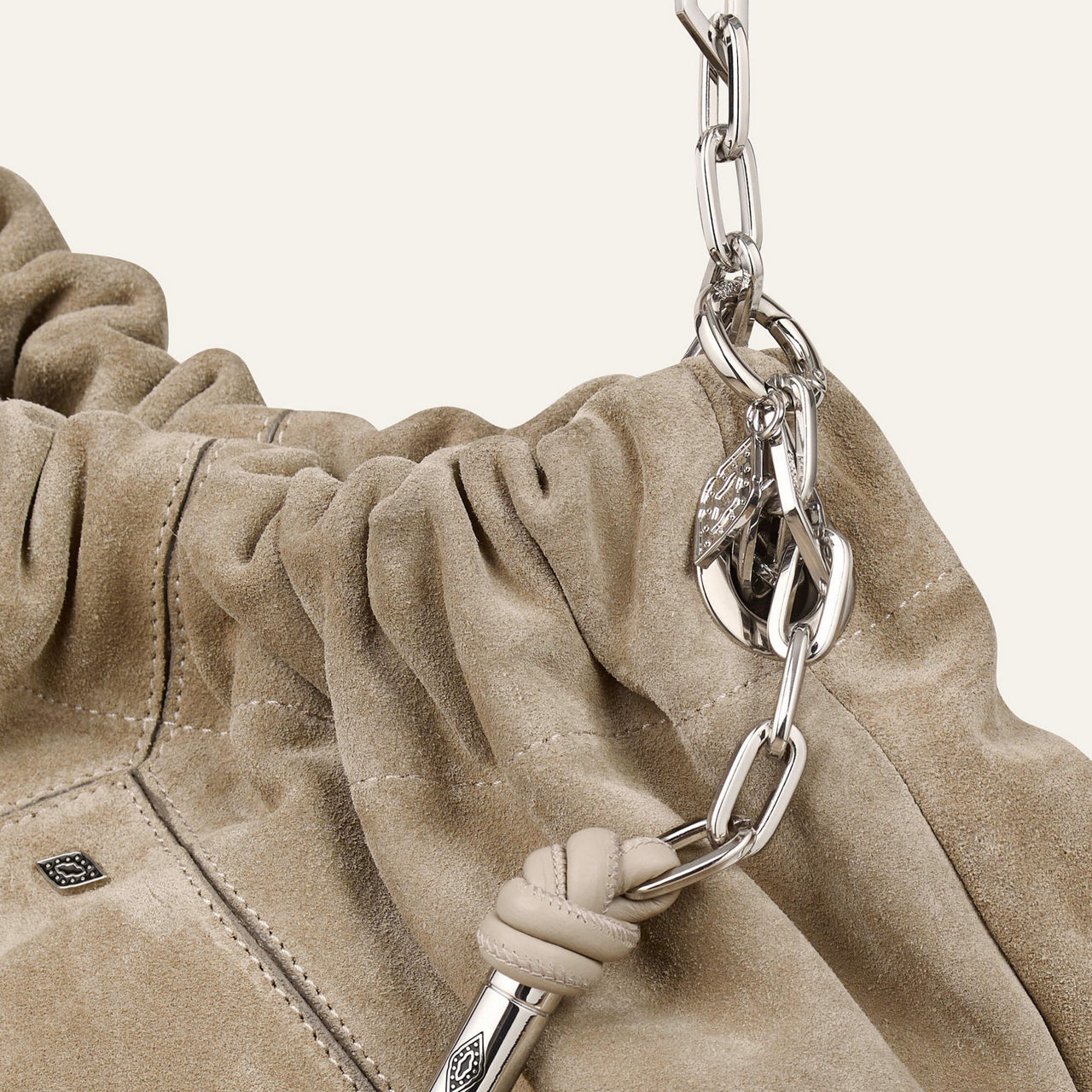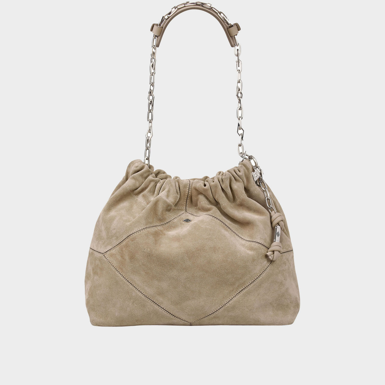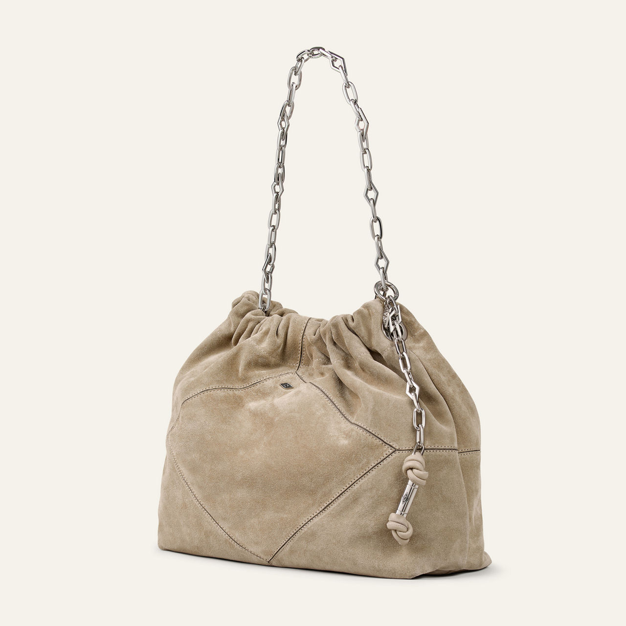 - Pleated details on top, soft suede finish, metal diamond chain for shoulder-carry, numerous hand-crafted details, signature diamond-shaped cut-outs on front, double shoulder strap, hand-braided ties, diamond-shaped topstitching, removable and adjustable strap