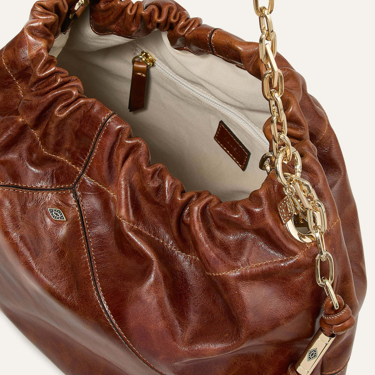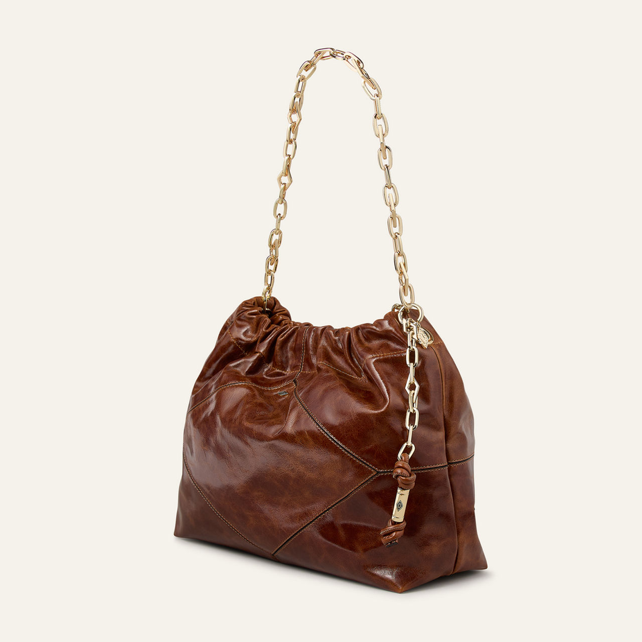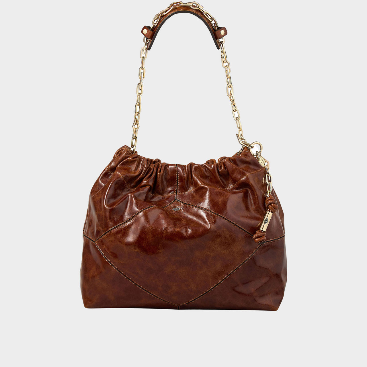 • Carried by hand or on shoulder, diamond shaped chain, aged brass tube, crinkled detail on bag closure, diamond shaped cut outs, diamond-shaped branding on the front, hand-woven tie