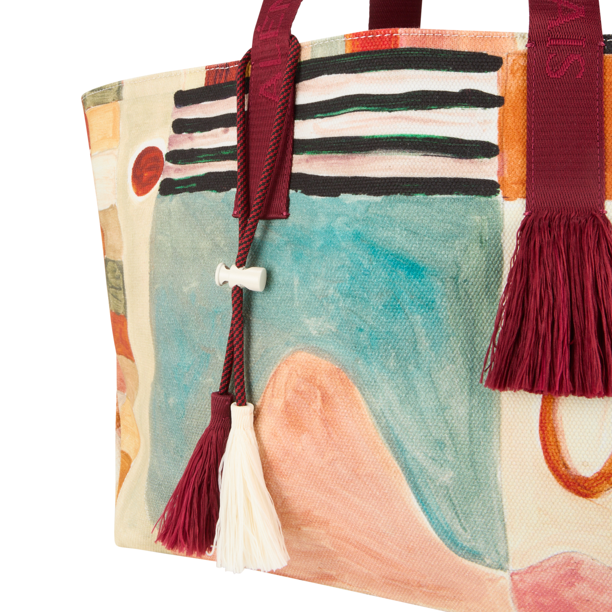 • Two logo webbed shoulder straps, open top design, woven jacquard pattern, contrasting colours, hanging fringed tassels, canvas finish