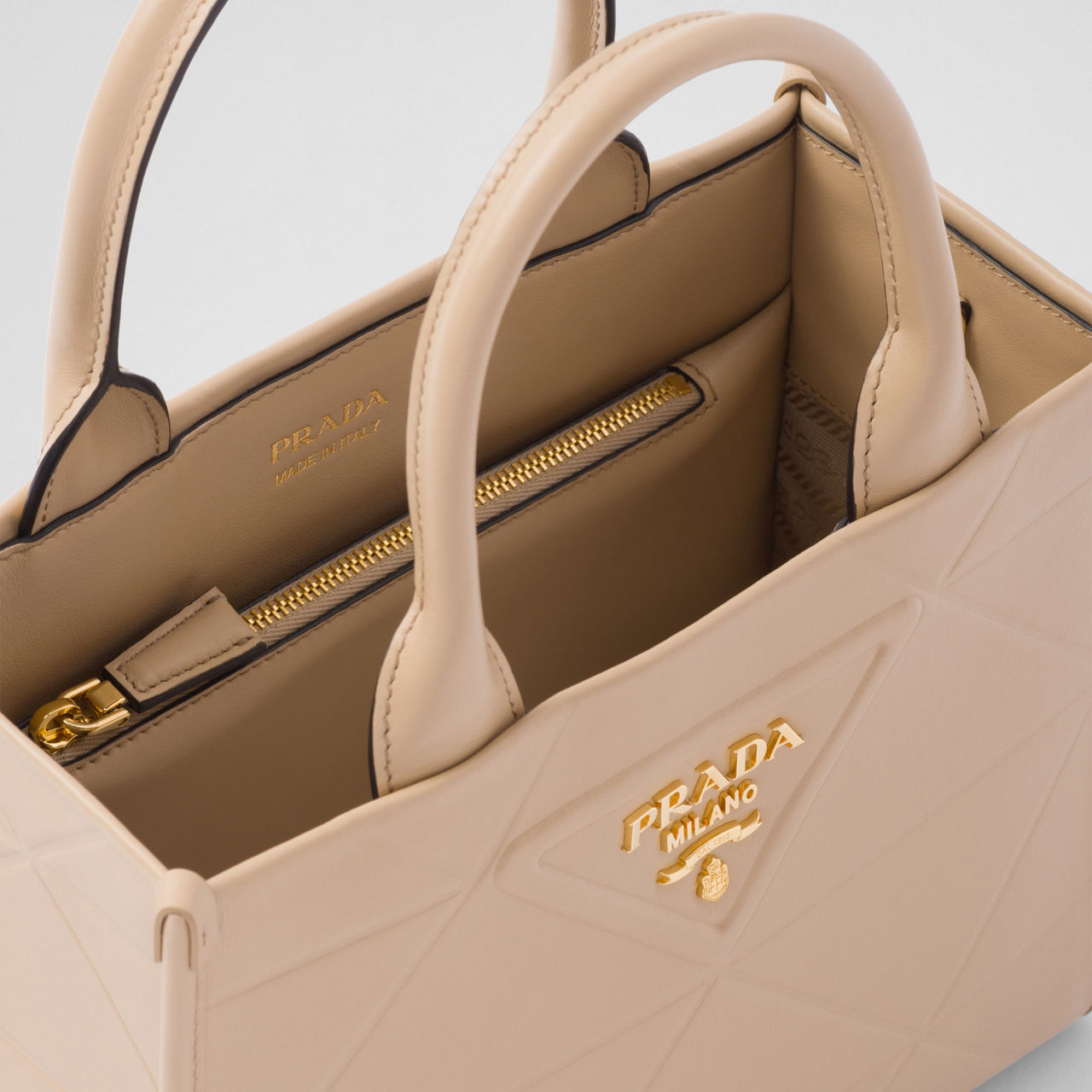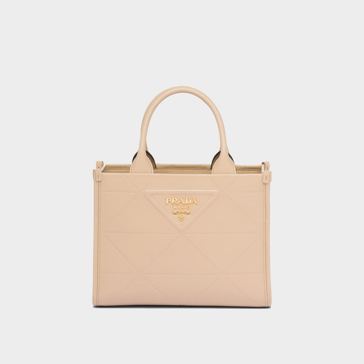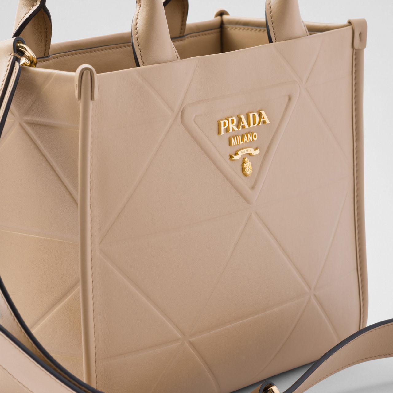 The Symbole mini tote bag expresses the iconic Prada triangle with a fresh, contemporary voice. Crafted from soft leather and echoes the House motif in a geometric stitching design, this versatile accessory boasts signature details and metallic branding that will elevate your daily accessory edit.