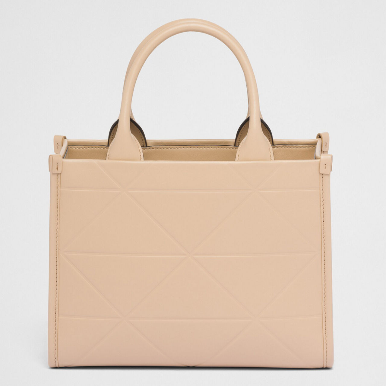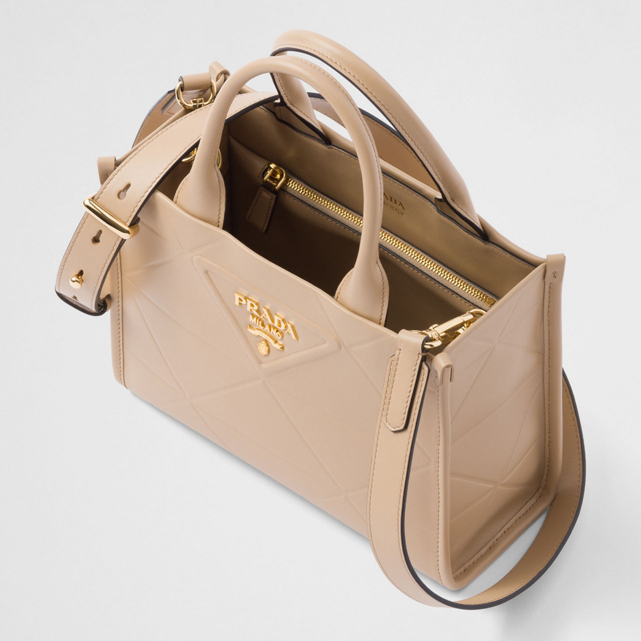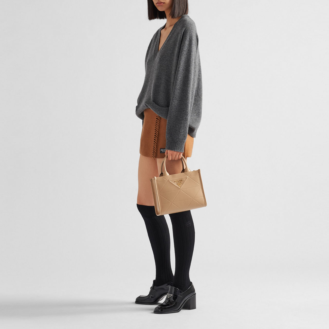 The Symbole mini tote bag expresses the iconic Prada triangle with a fresh, contemporary voice. Crafted from soft leather and echoes the House motif in a geometric stitching design, this versatile accessory boasts signature details and metallic branding that will elevate your daily accessory edit.