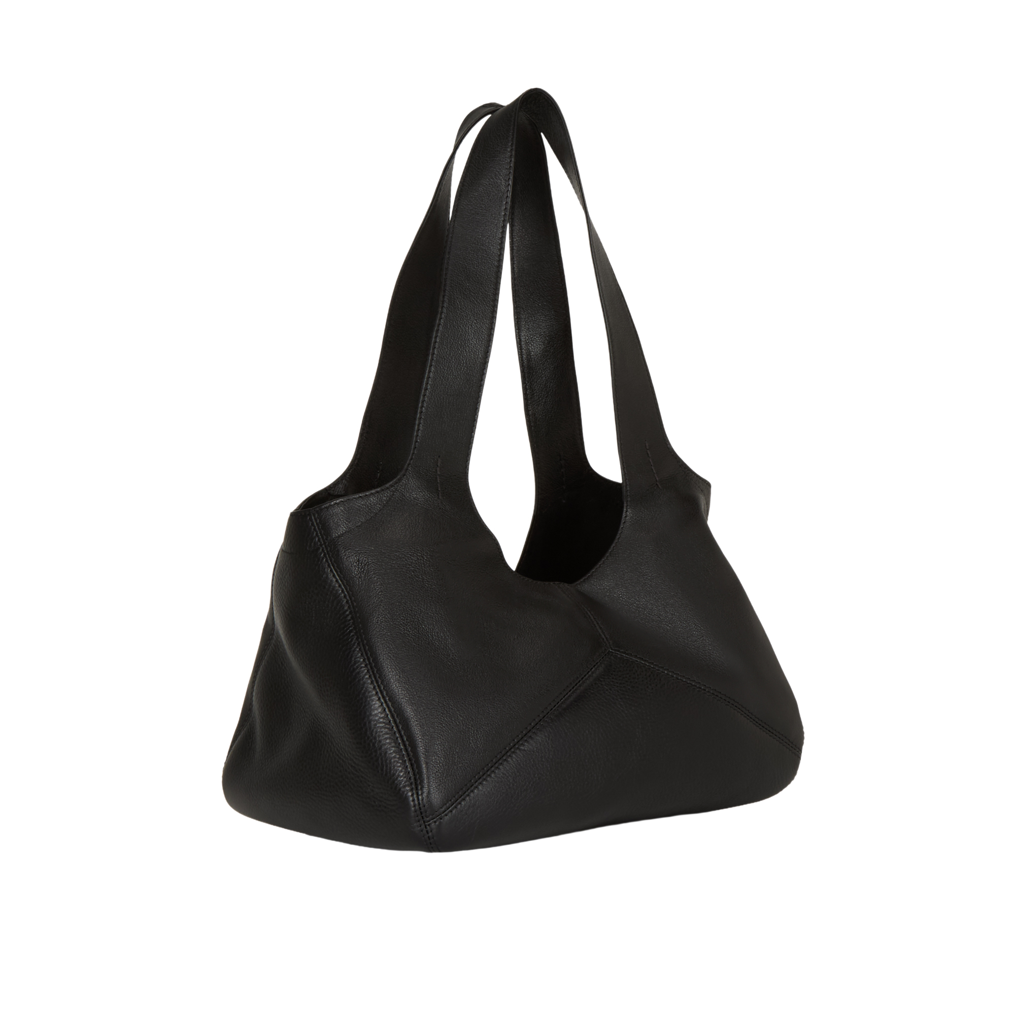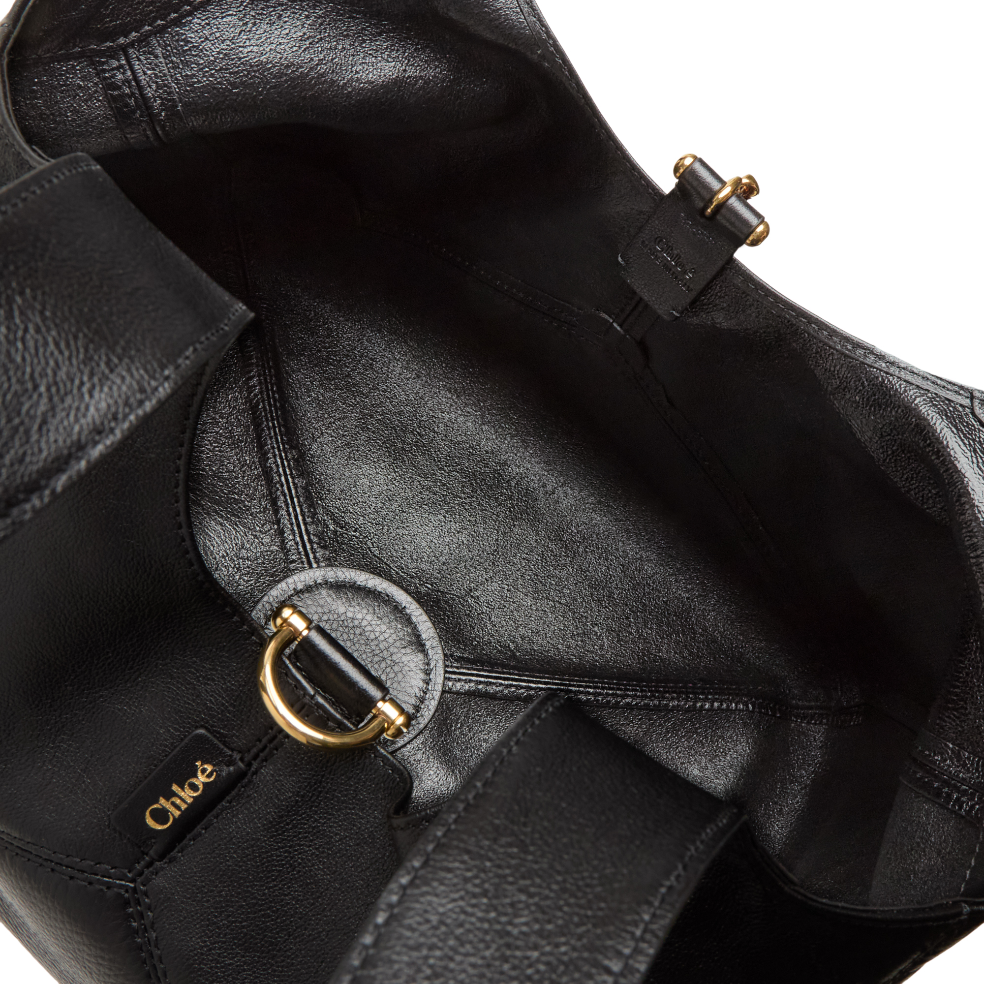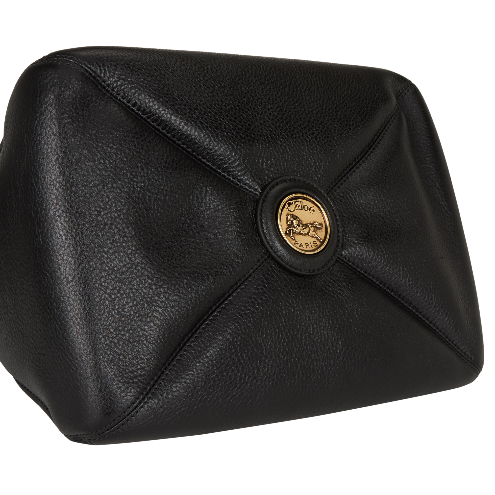 - Two shoulder straps, unstructured silhouette, equestrian-inspired gold-tone toggle clasp and chain, logo patch, signature Horse Medal at the base of the bag, grained leather finish