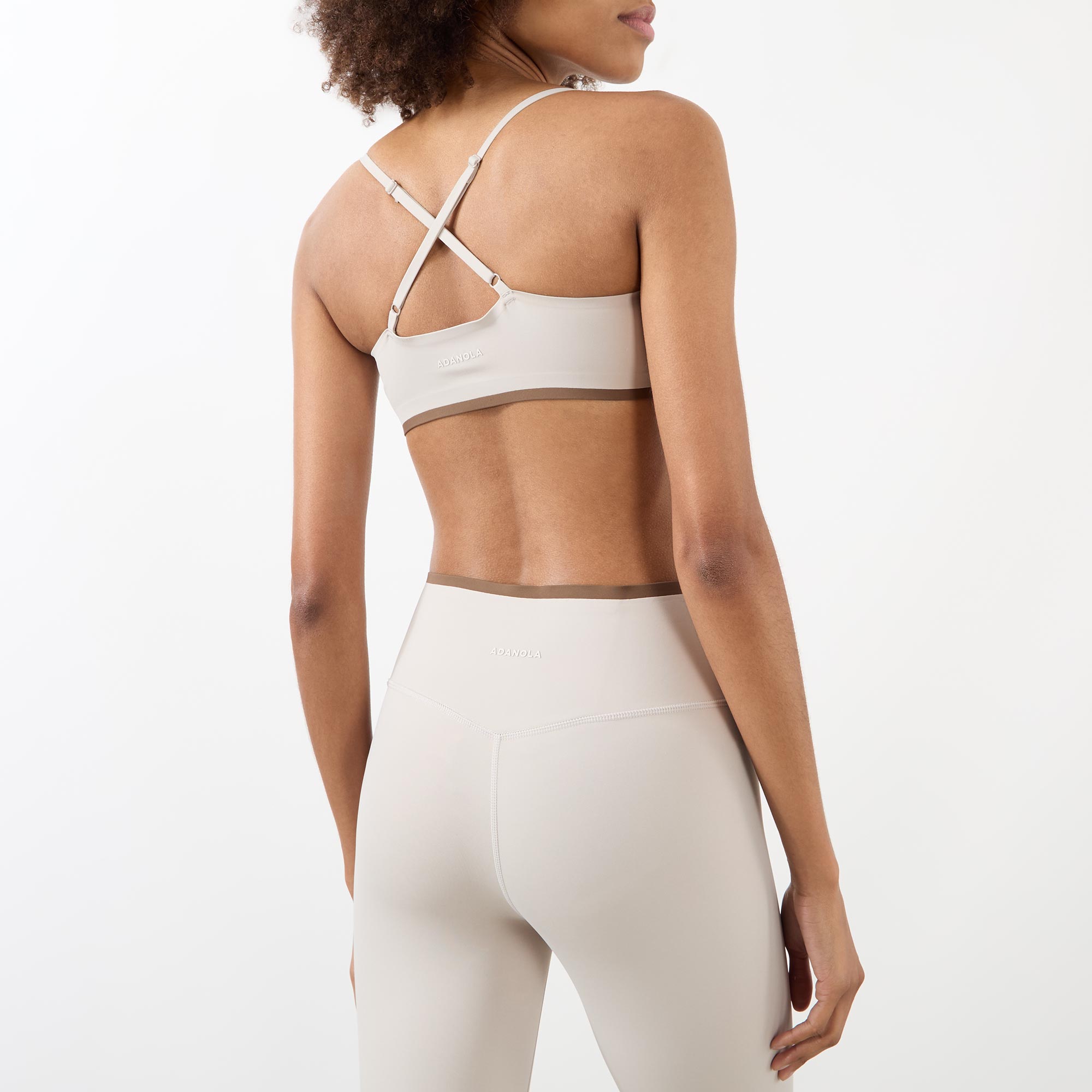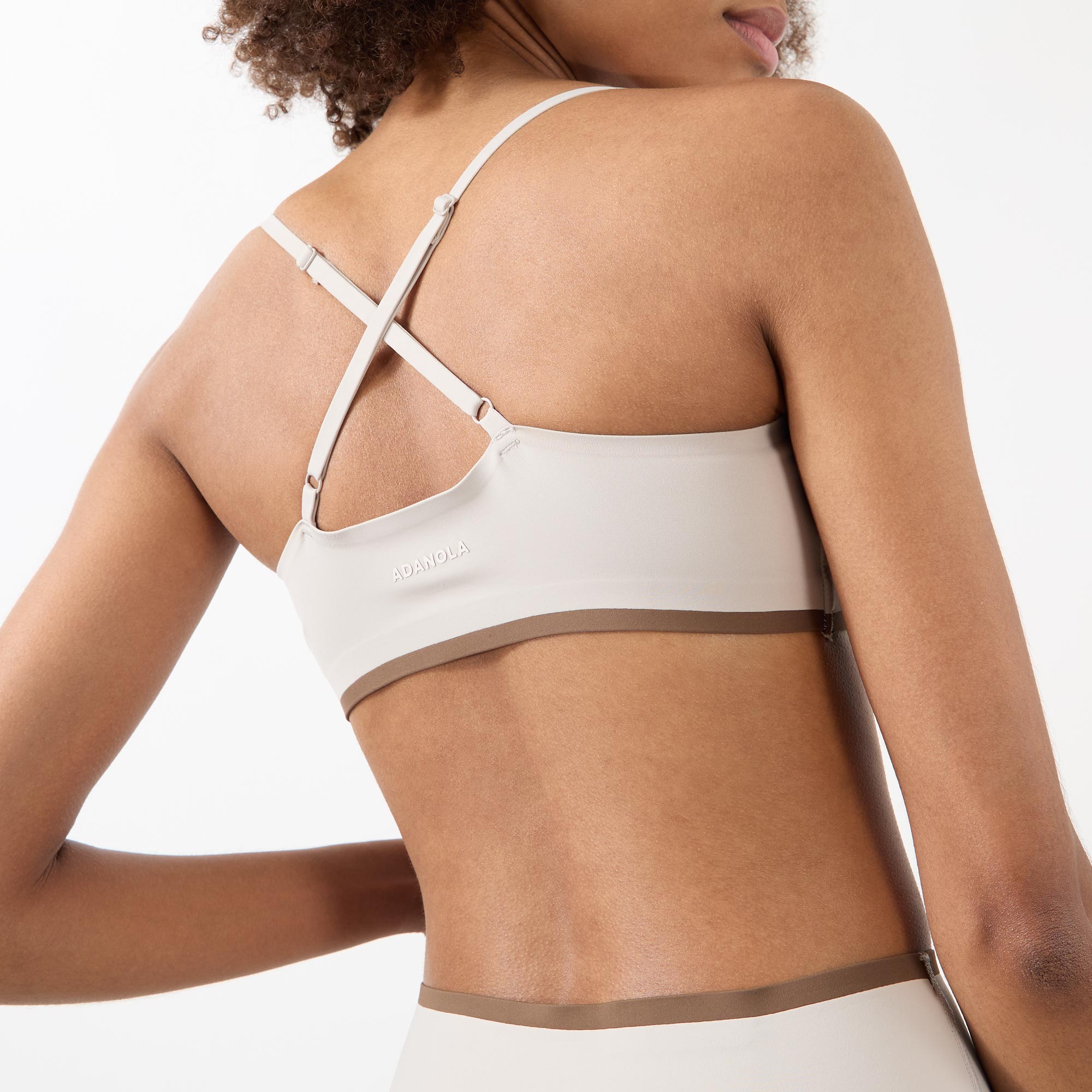 - Skinny adjustable straps with crossover detail to the back, bonded seam finish, double-layered front panel, no shelf, no padding, tonal raised branding, tipped hem