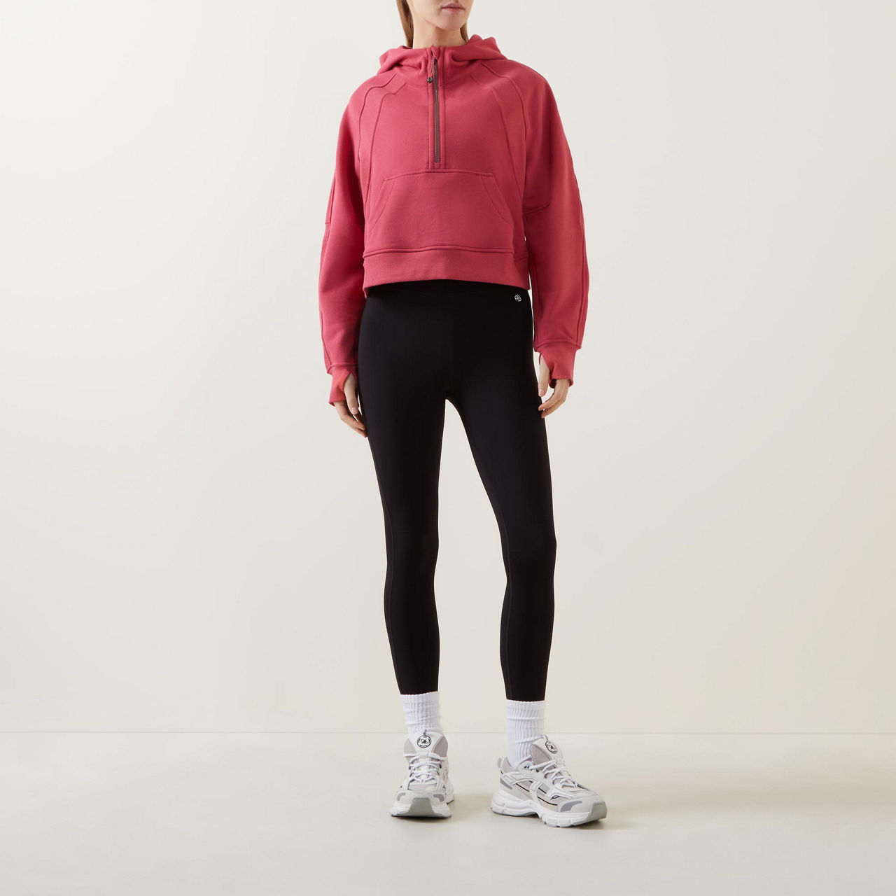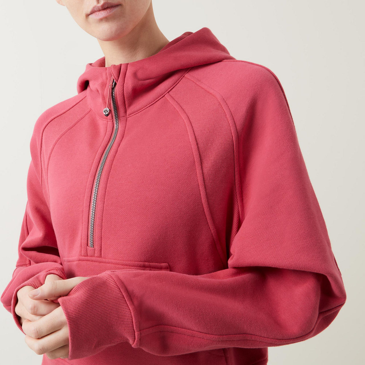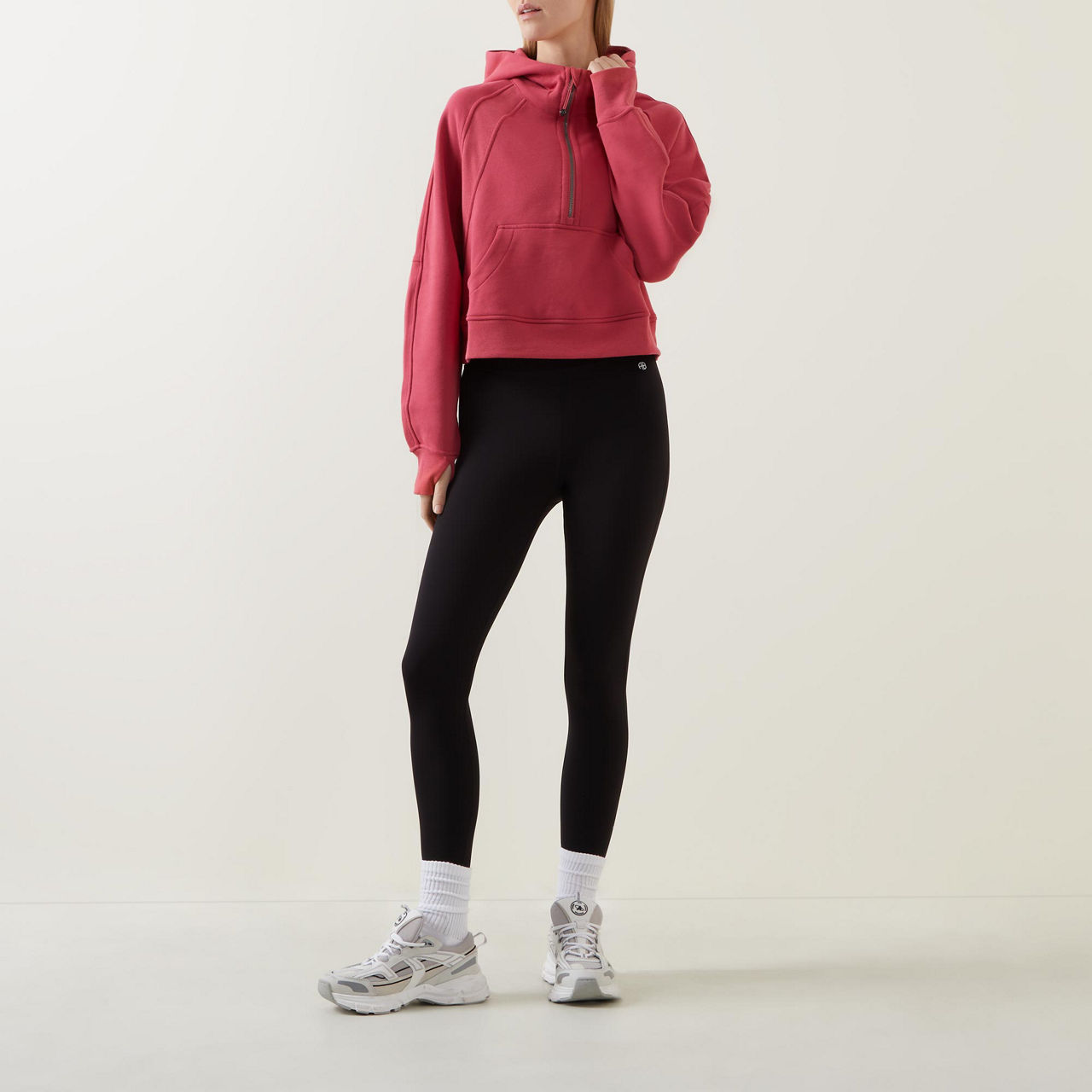 - Features: Half-zip fastening, hood, ribbed trims, embroidered logo detail, kangaroo pocket, hidden phone sleeve, thumbholes, breathable, elastic zipper pull doubles as an emergency hair tie