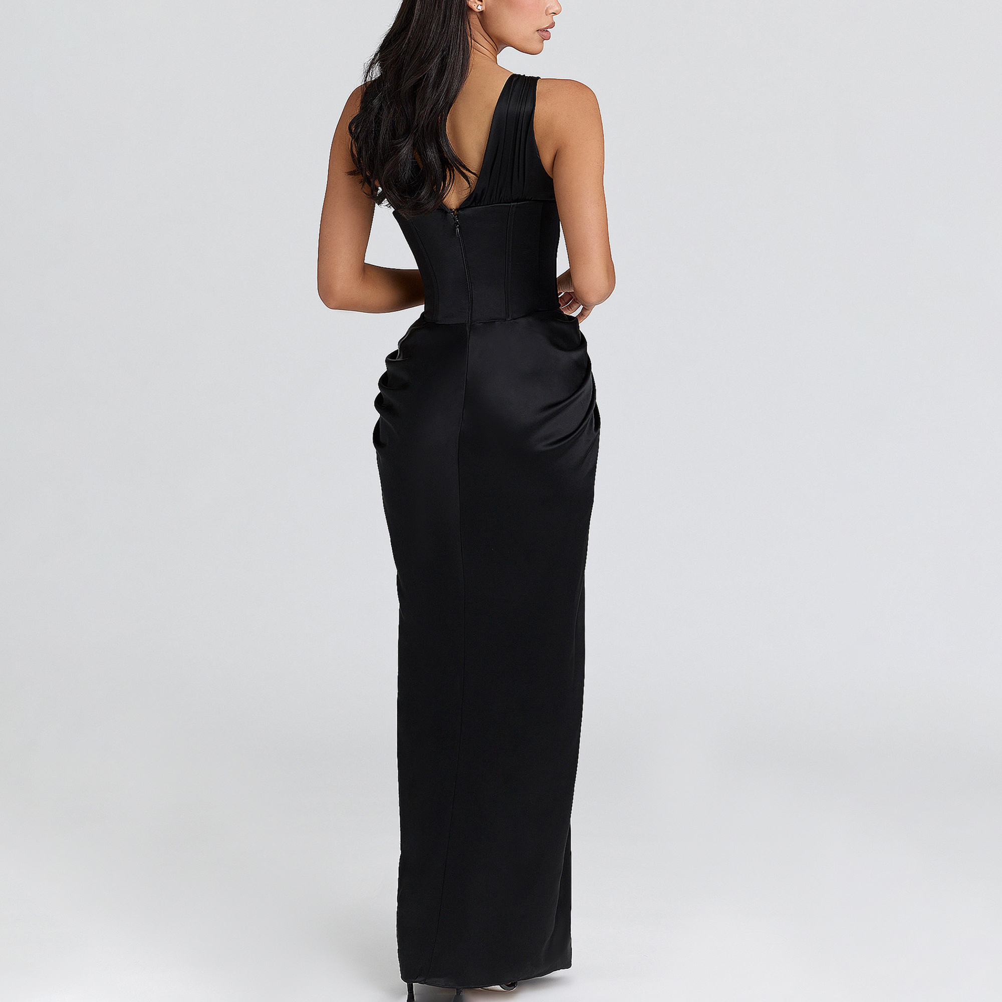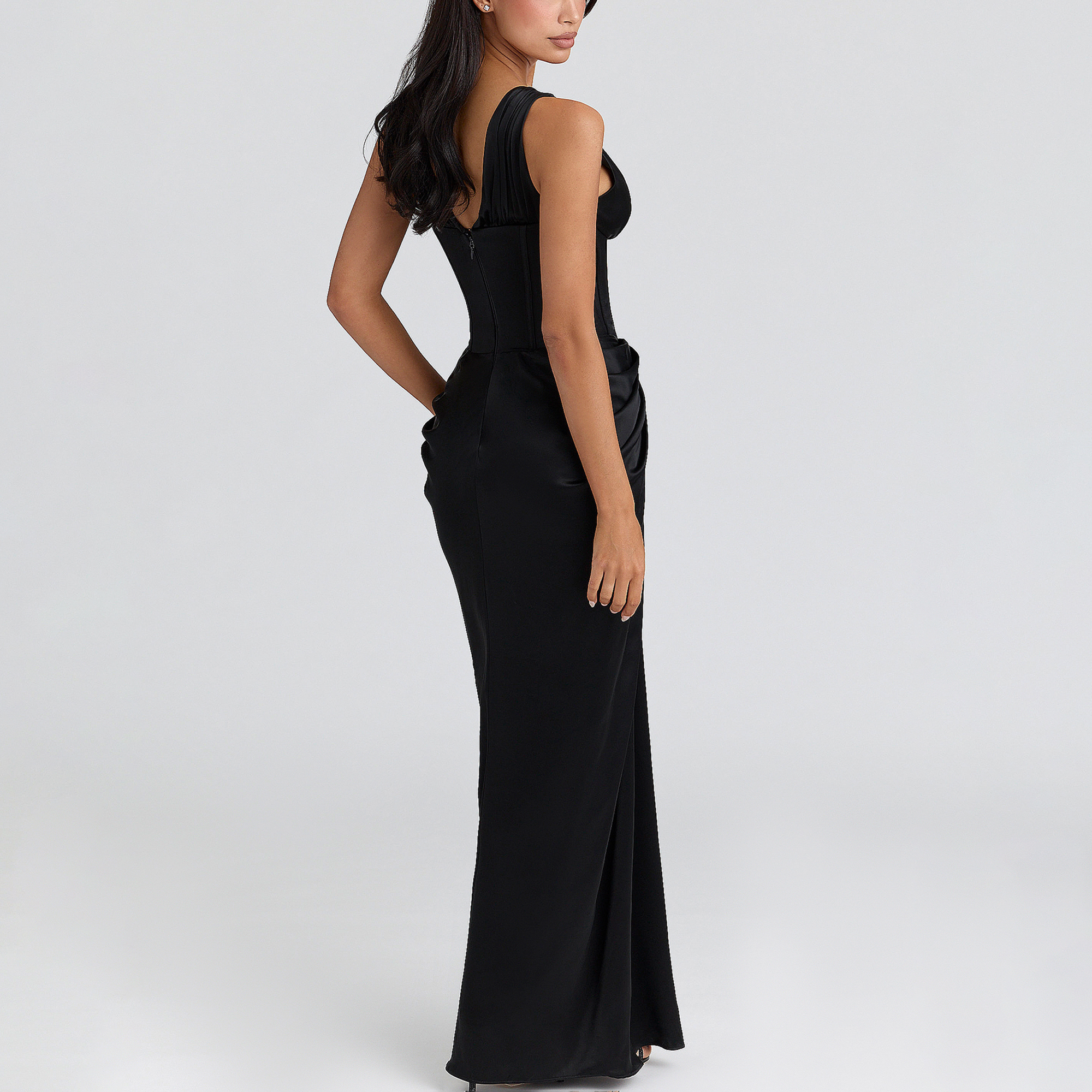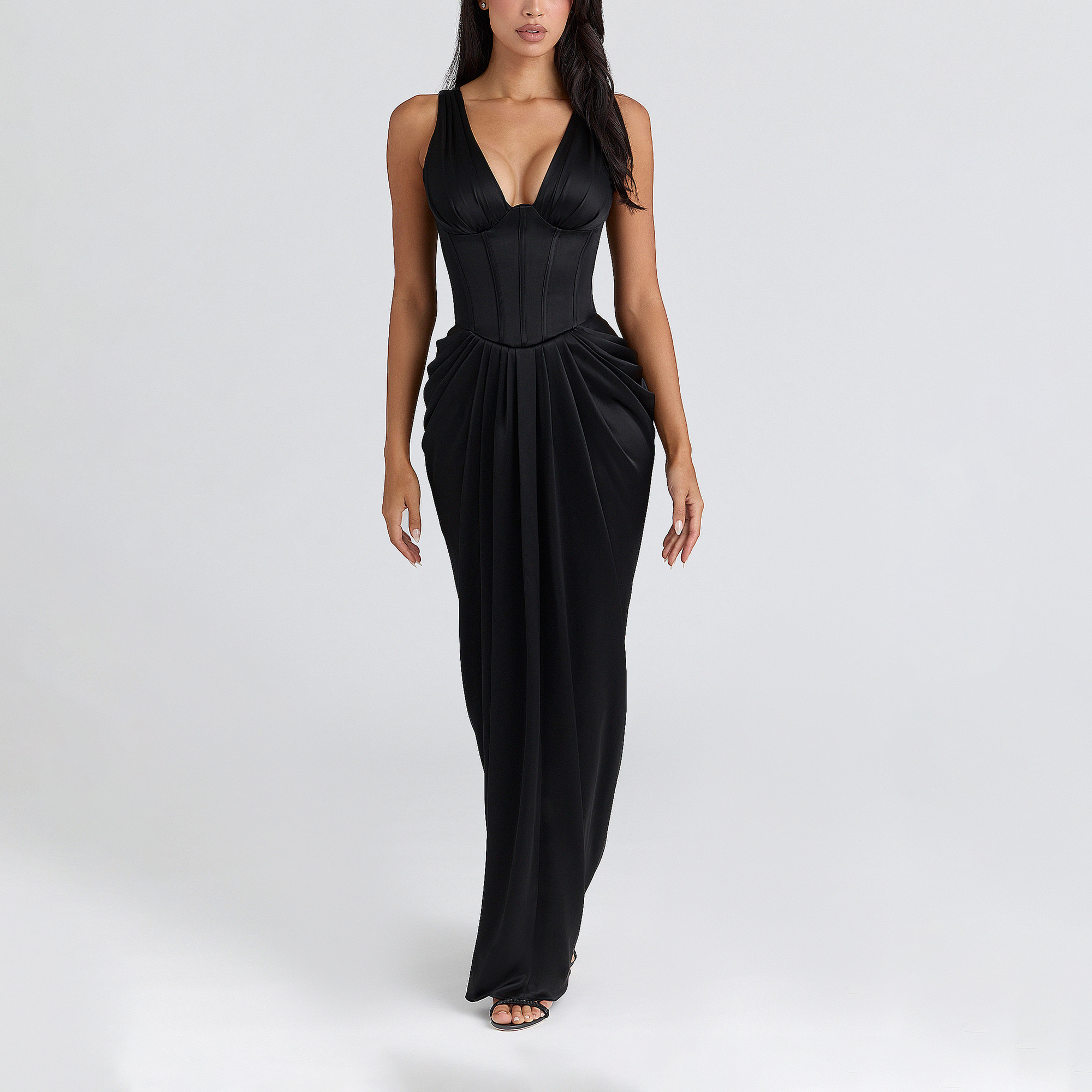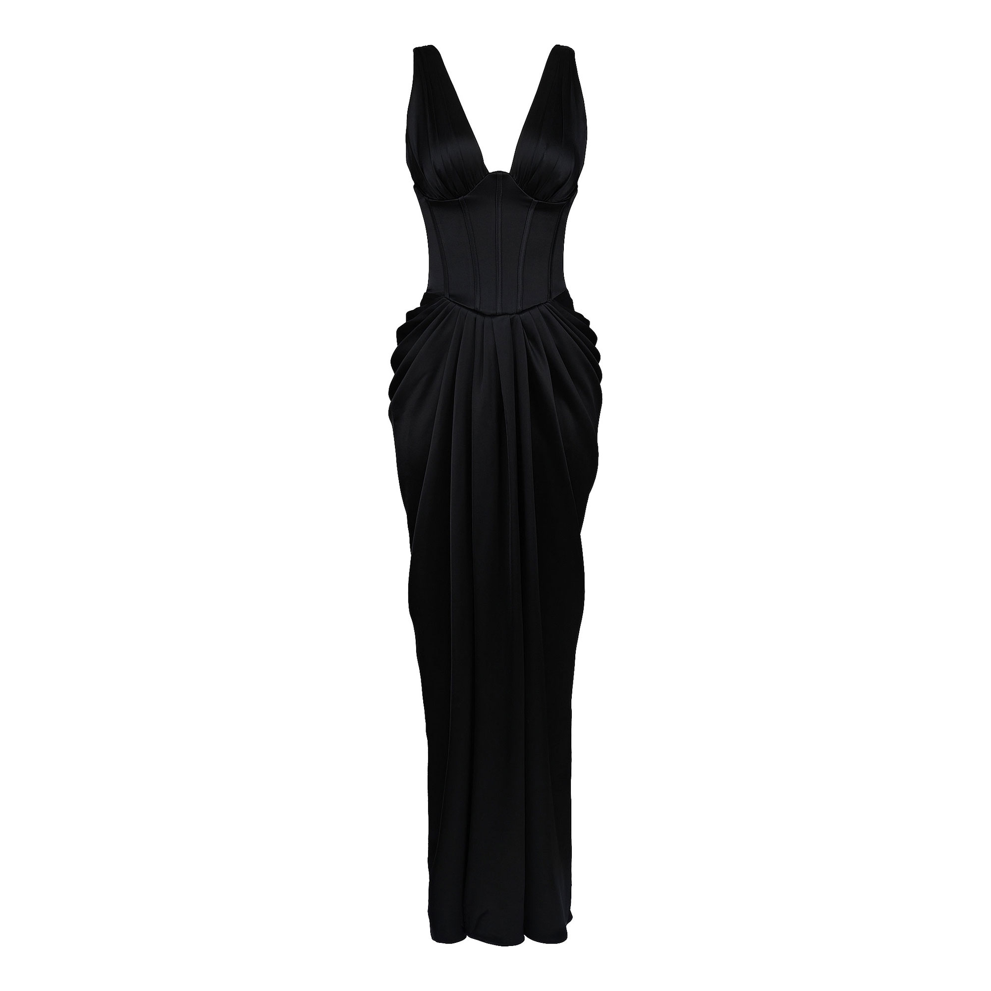 - Satin fabric, hourglass silhouette, bodice with boning, stretch-fused panels, soft gathered cups, plunge shape, maxi length