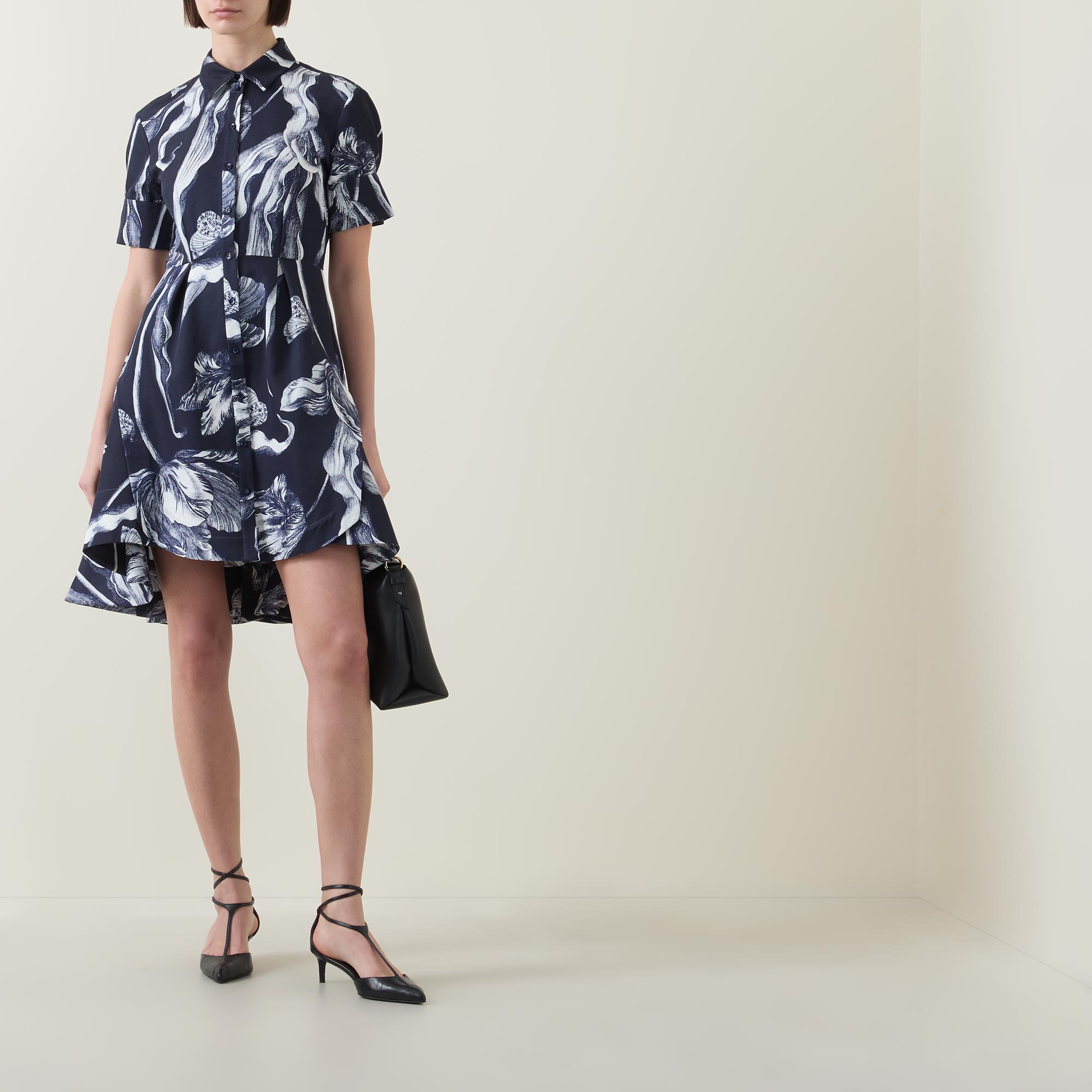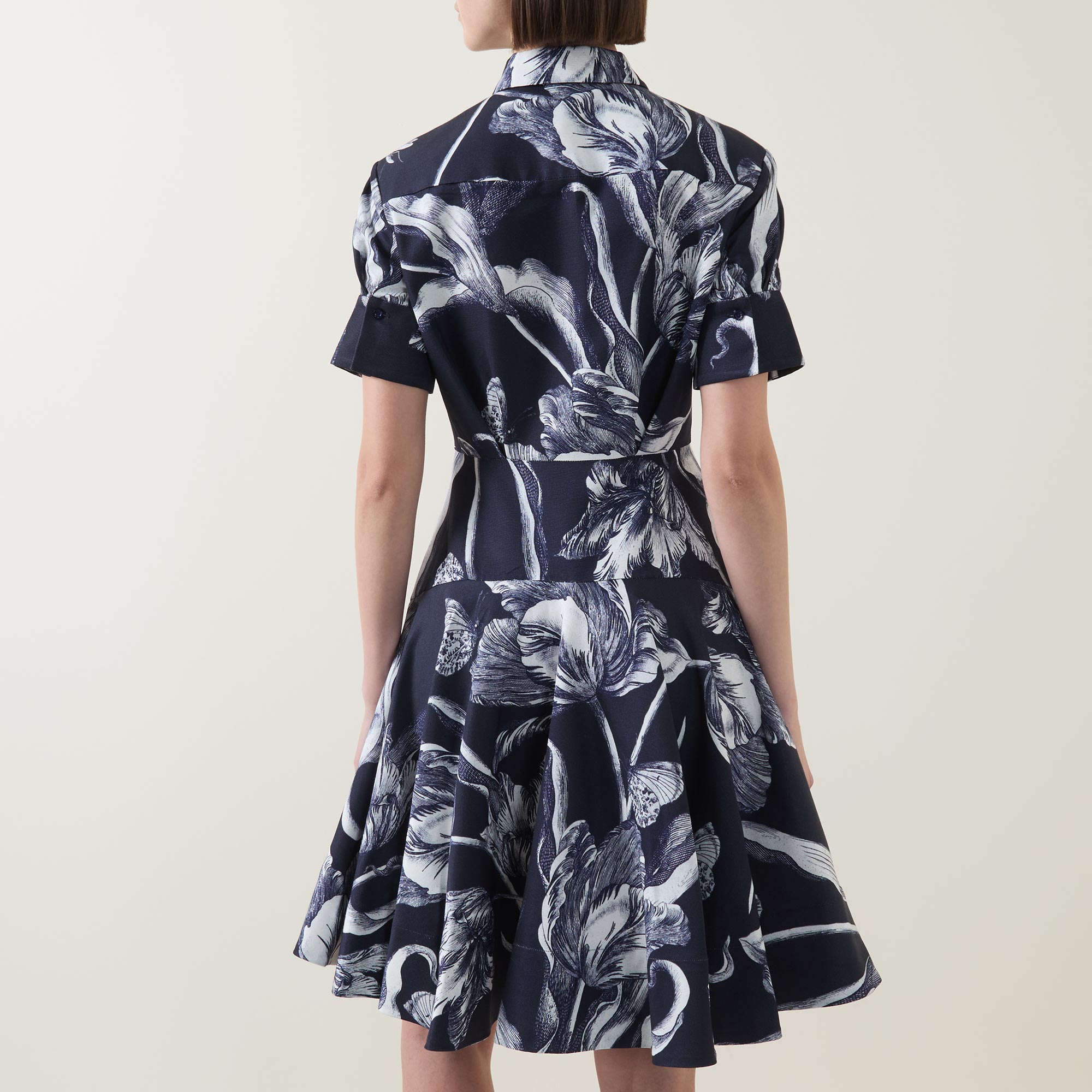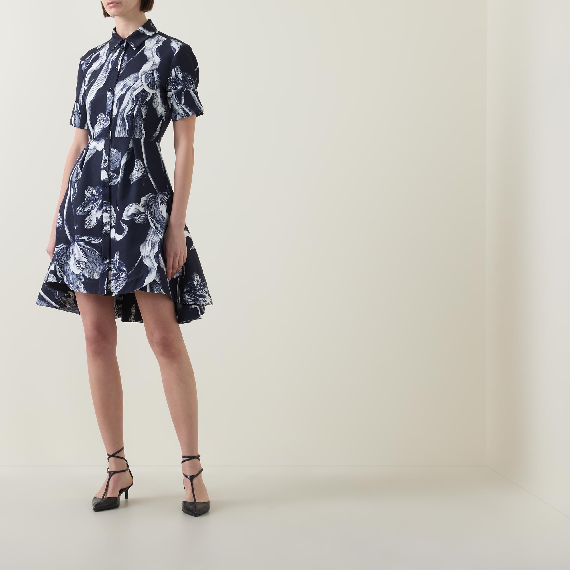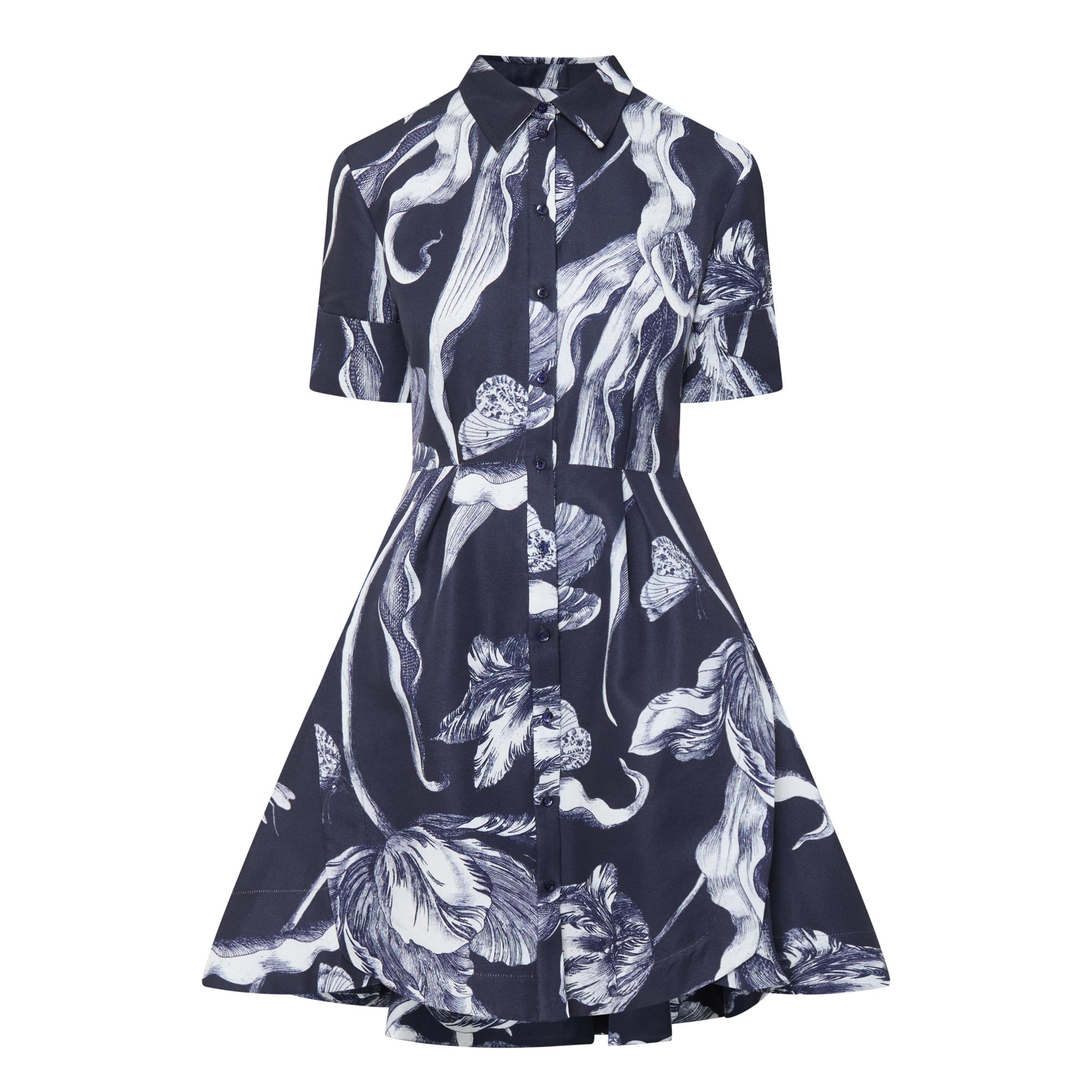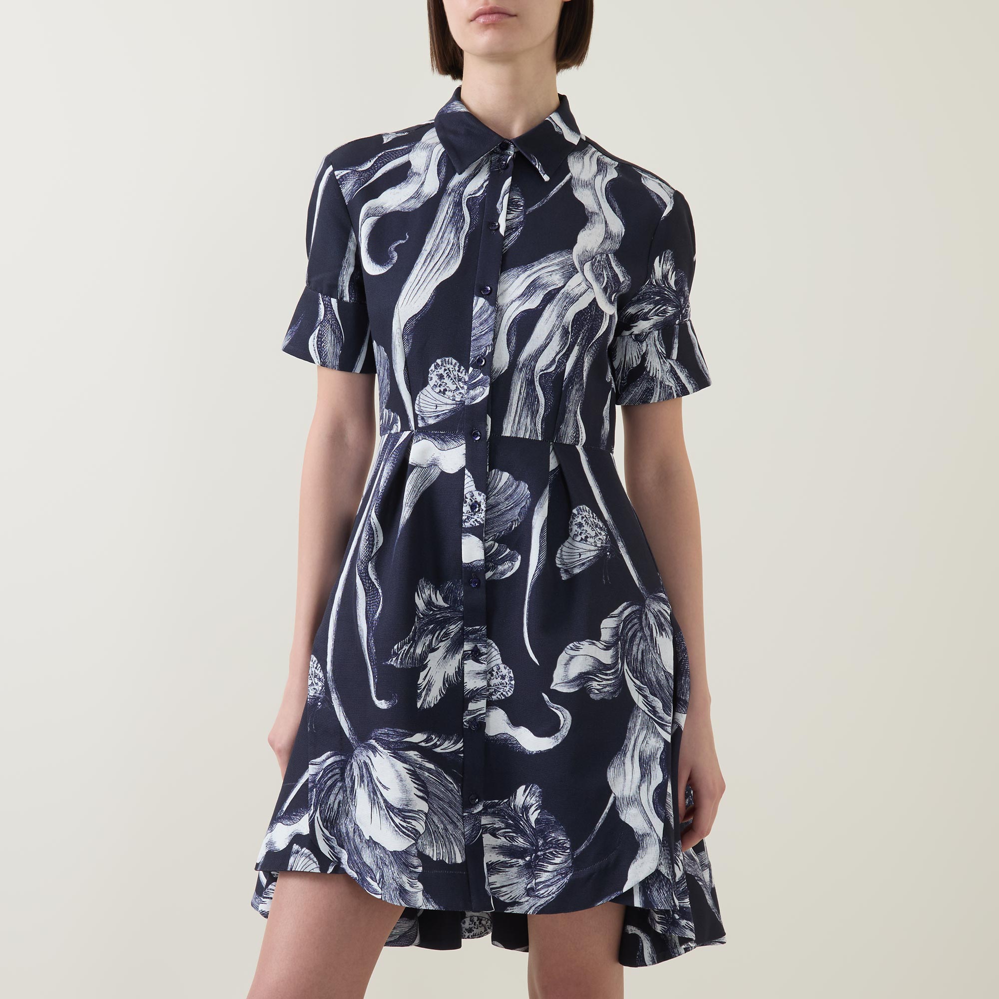 - Shirt collar, puff shoulders, short sleeves, buttoned cuffs, front button placket, fitted through the waist, flared skirt, asymmetric hem, botanical print, mini length