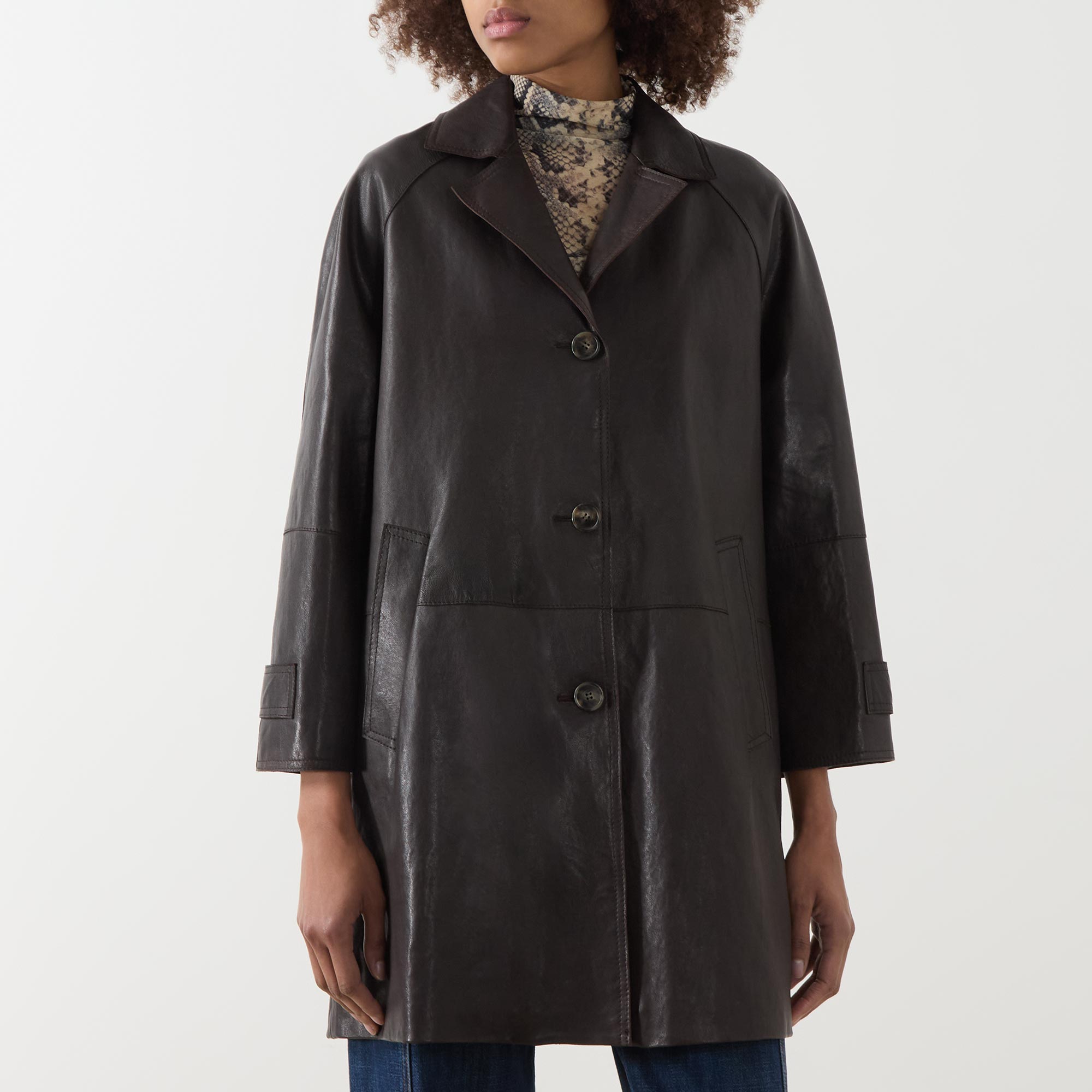 - Single-breasted front, long sleeves, notched lapel collar, button fastening, two side in-seam pockets, adjustable cuffs, rear slit, smooth leather finish
