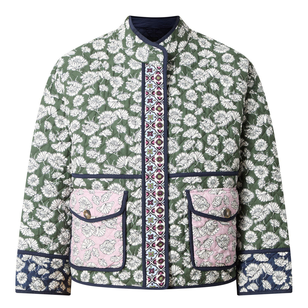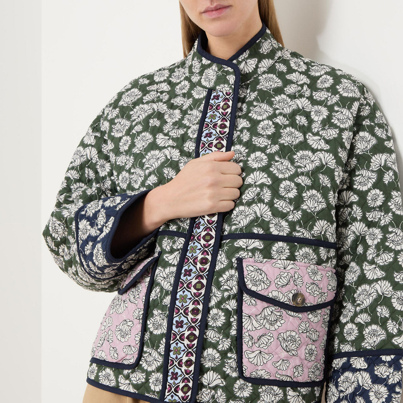 - Mandarin collar, dropped shoulders, long sleeves, concealed front button fastening, two front flap pockets with button fastening, contrast pattern detailing, slightly cropped