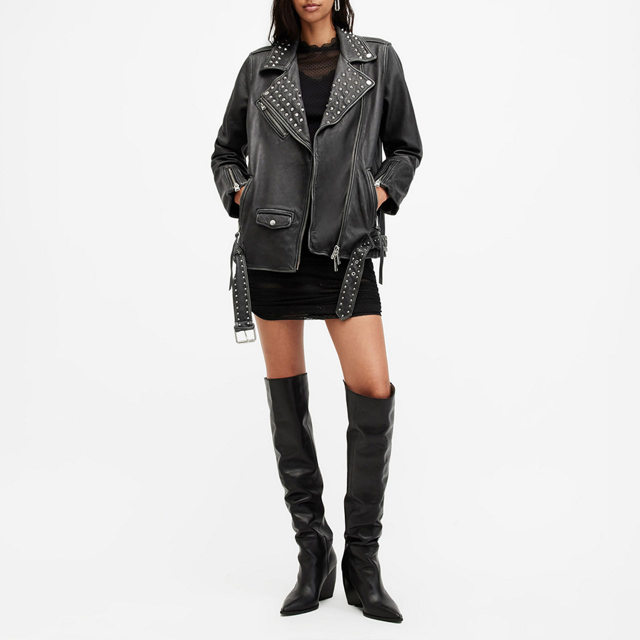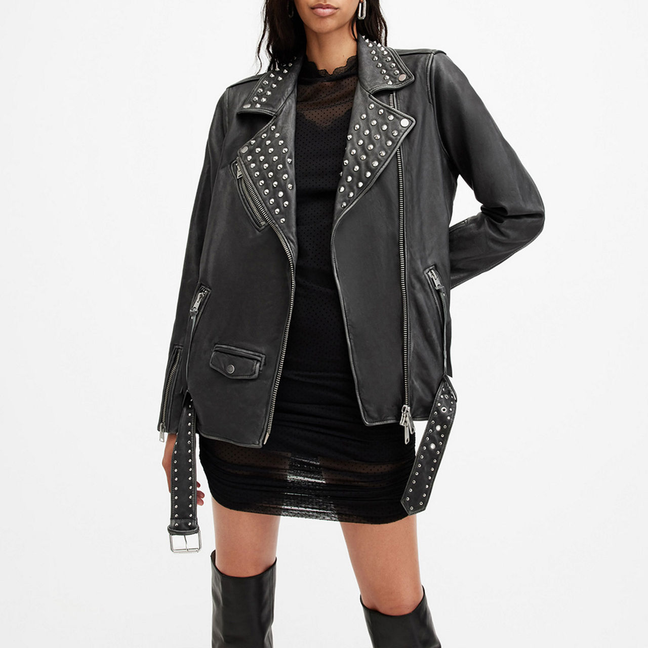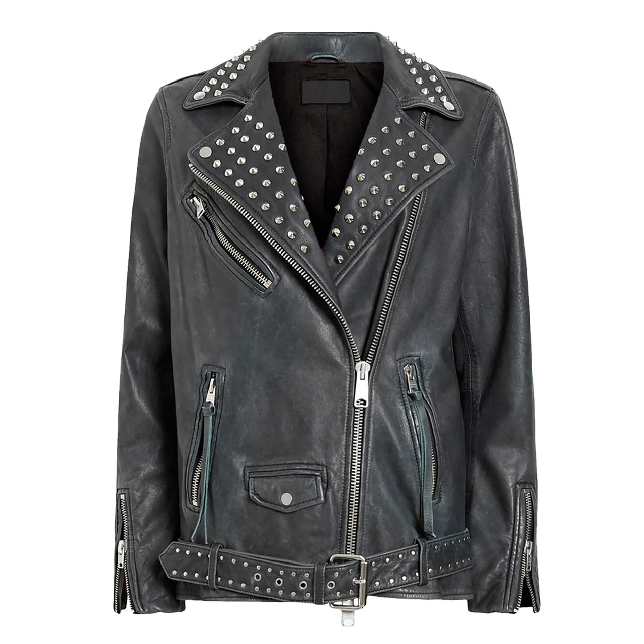 - Notched lapel, asymmetric zip fastening, stud embellishment, multiple zipped pockets, buckle belt, long sleeves with zipped cuffs, silver-tone hardware
