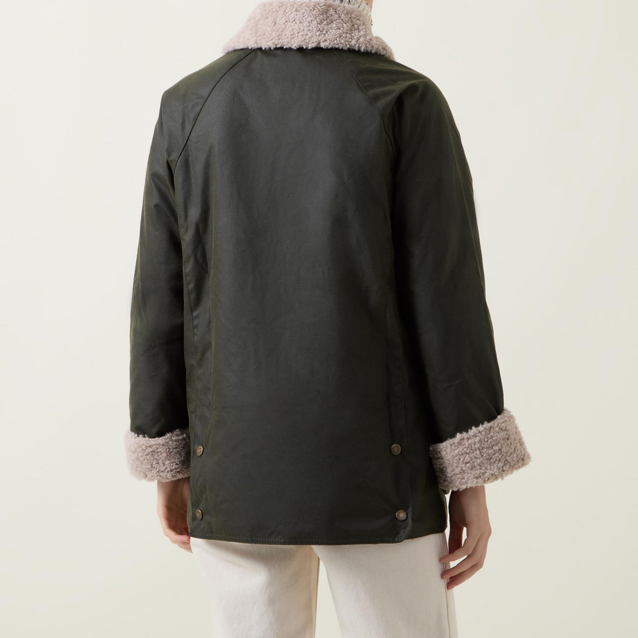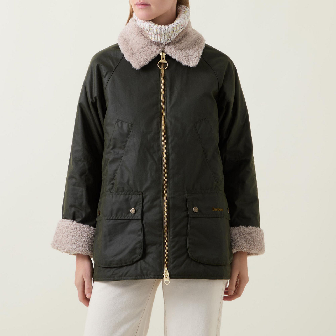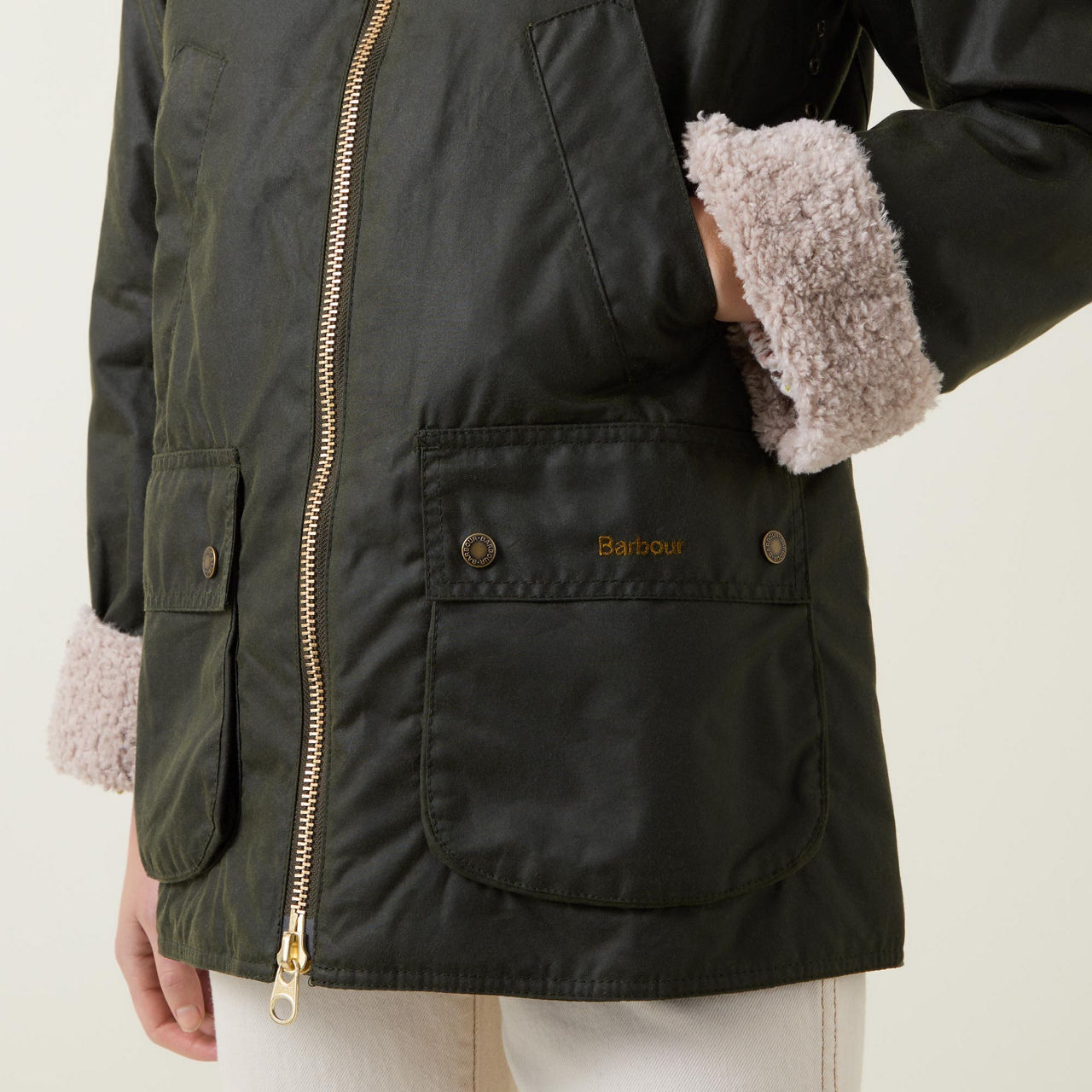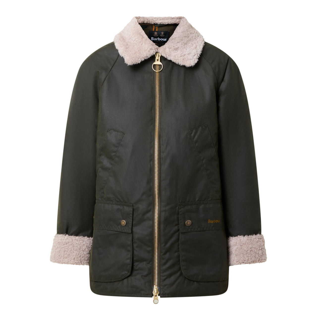 - Long sleeves, shearling-lined collar and cuffs, zip-through fastening, slit pockets, two patch pocket, logo embroidery, wax coated finish