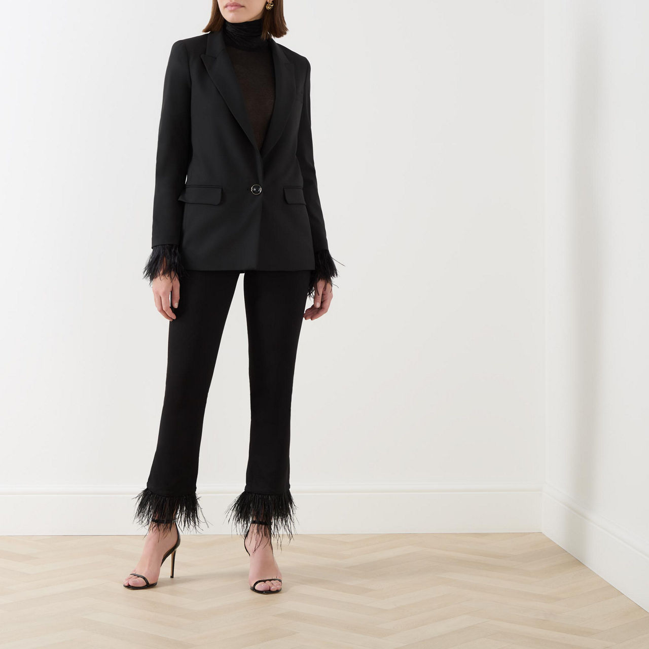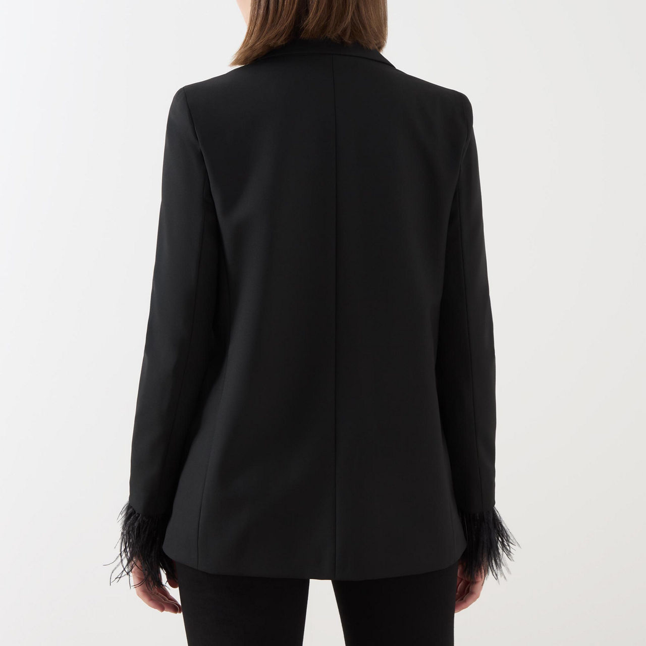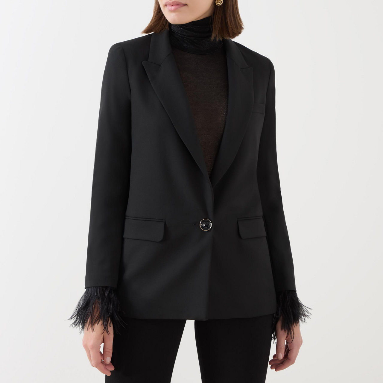 • Single-breasted, single-button closure, peak lapels, long sleeves, feather detailed cuffs, hip flap pockets, lined