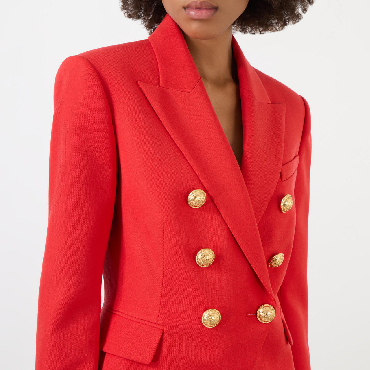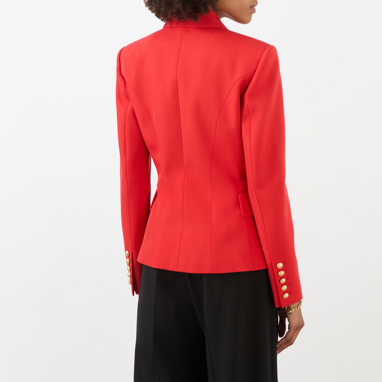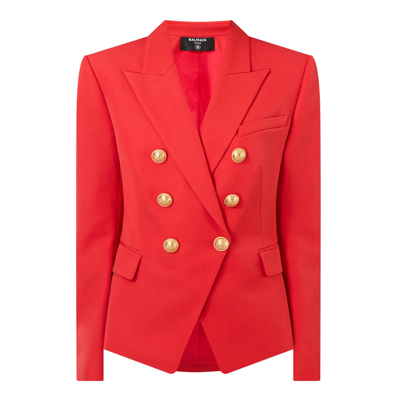 Eighties power dressing might be in full swing this season, but Balmain’s bold tailoring has always been retro-inspired. Take this blazer; designed in an asymmetrical double-breasted silhouette with exaggerated padded shoulders and a sharp nipped waist, it’s finished with six gold crest buttons.