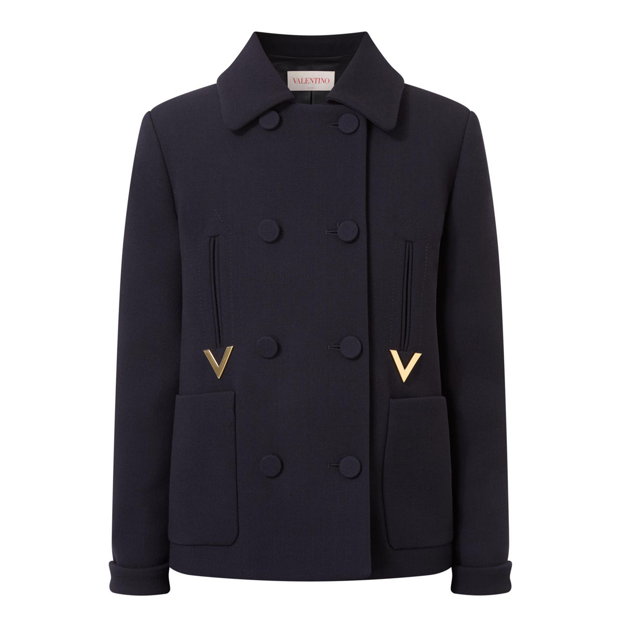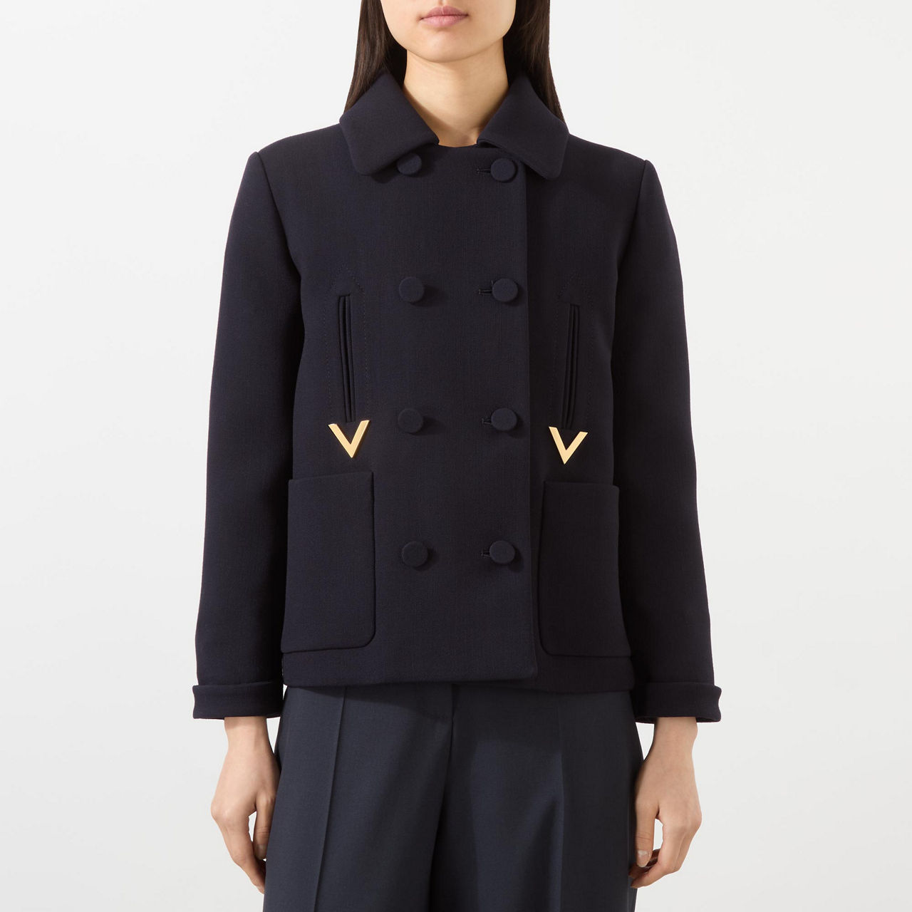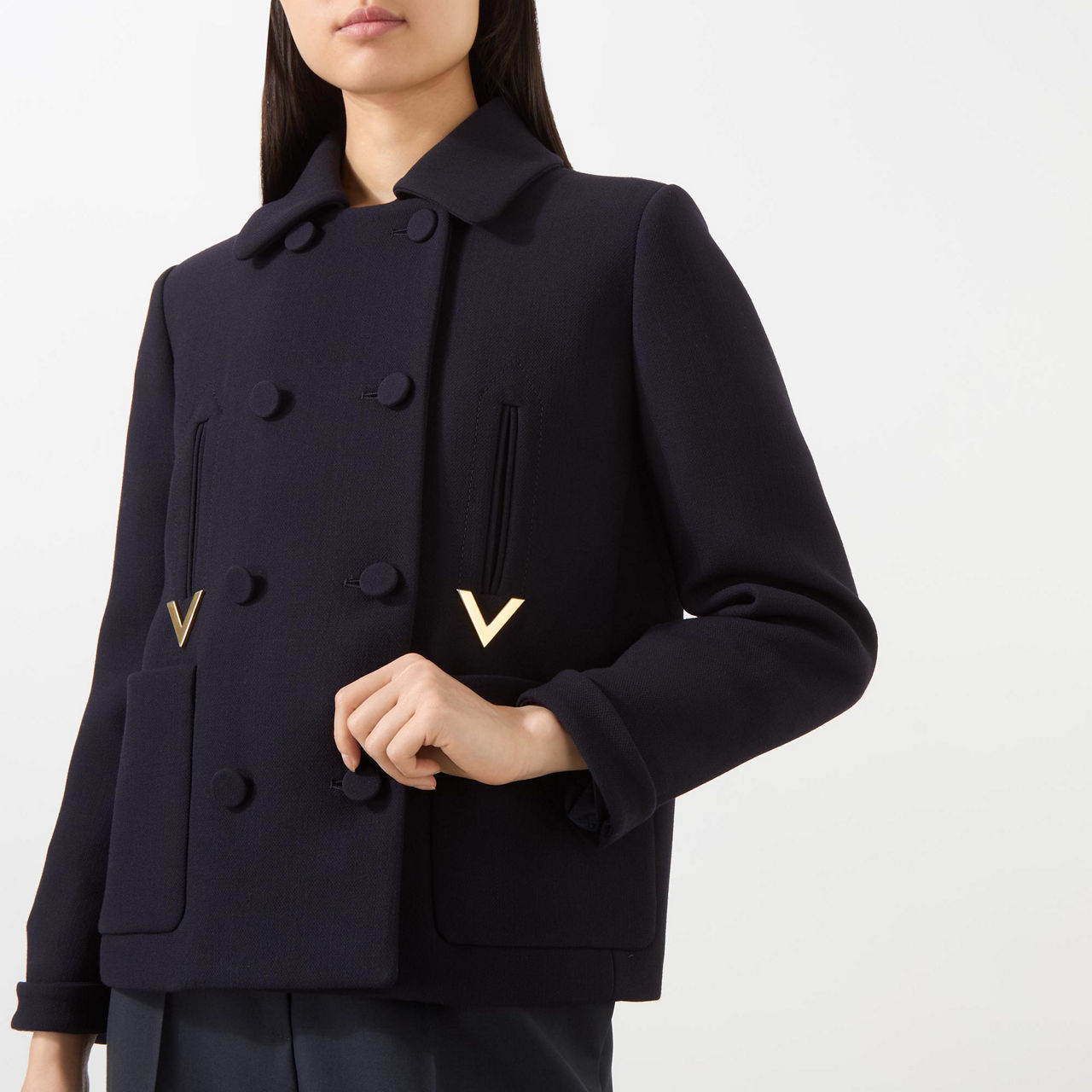 - Double-breasted front, long sleeves, spread collar, button fastening, two welt chest pockets, two side patch pockets, gold-tone V logo hardware, short length