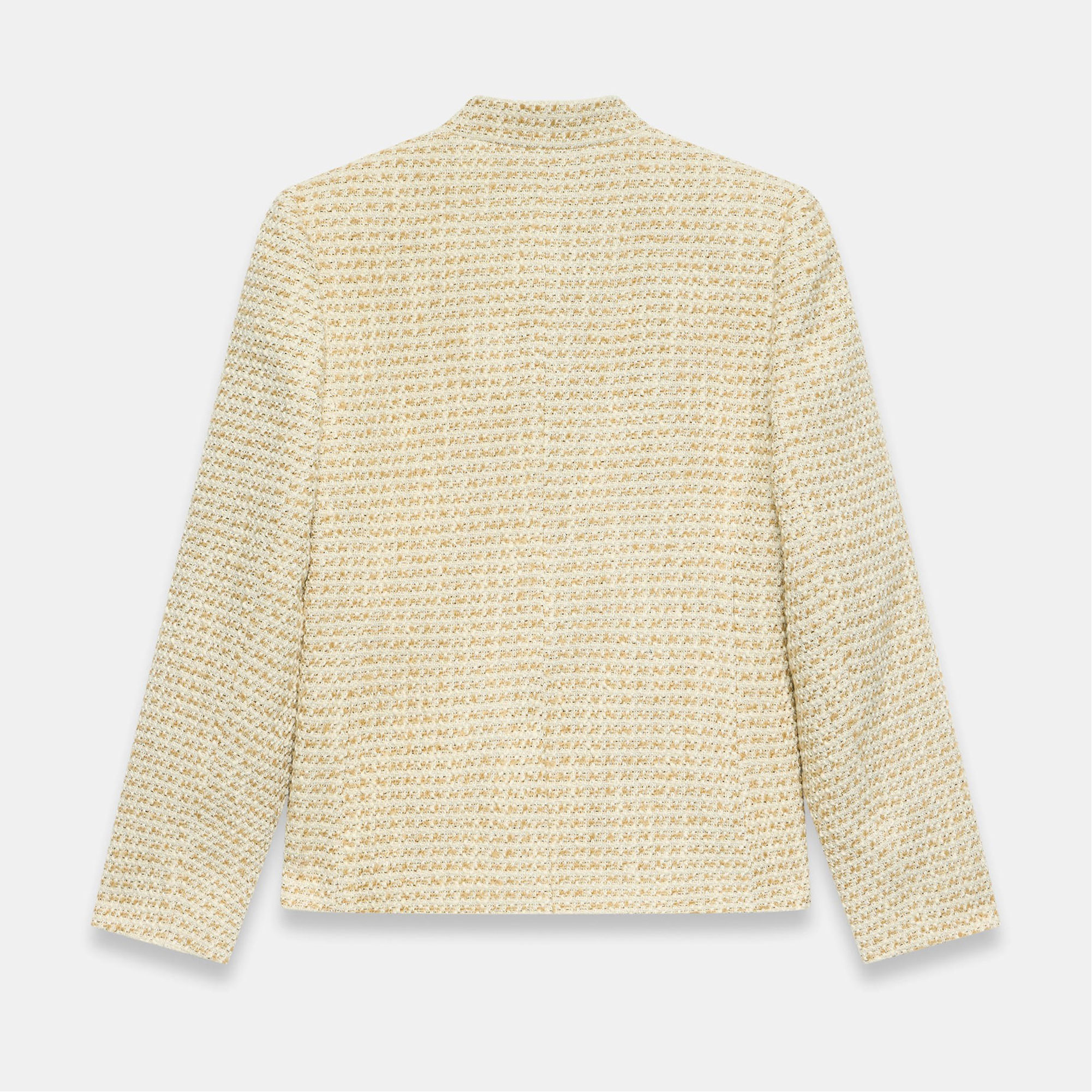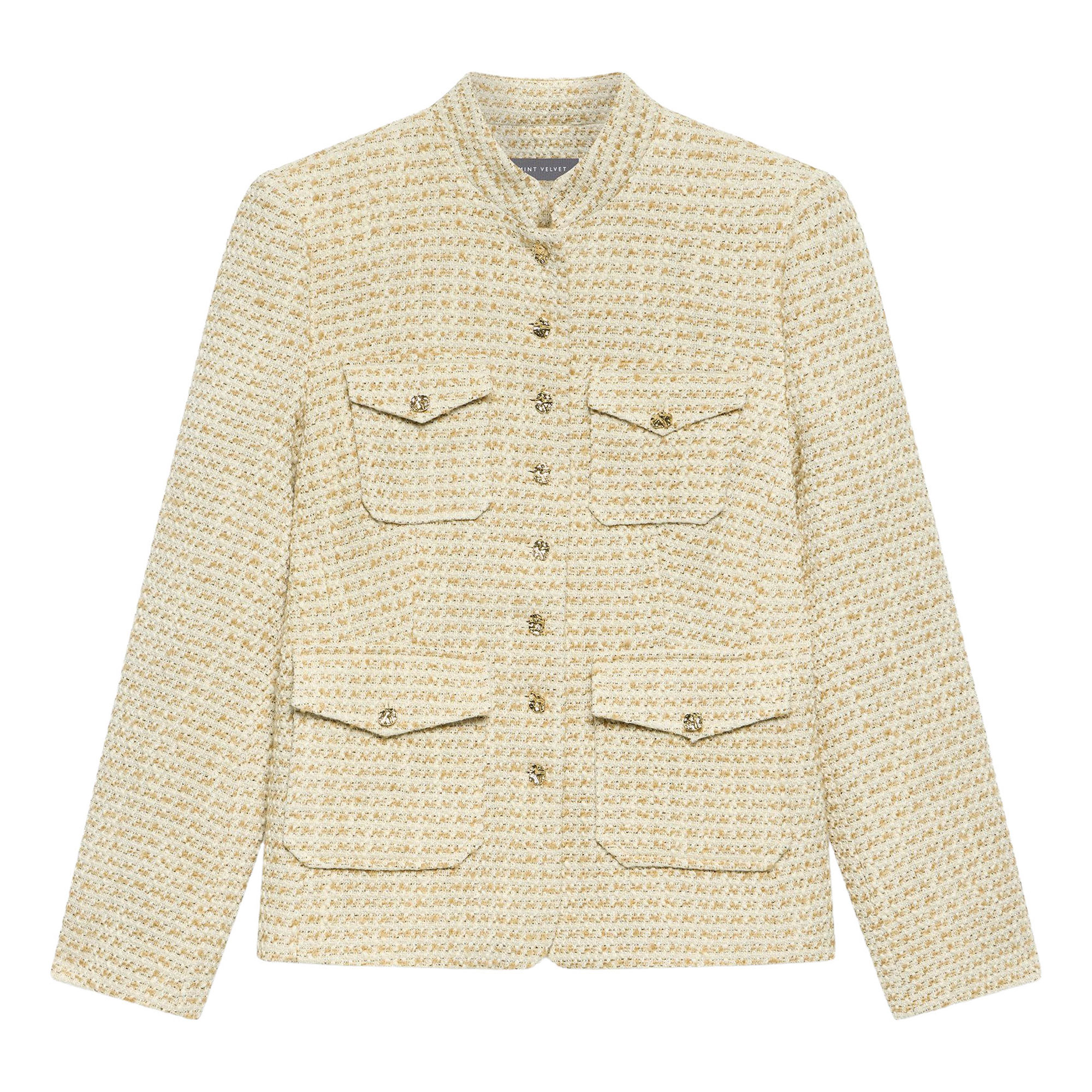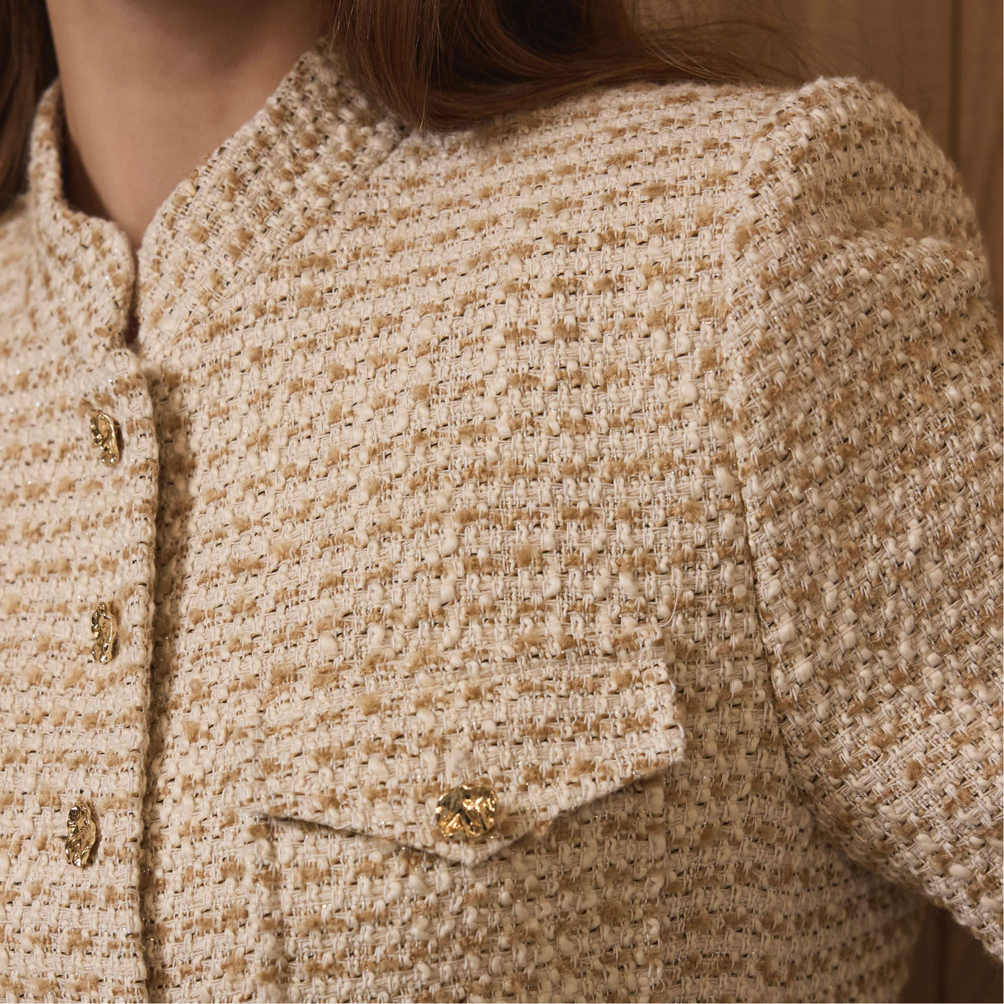 - High neckline, long sleeves, button-down pockets, gold-tone buttons, bouclé finish