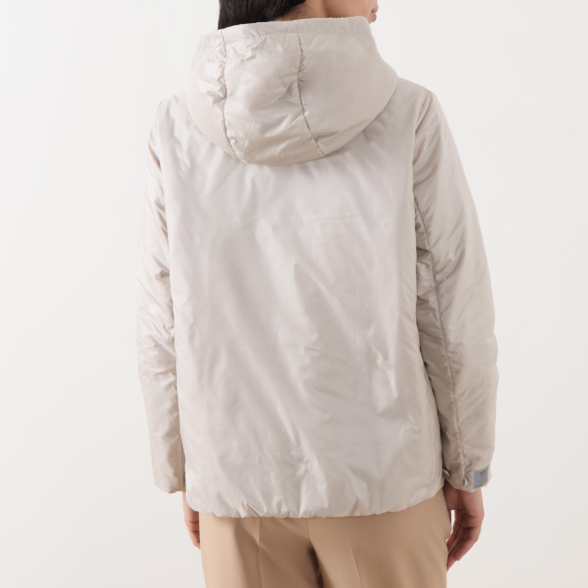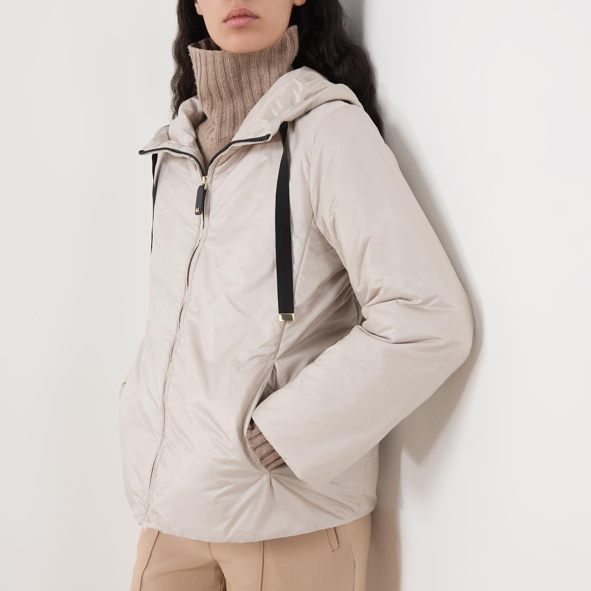 - Adjustable drawstring hood, frontal zip-fastening, gold-toned details, slit pockets, logo patch on right sleeve, padded finish