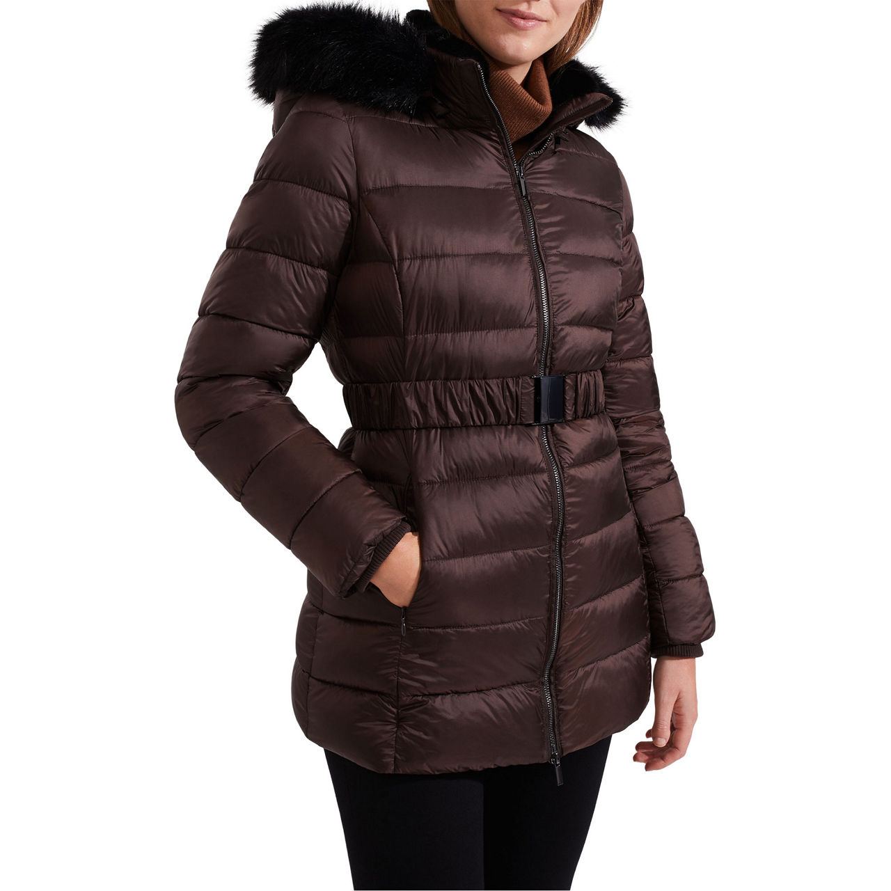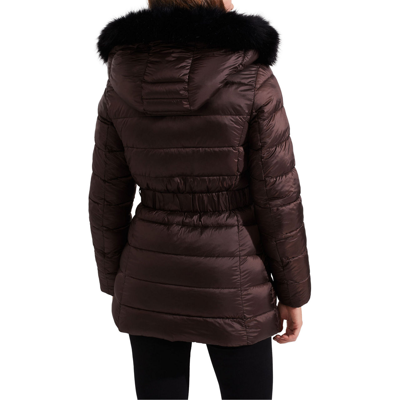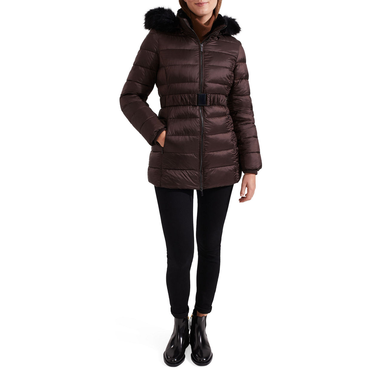 - Hood with faux fur trim, funnel neckline, zip fastening, padded, belt at waist, side entry pockets, storm guard cuffs