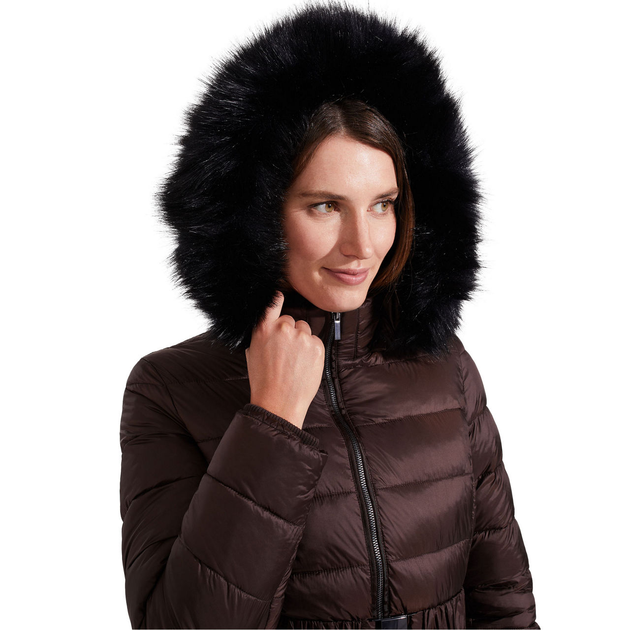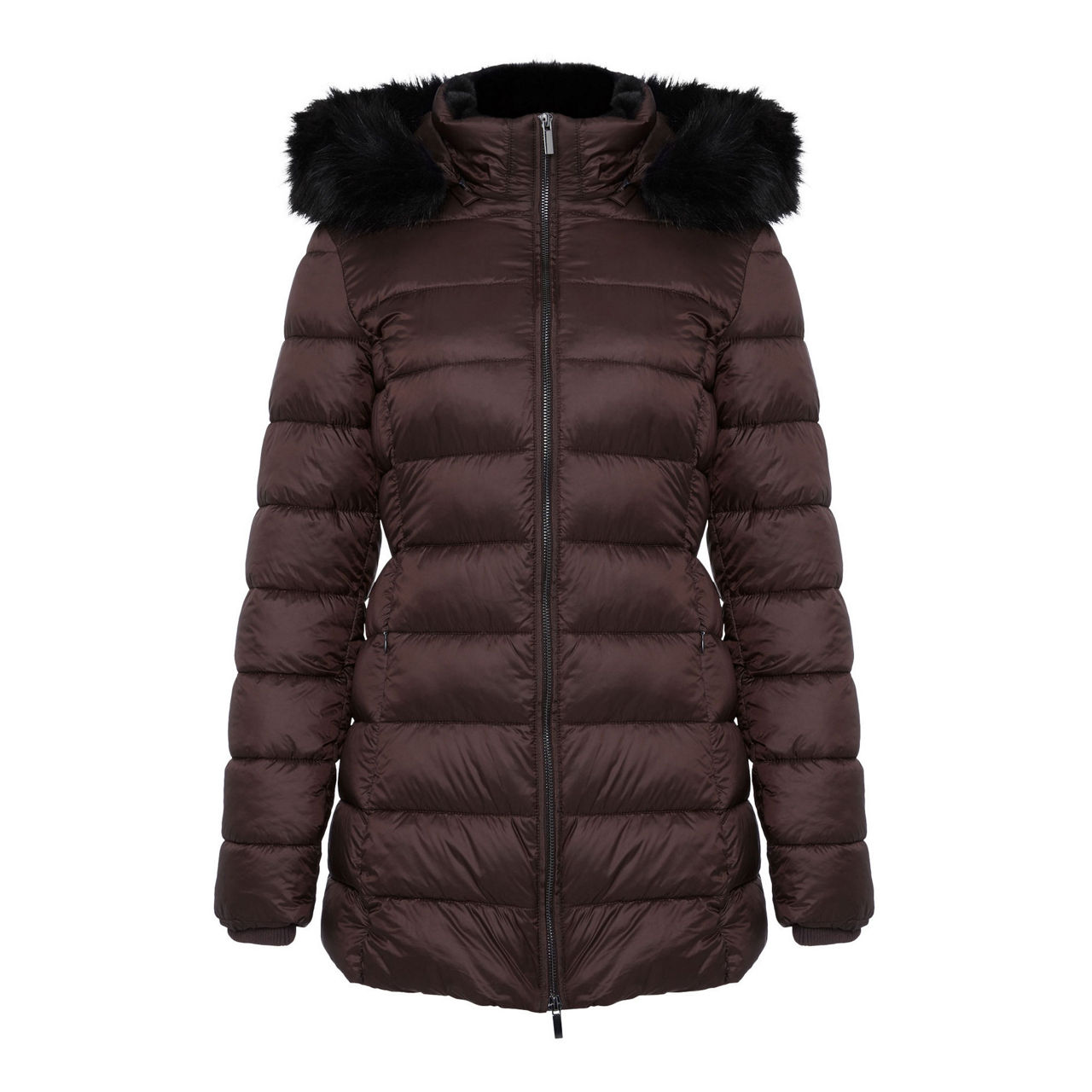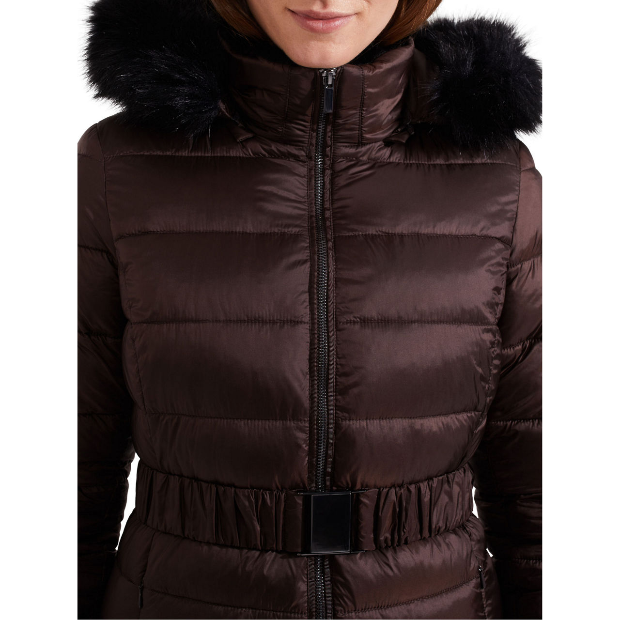 - Hood with faux fur trim, funnel neckline, zip fastening, padded, belt at waist, side entry pockets, storm guard cuffs