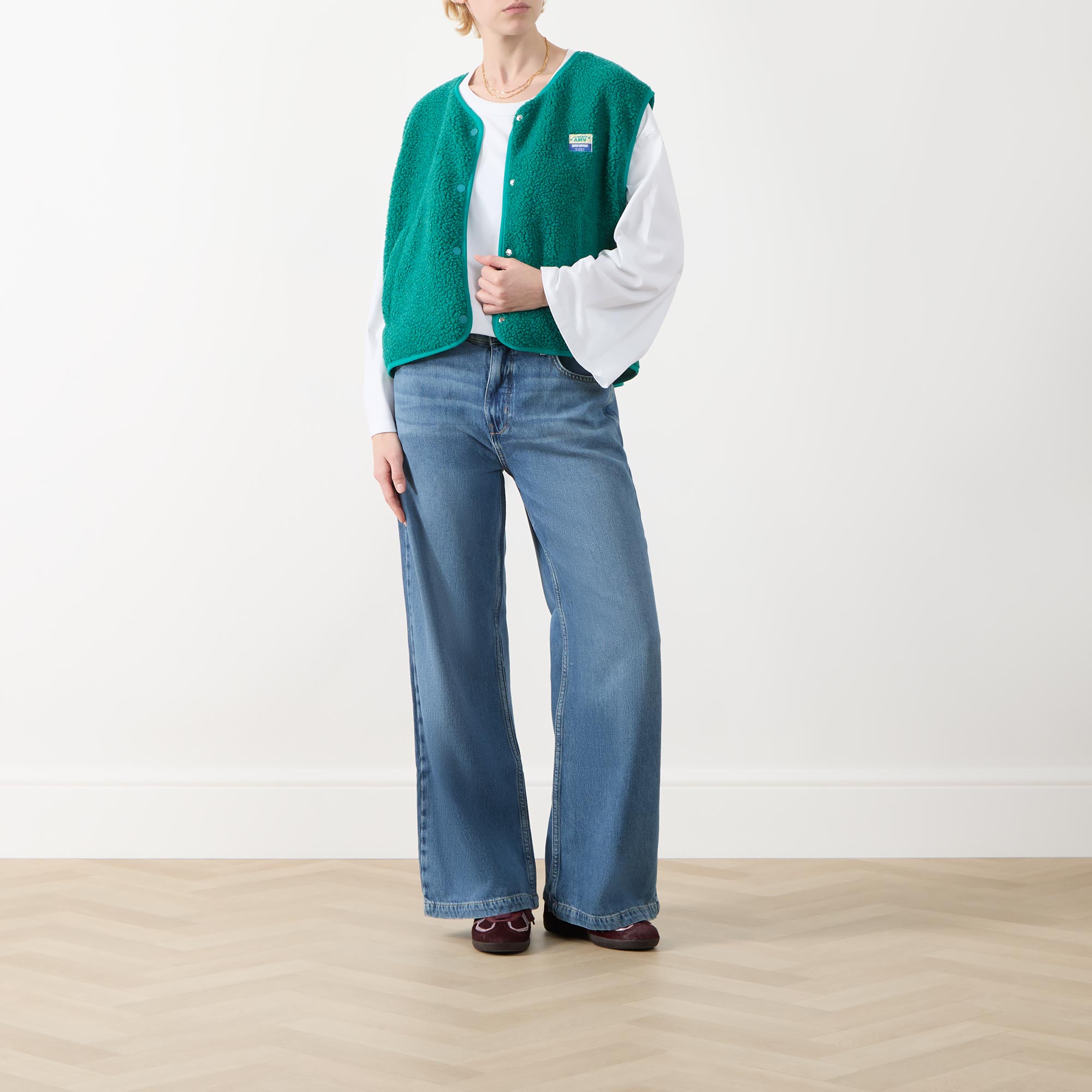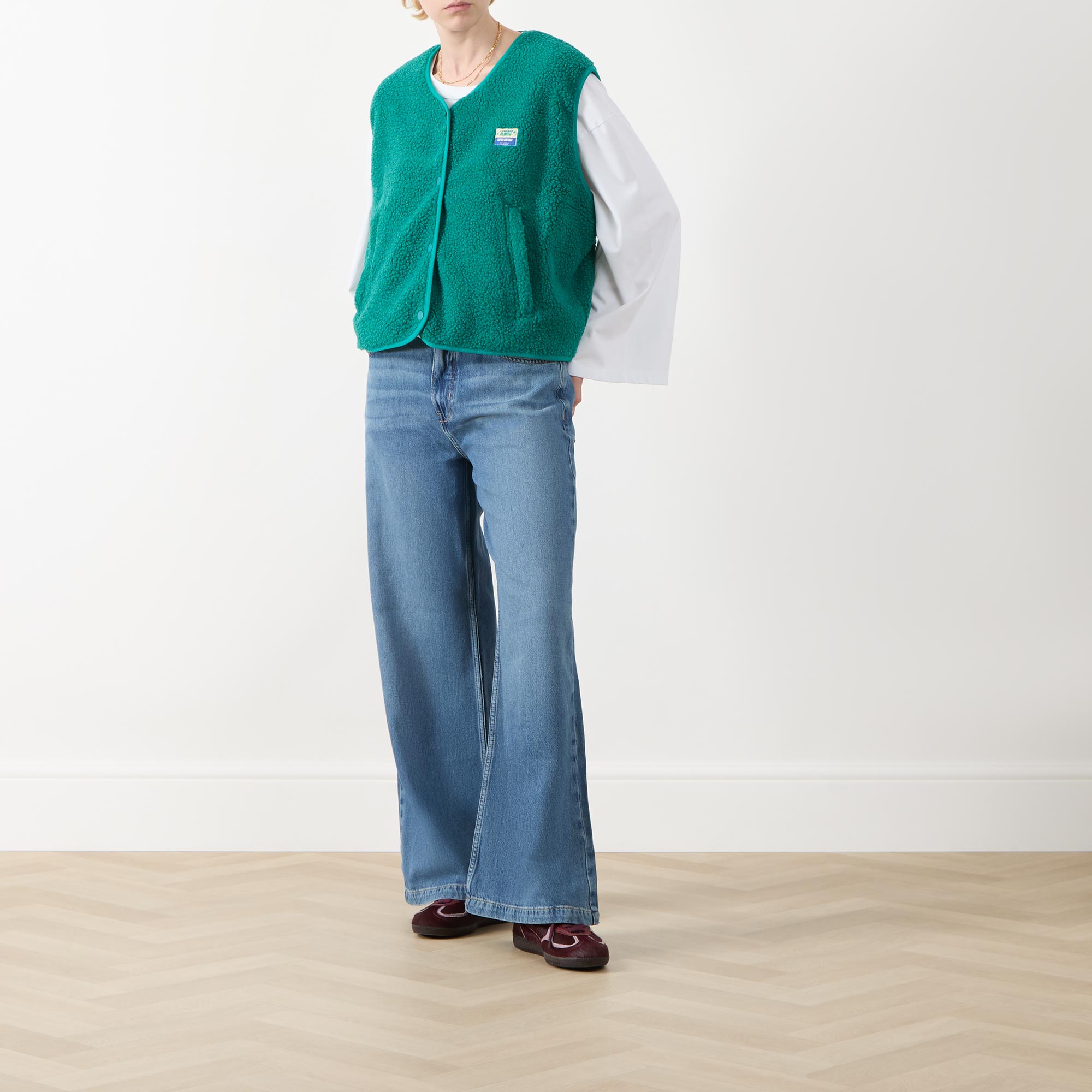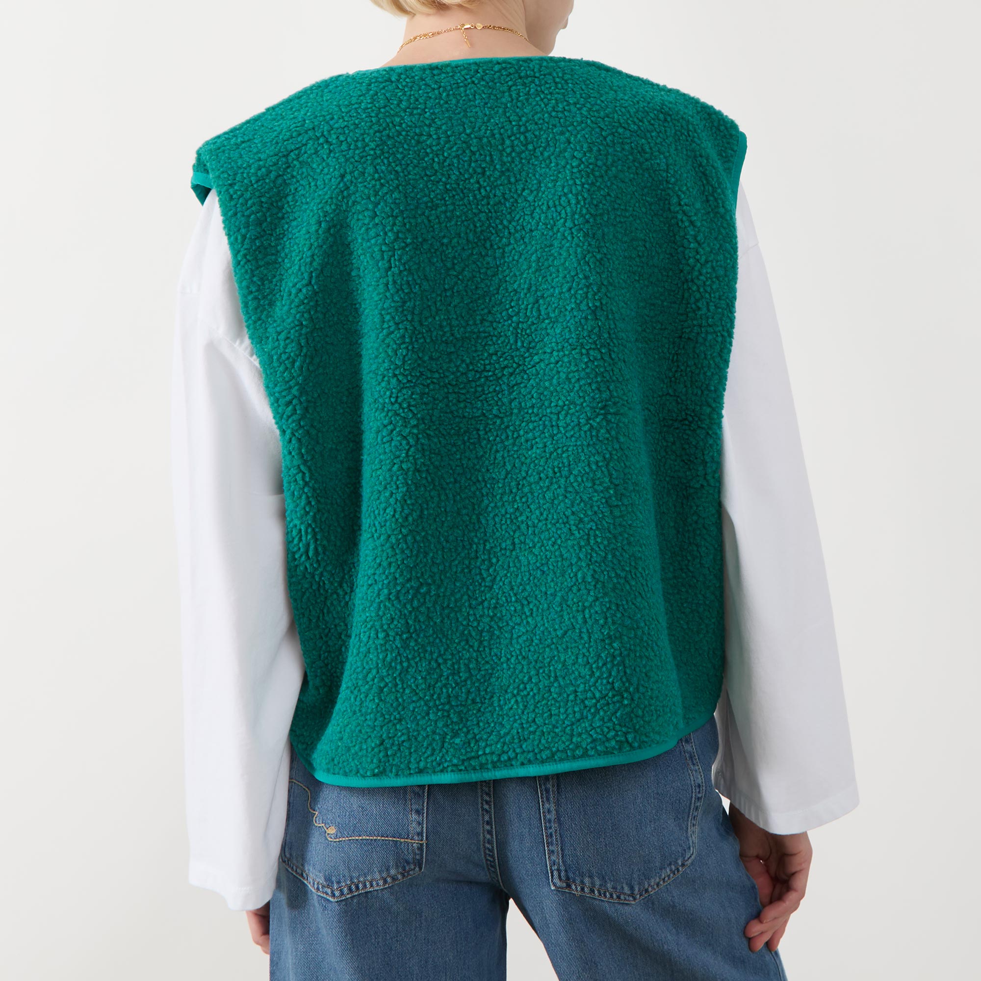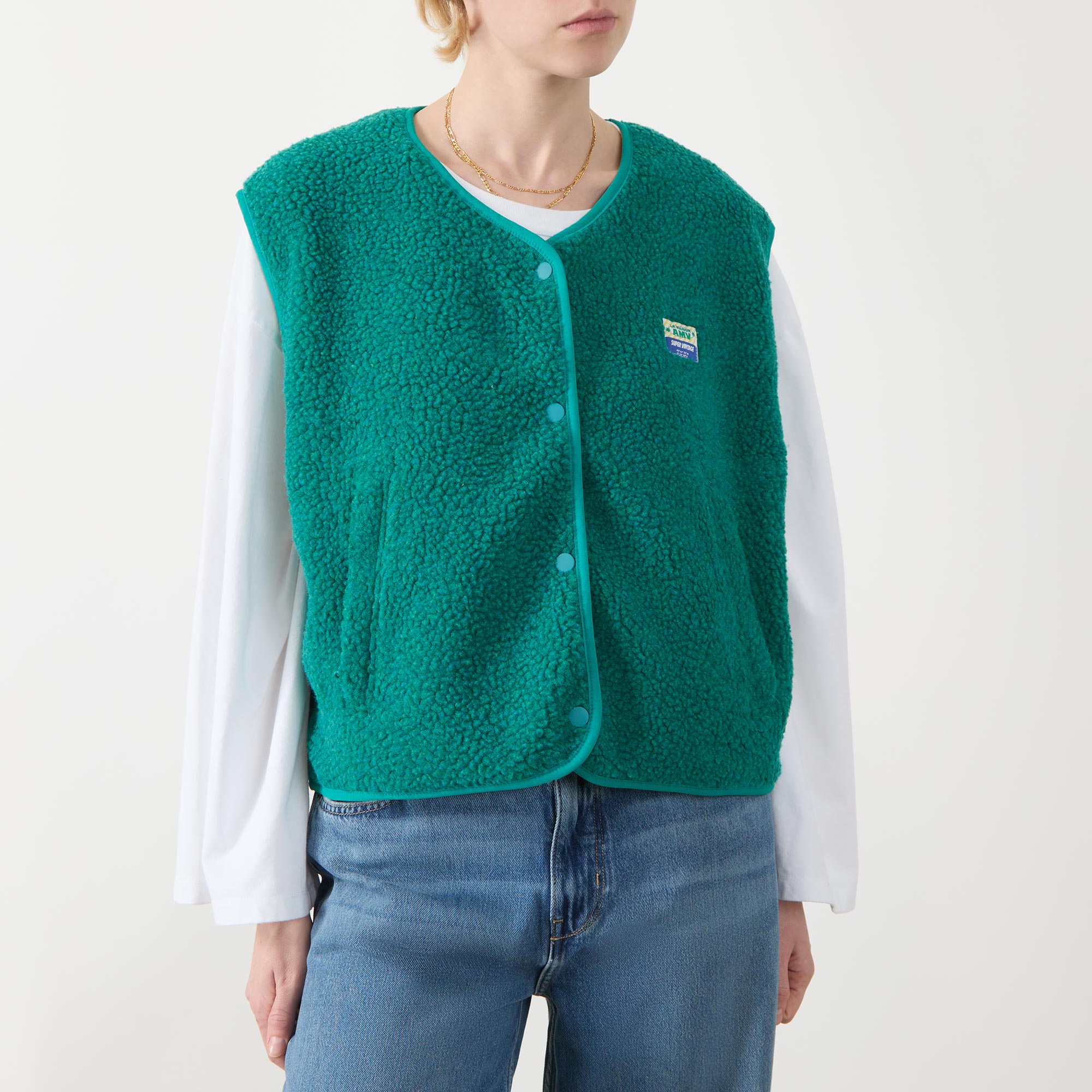 - V-neckline, sleeveless design, front popper fastening, two side entry pockets, straight hem, bound trims, logo badge, faux shearling finish