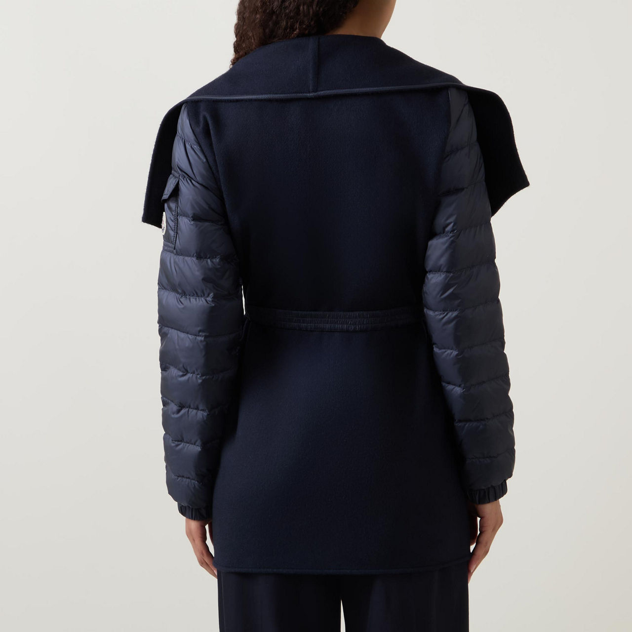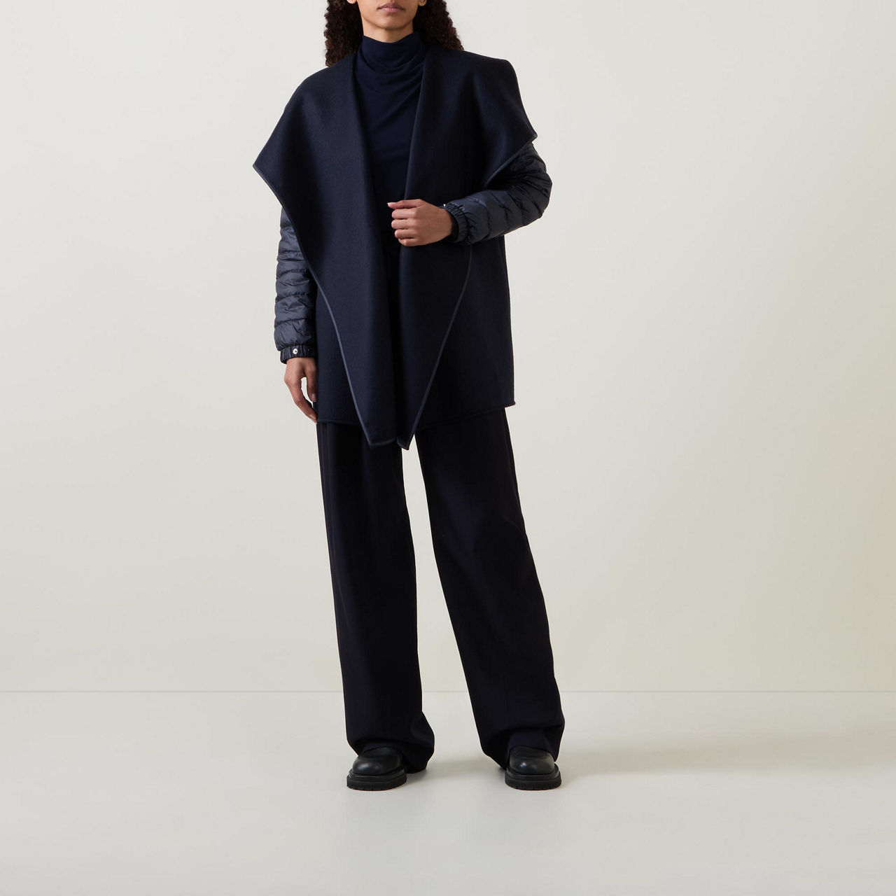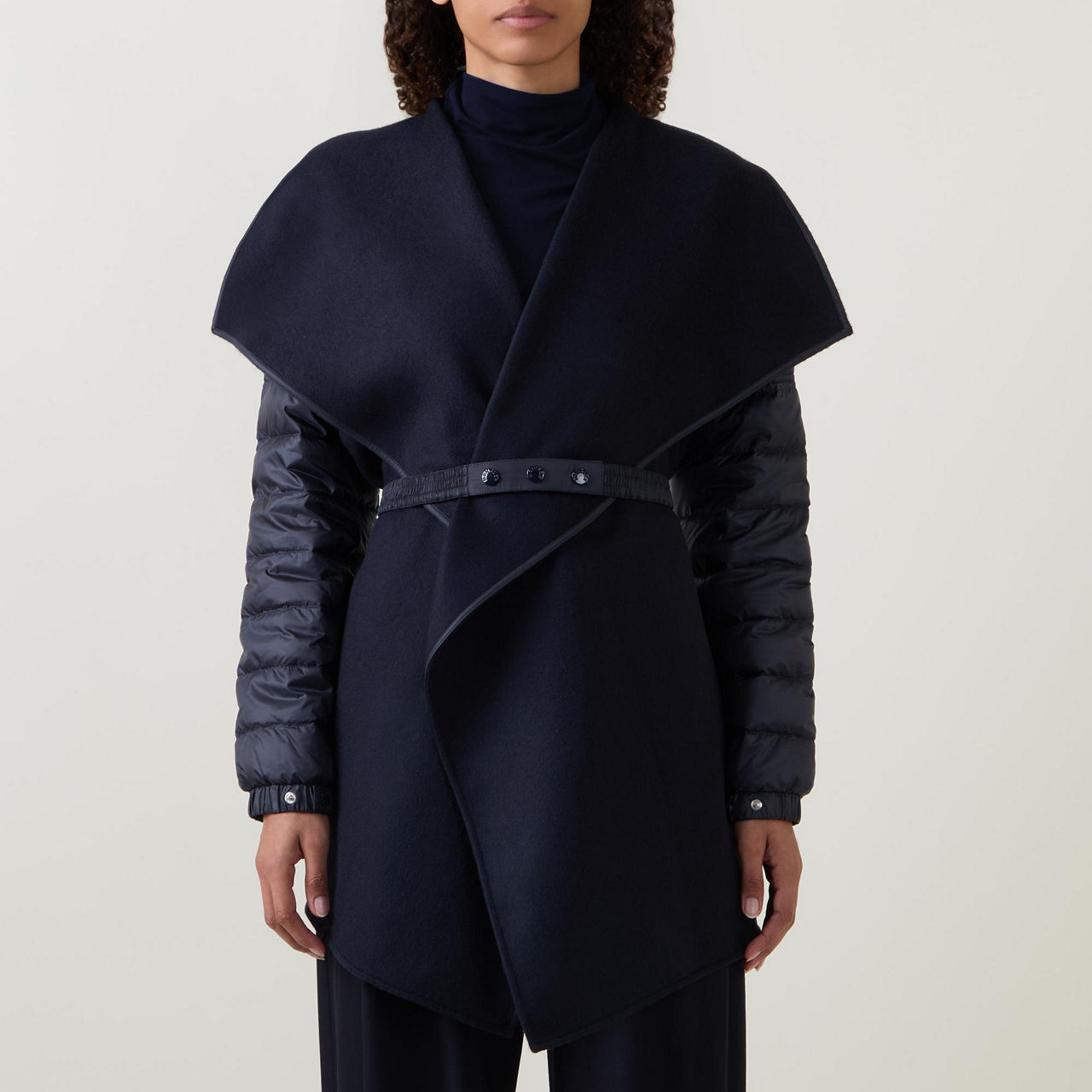 - Long down-filled padded sleeves, hybrid design, wide lapels, cape silhouette, adjustable belt, elasticated snap-button cuffs, asymmetric hemline, smooth fabric