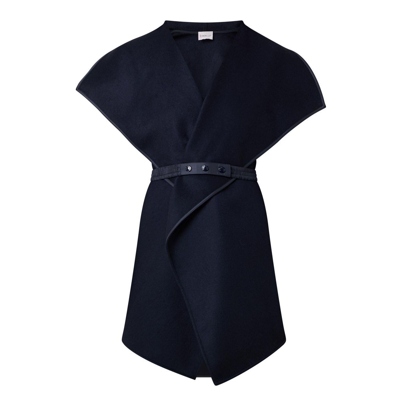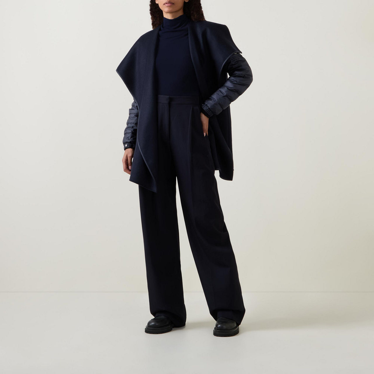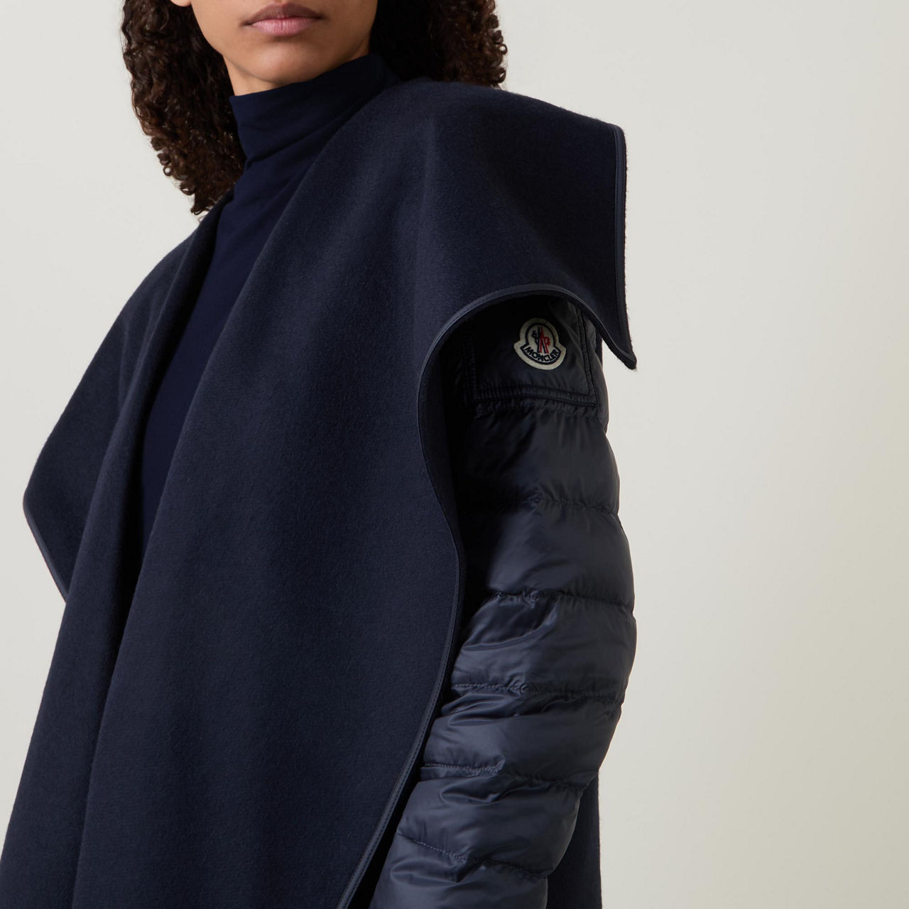- Long down-filled padded sleeves, hybrid design, wide lapels, cape silhouette, adjustable belt, elasticated snap-button cuffs, asymmetric hemline, smooth fabric