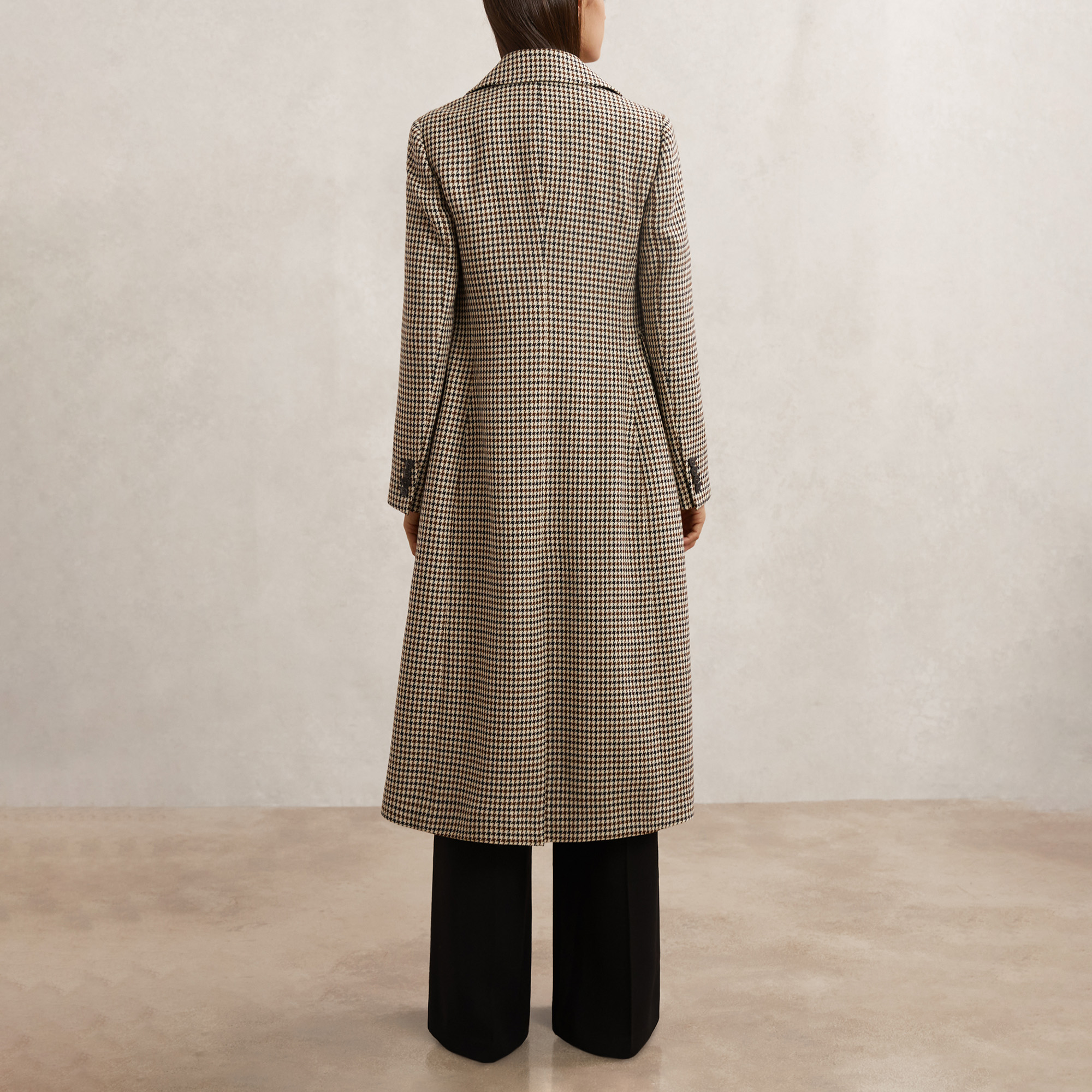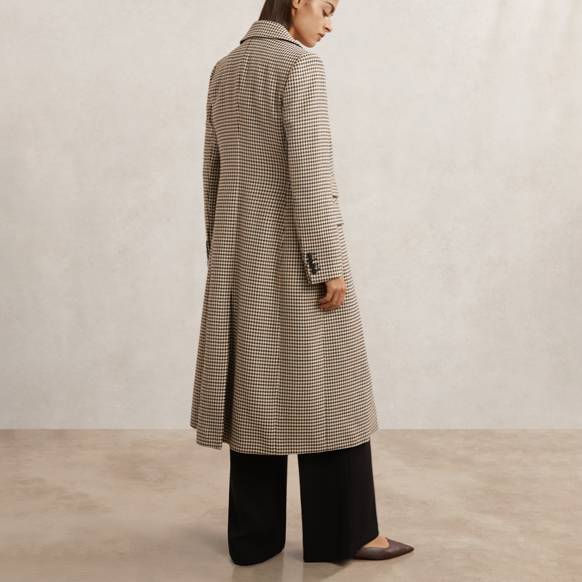 - Houndstooth check pattern, tailored style, single-breasted silhouette, notched lapels, three welt-flap pockets, buttoned cuffs, long sleeves
