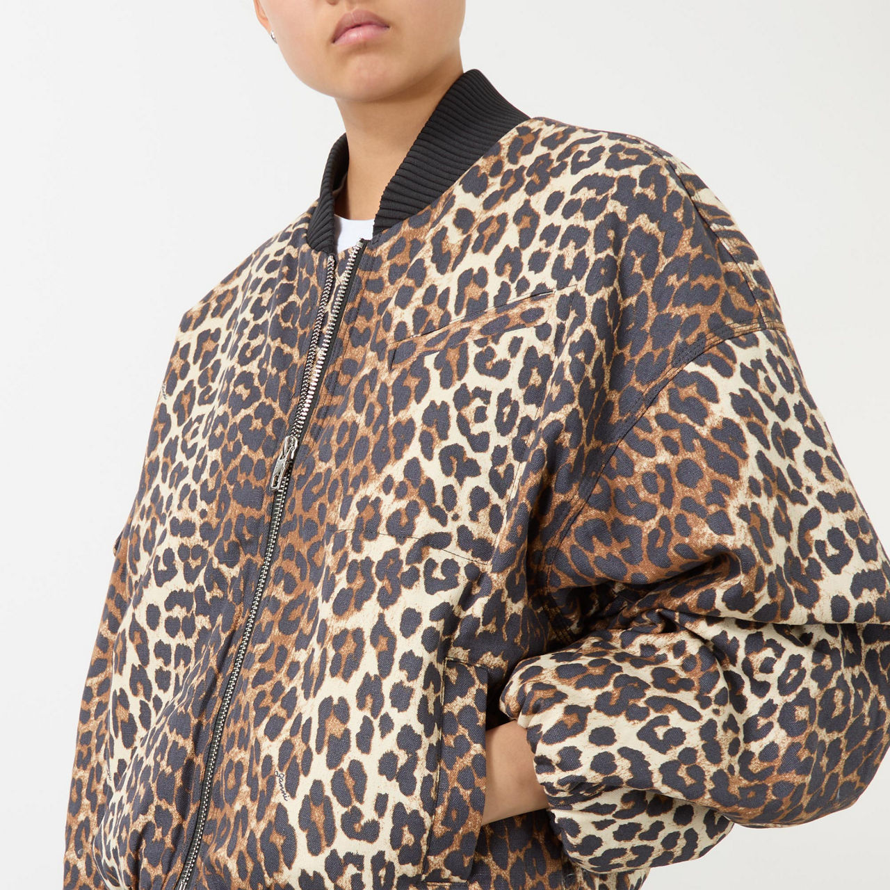 - Flat-knit bomber collar, dropped shoulders, long sleeves, elasticated cuffs, front zip fastening, one chest welt pocket, two side slit pockets, one flap pocket on the sleeve, straight elasticated hem, all-over leopard print pattern, lined, canvas finish