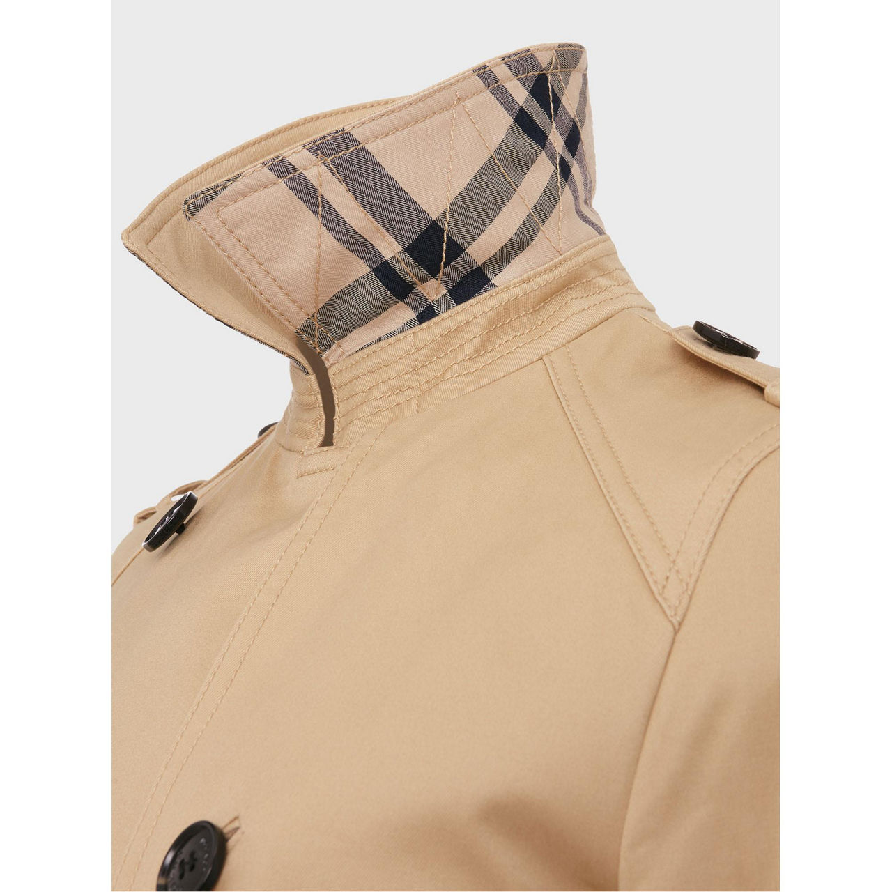- Double-breasted cut, belted waist, belted cuffs, collar, storm flap, shoulder epaulettes, shower resistant