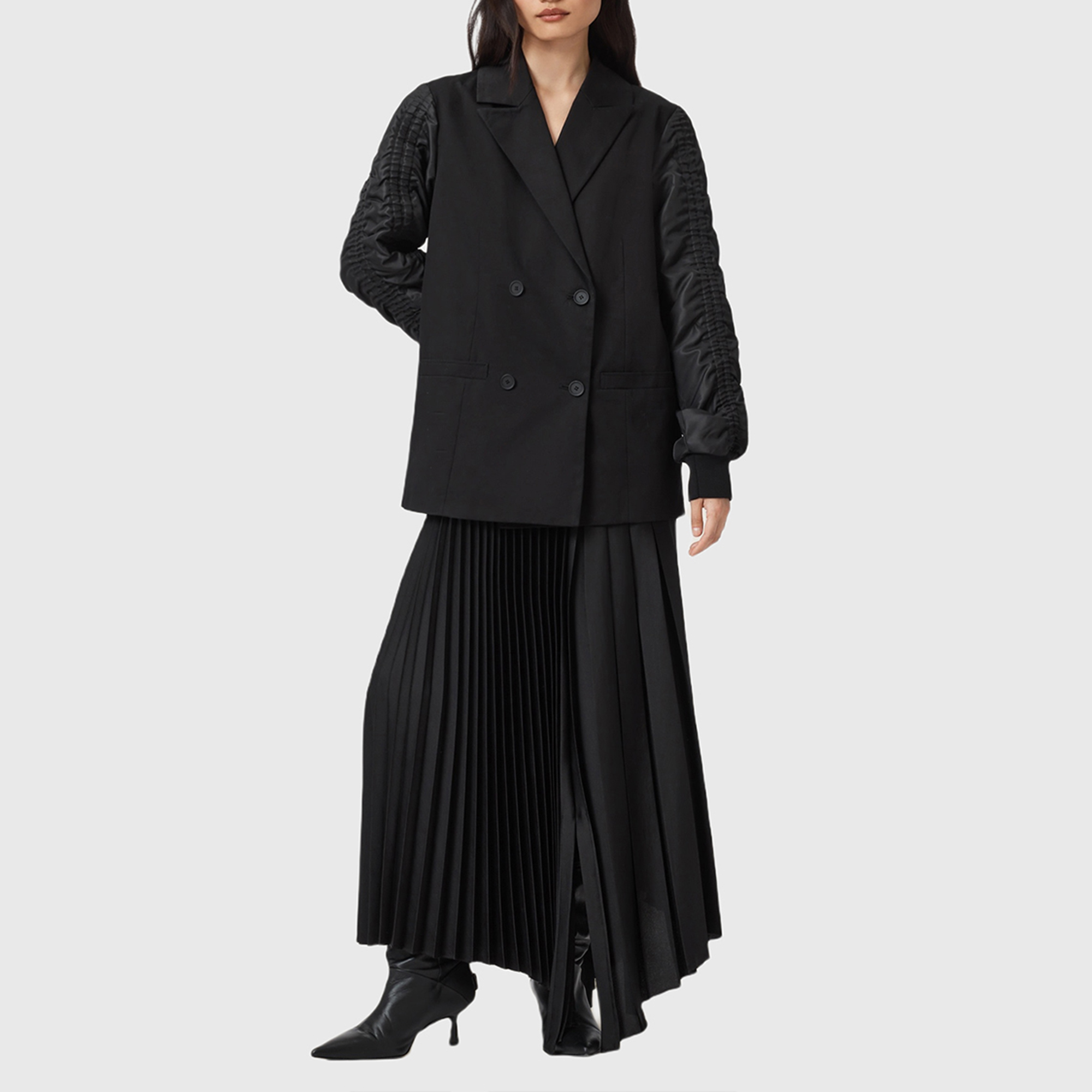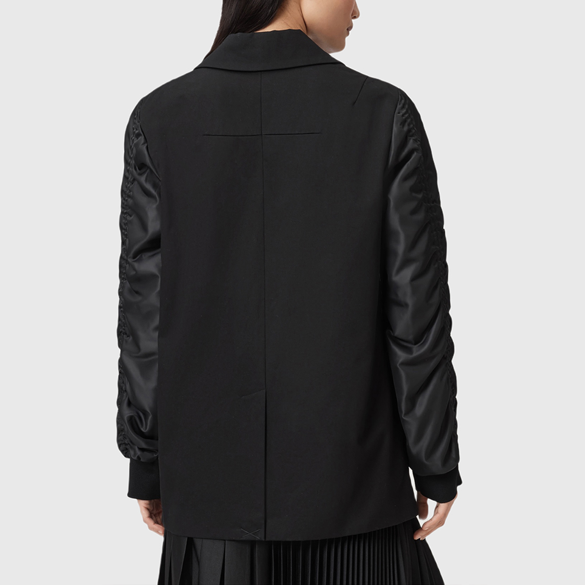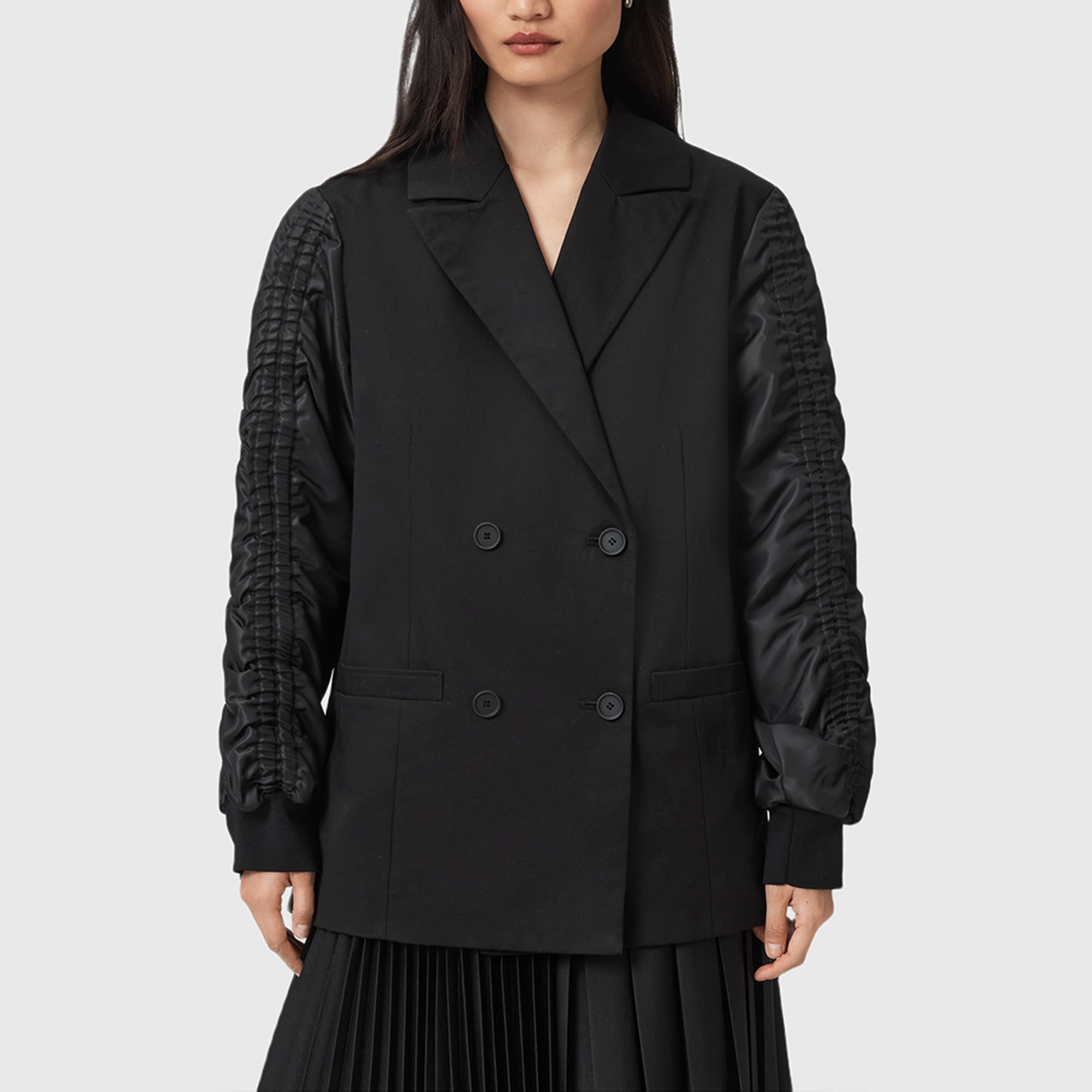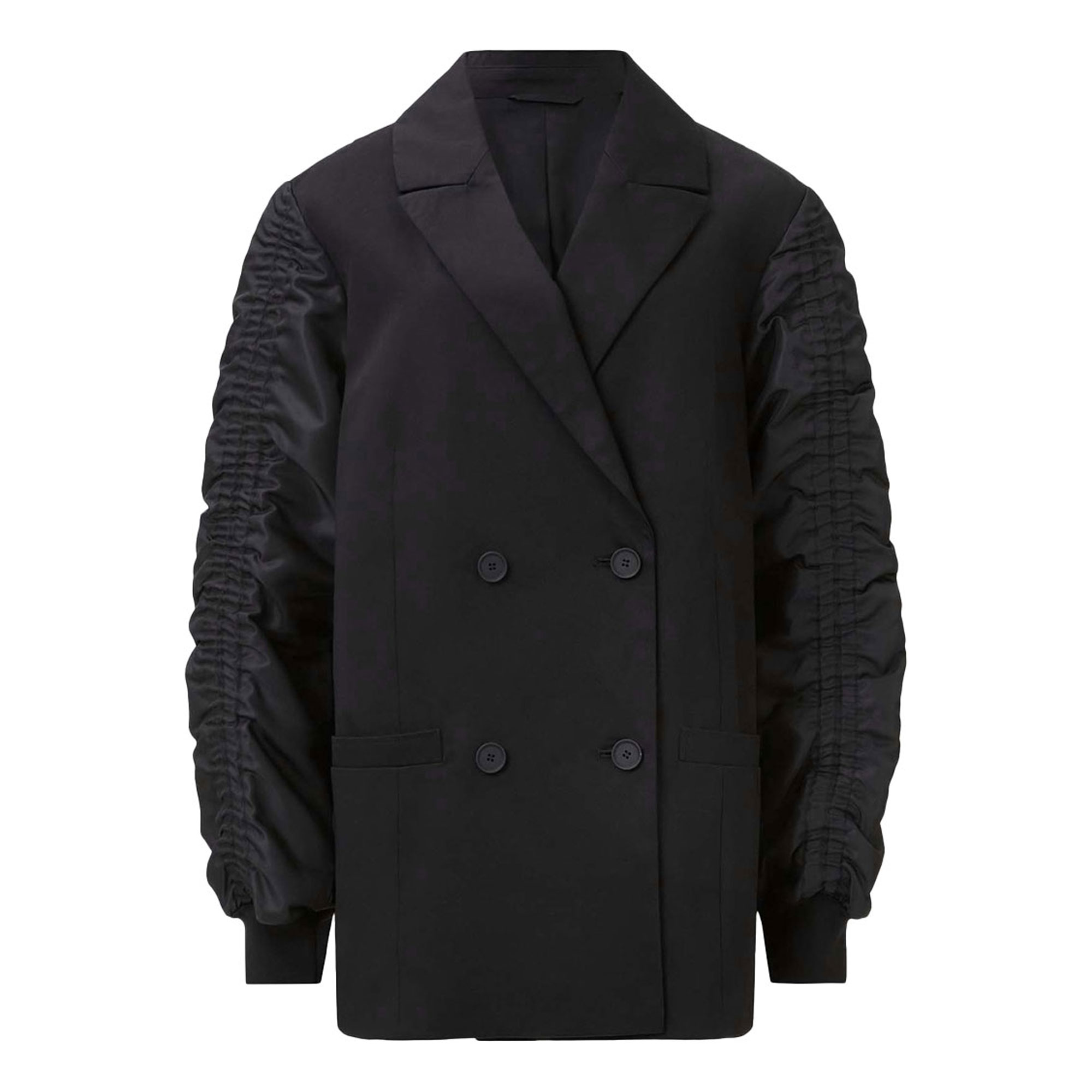 • Blazer/bomber hybrid, double-breasted blazer body, gathered bomber style sleeves, stand collar, front button placket, ruffle through body, elasticated cuff with flared cuff