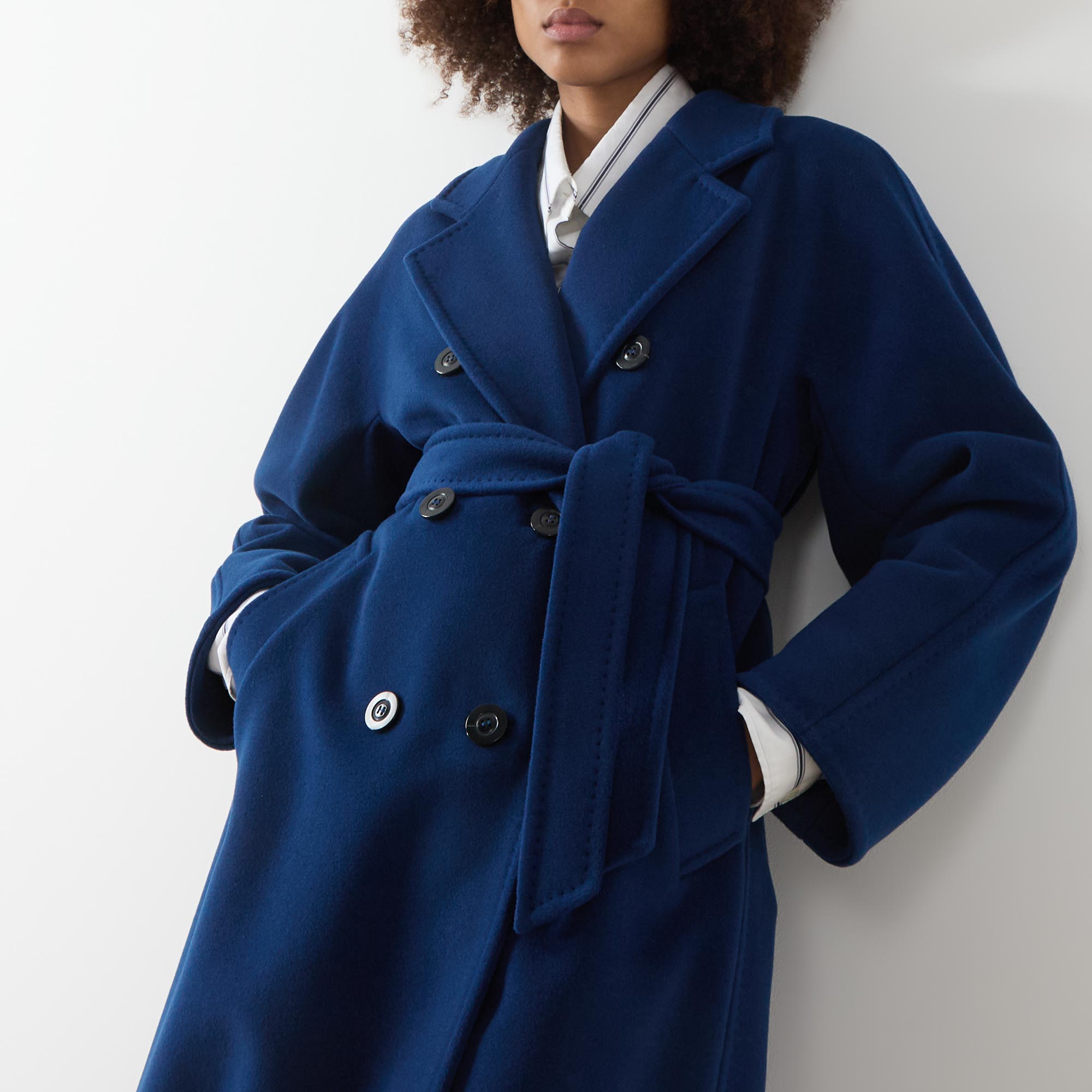 - Notched lapels, double-breasted, button fastening, self-tie belt, belt loops, side entry pockets