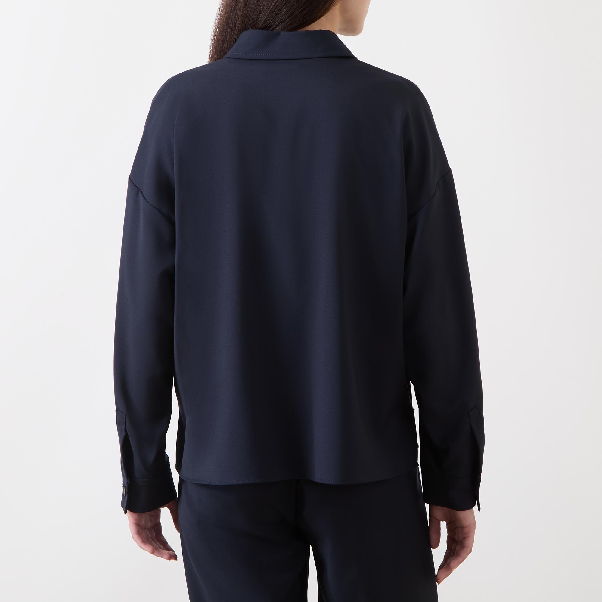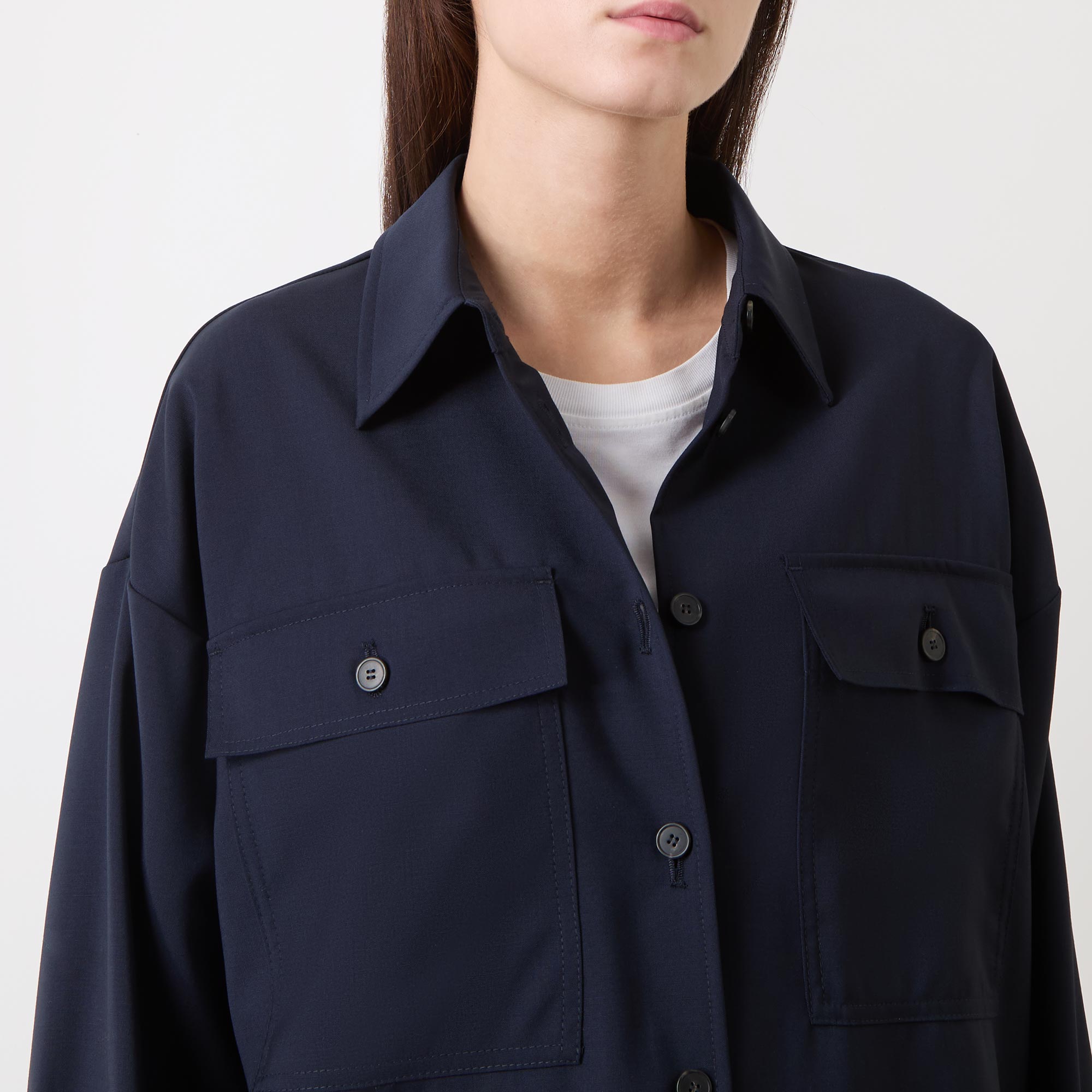 - Point collar, dropped shoulders, long sleeves, buttoned cuffs, front placket, two chest flap pockets with button fastenings, straight hem, tonal stitching